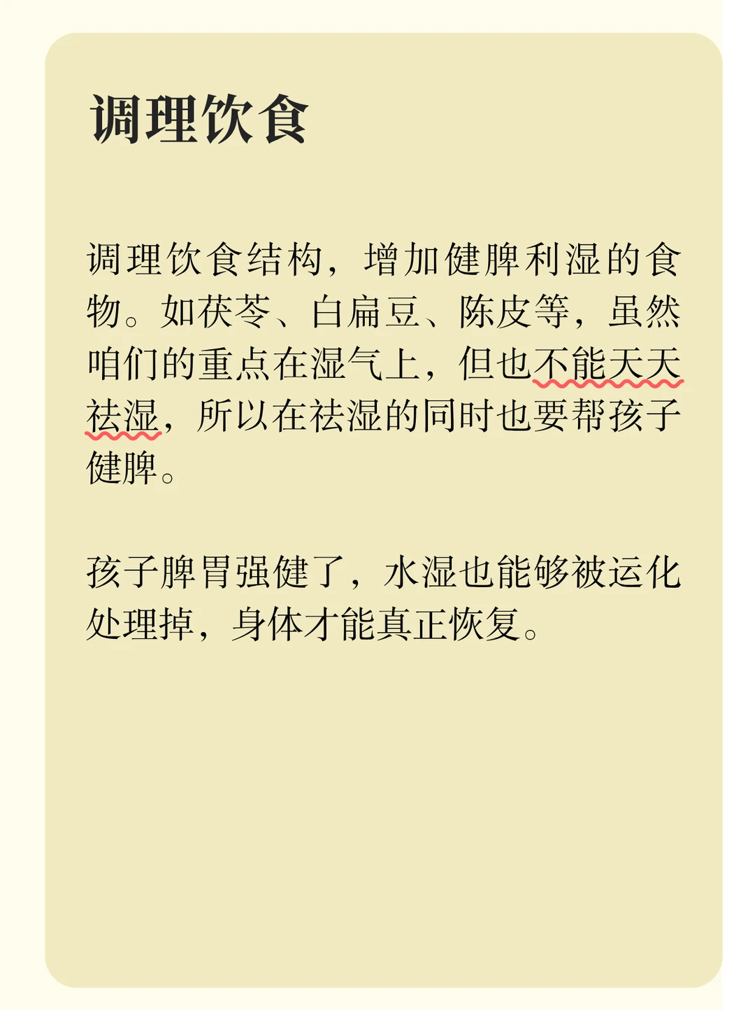第[一R],调理饮食结构,增加健脾利湿的食物。如茯苓、白扁豆、陈皮等,虽然咱们的重点在湿气上,但也不能天天祛湿,所以在祛湿的同时也要帮孩子健脾。孩子脾胃强健了,水湿也能够被运化处理掉,身体才能真正恢复。