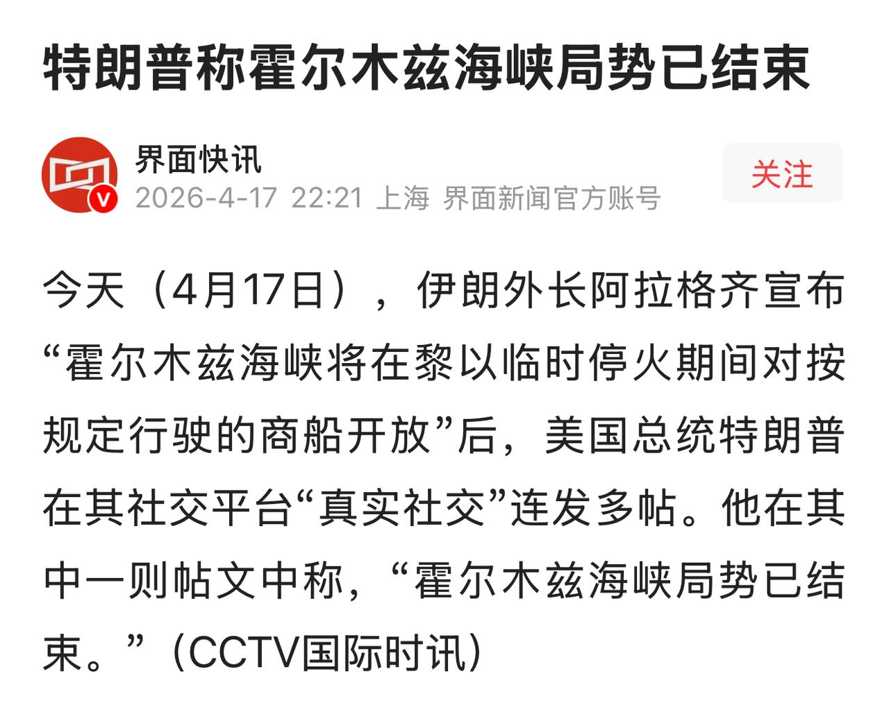 伊朗宣布开放霍尔木兹海峡,特朗普随即宣称“局势已结束”,这并非冲突的终结,而是美伊博弈进入新阶段的信号。 伊朗此举并非示弱,而是在承受军事打击和经济封锁双重压力下的战略止损。通过开放海峡,伊朗旨在缓解国内经济燃眉之急,并分化阿拉伯国家与美以的联盟,为谈判争取筹码。 特朗普的回应则充满矛盾:一方面感谢伊朗,另一方面强调对伊海上封锁将持续至“交易完成”。这暴露了美方“不见兔子不撒鹰”的极限施压策略,意在将优势保持到谈判最后一刻。 因此,所谓的“局势结束”实为从热战转向以谈判桌为核心的激烈博弈。和平前景依然脆弱,取决于双方能否在互不信任中达成妥协。