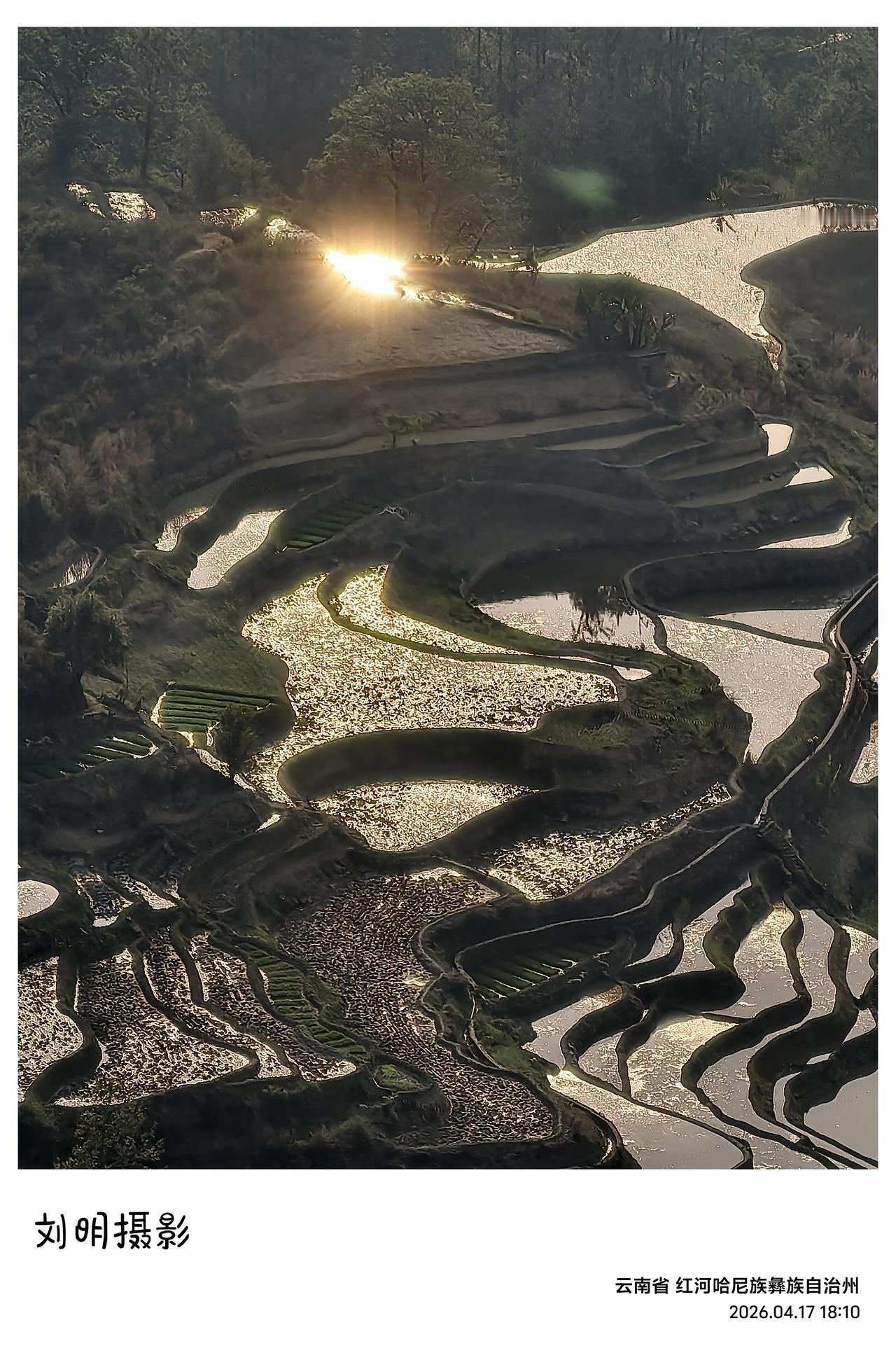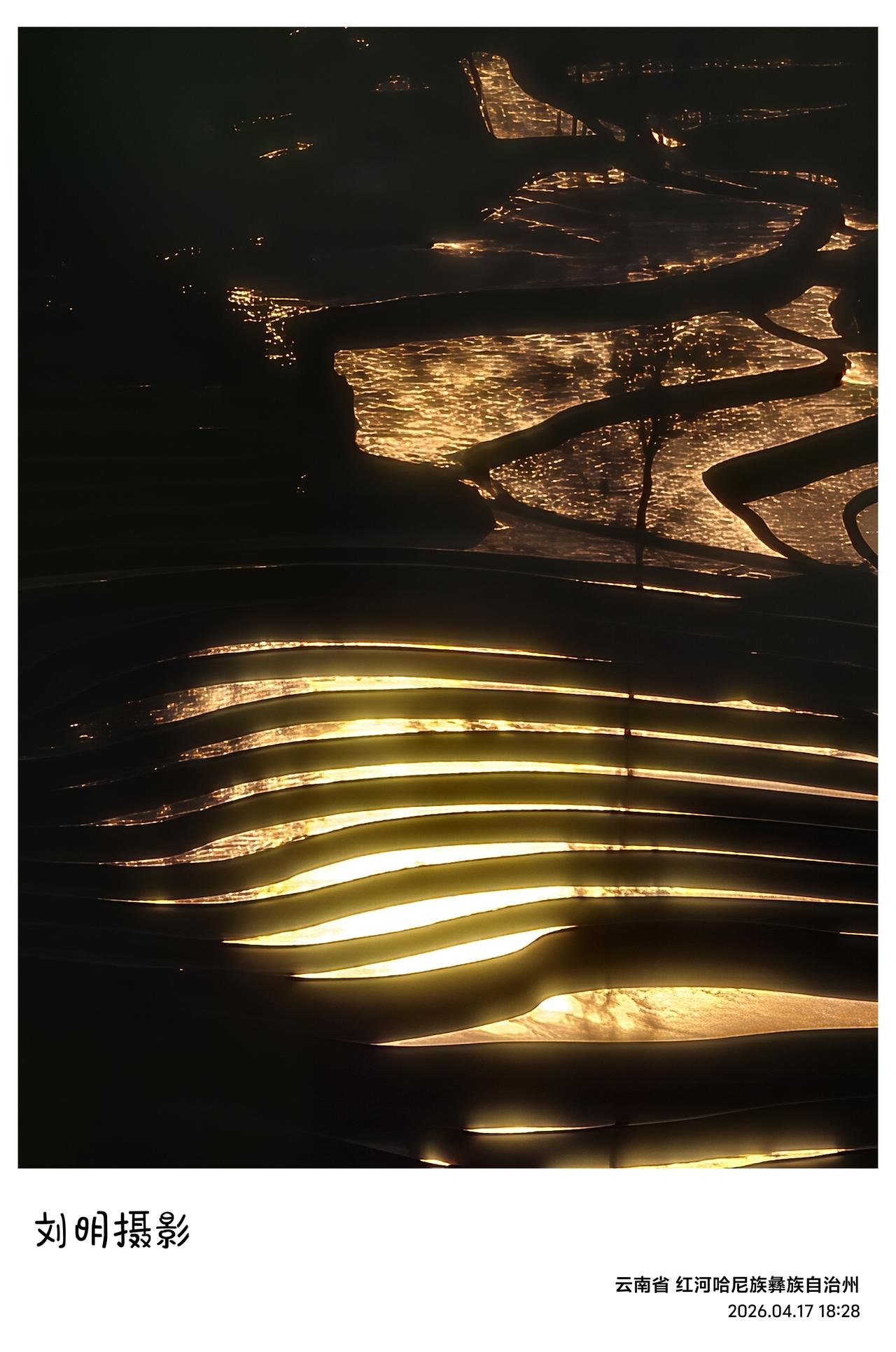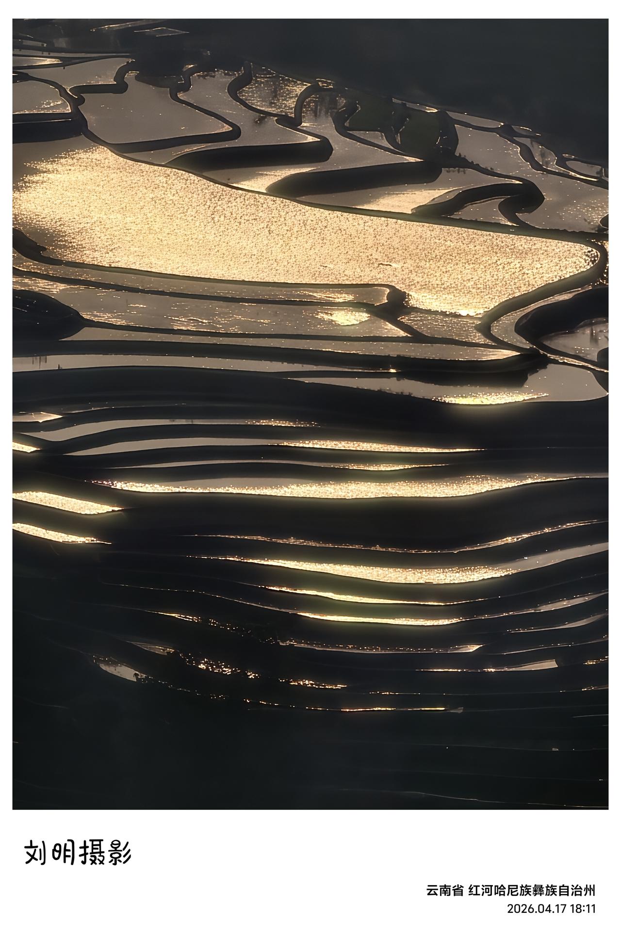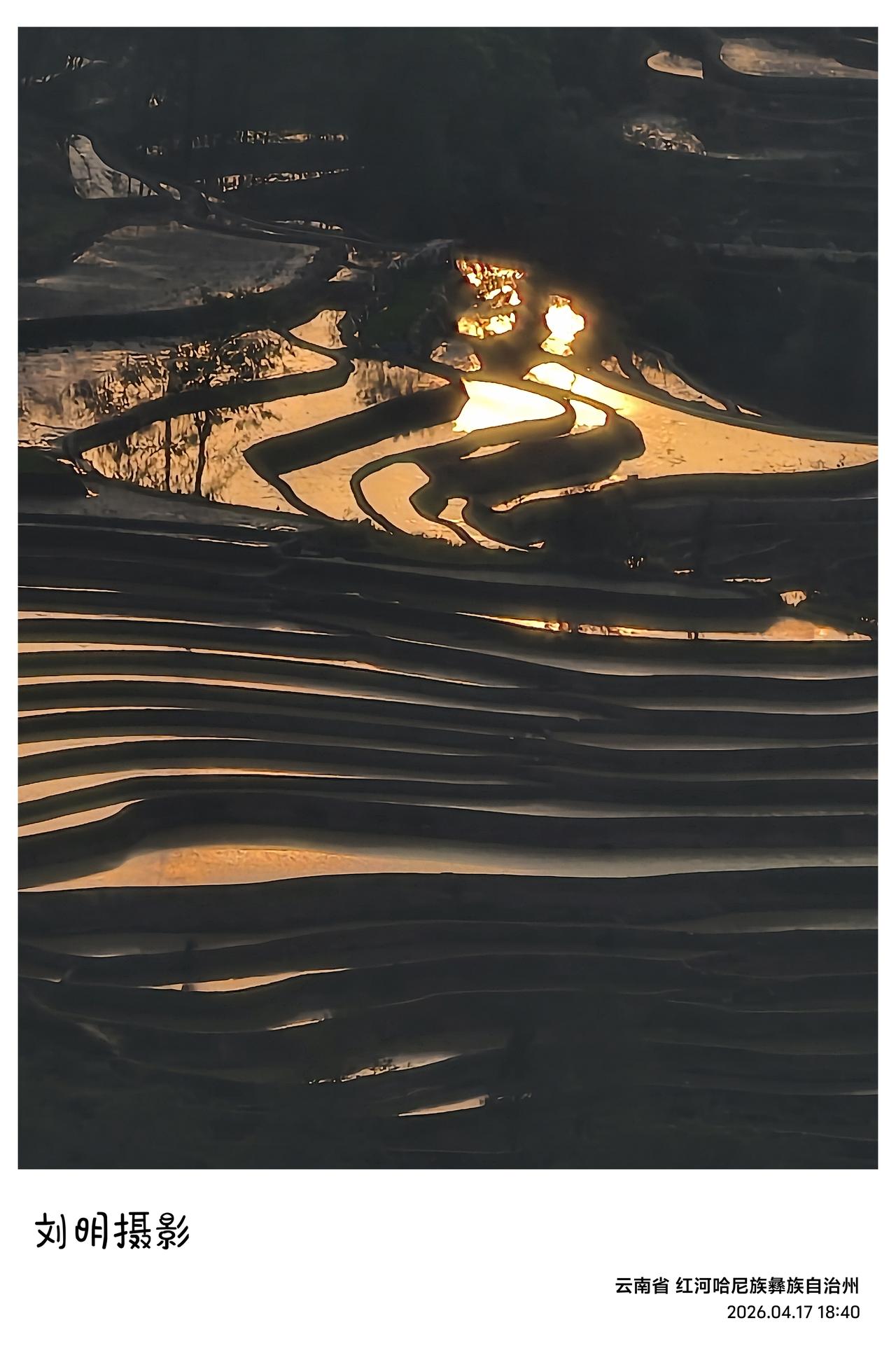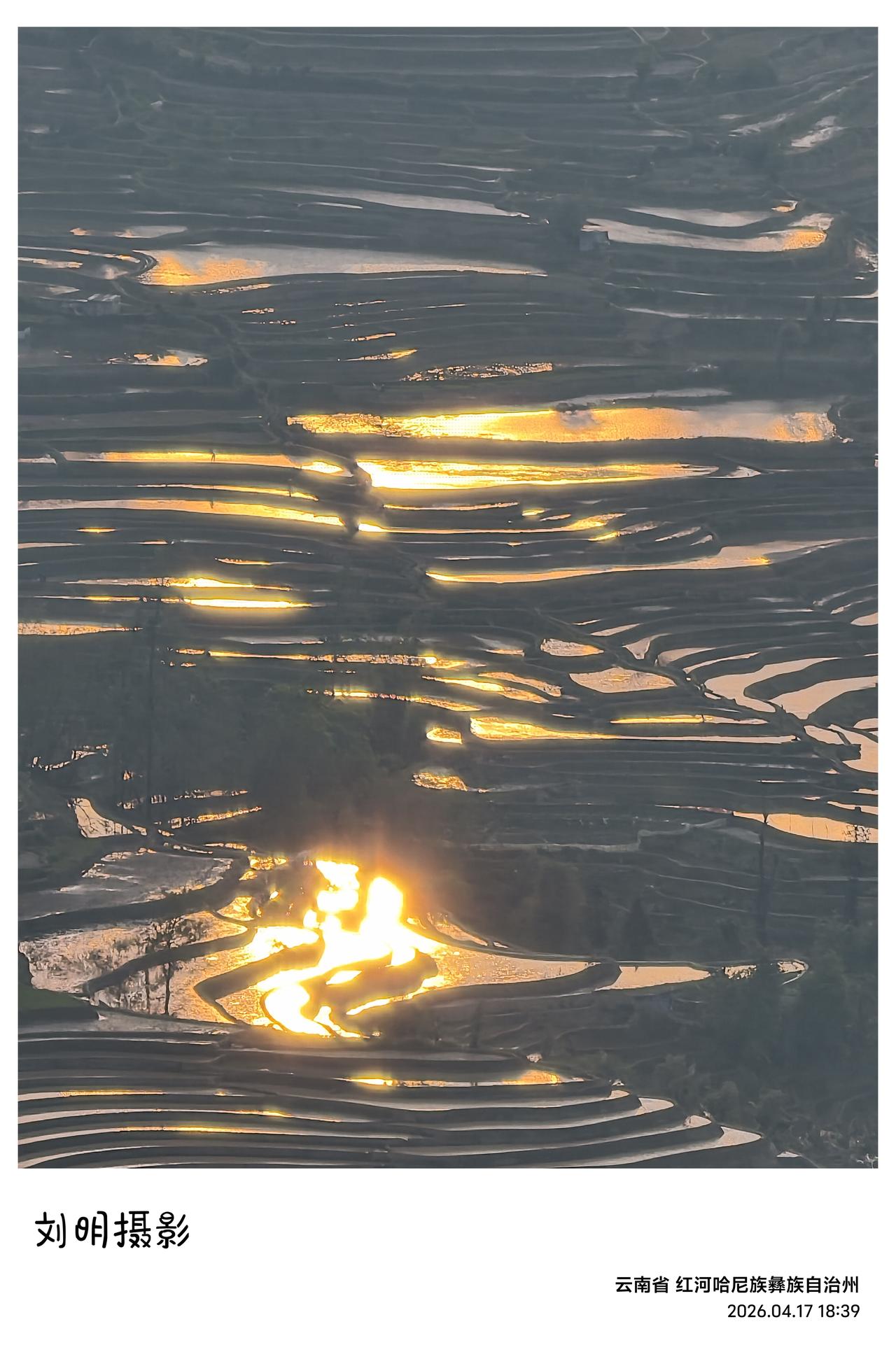 今天到云南建水县逛了大半天,下午五点半,我们开车到了元阳坝达梯田。这时候的光线最是刚刚好,不刺眼,却透着股把万物染亮的劲儿。 据当地的文友说,坝达梯田就是红河哈尼梯田的核心,世界文化遗产的一块重地。春天头一茬的水刚引上来,田埂都修得平整圆滑,泥色清亮。千百块梯田顺着山势蜿蜒,此刻水面满得快要溢出来,一平如镜,把漫天的云影都沉在了底下。 传闻坝达的日落是一绝,今天到了现场,果然名不虚传。起初,夕阳是淡淡的橘红,温柔地铺在田面上。渐渐地,这颜色开始发烫,像是有人提着金壶,沿着那一道道弯弯曲曲的田埂,一层层地往下泼。光线斜切过来,每一道水纹都被描上了金边,原本沉静的水面瞬间活了,密密麻麻地闪着光。 风从山谷里吹上来,带着点泥土的腥气。水面上的金光就跟着晃荡起来,碎金四溅。定睛看时,那哪里是水,分明是千万面小镜子,在那儿争着抢着地发光,亮得人眼睛都要睁不开了。田埂间,农人弯腰的背影被拉得老长,融进了这片金色的汪洋里,安静而又磅礴。 远山的观景台上早挤满了人,南腔北调,却出奇地安静。没人高声议论,都怕扰了这天地间的大美。有人举着手机,有人端着相机,更多的人,只是静静地站着,胸口微微起伏,生怕一眨眼,这泼天的富贵就没了。 陈永新师弟看得心痒,蹲在田埂边买了几根烧苞谷。炭火烤得焦黄,剥开皮,那股焦香直往鼻子里钻。何昔云师弟咬了一口,说这苞谷甜丝丝的,热气顺着喉咙往下走,心里也跟着暖烘烘的。 我也是一边啃着苞谷,一边不时拍照。这光景,一直耗到落日彻底沉进山坳,天地间的颜色一点点暗下来,金色慢慢收进了田埂的阴影里。人群也慢慢散去,大家脚步都放得轻,像是生怕带走这里的一分一毫。我们走在人群中,可心里头,却还沉浸在那片晃悠的金光里,回味悠长。
