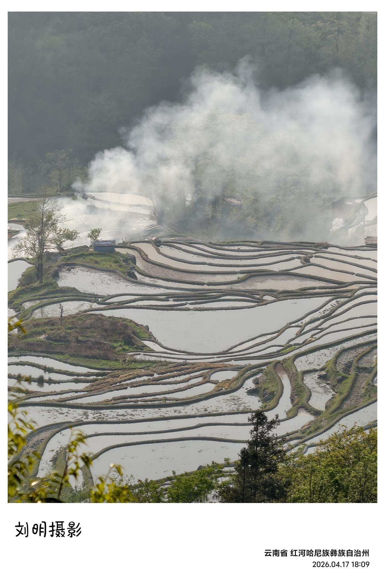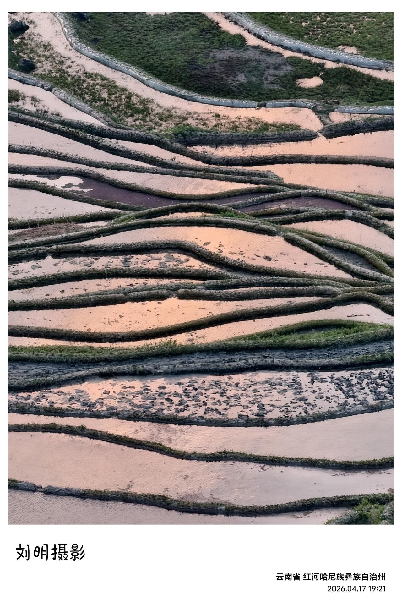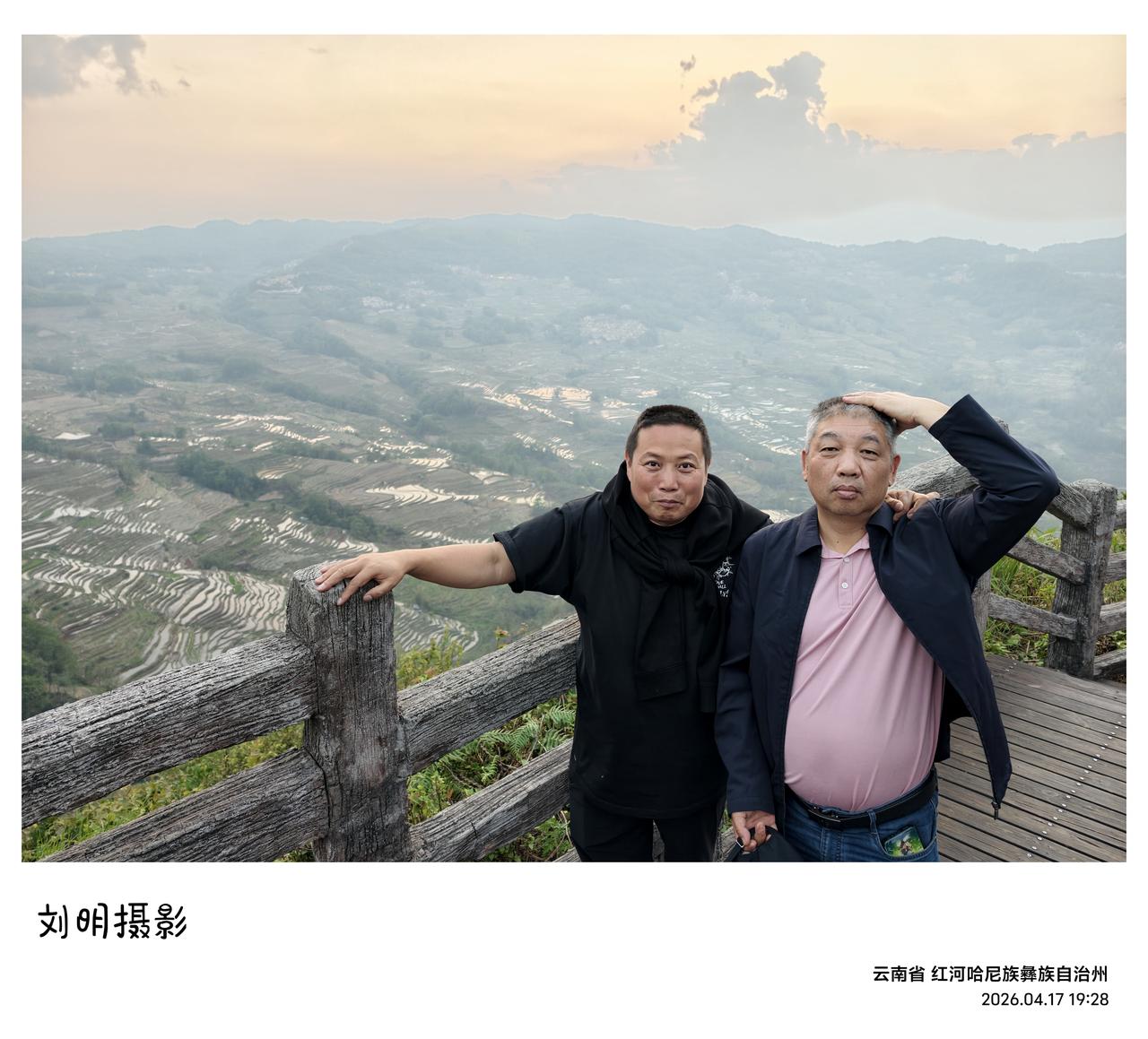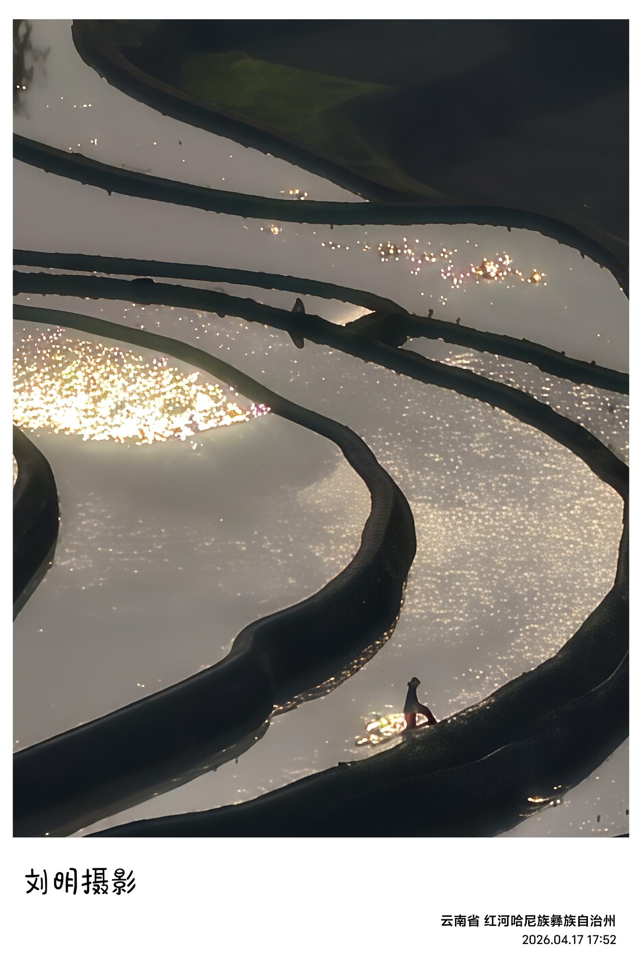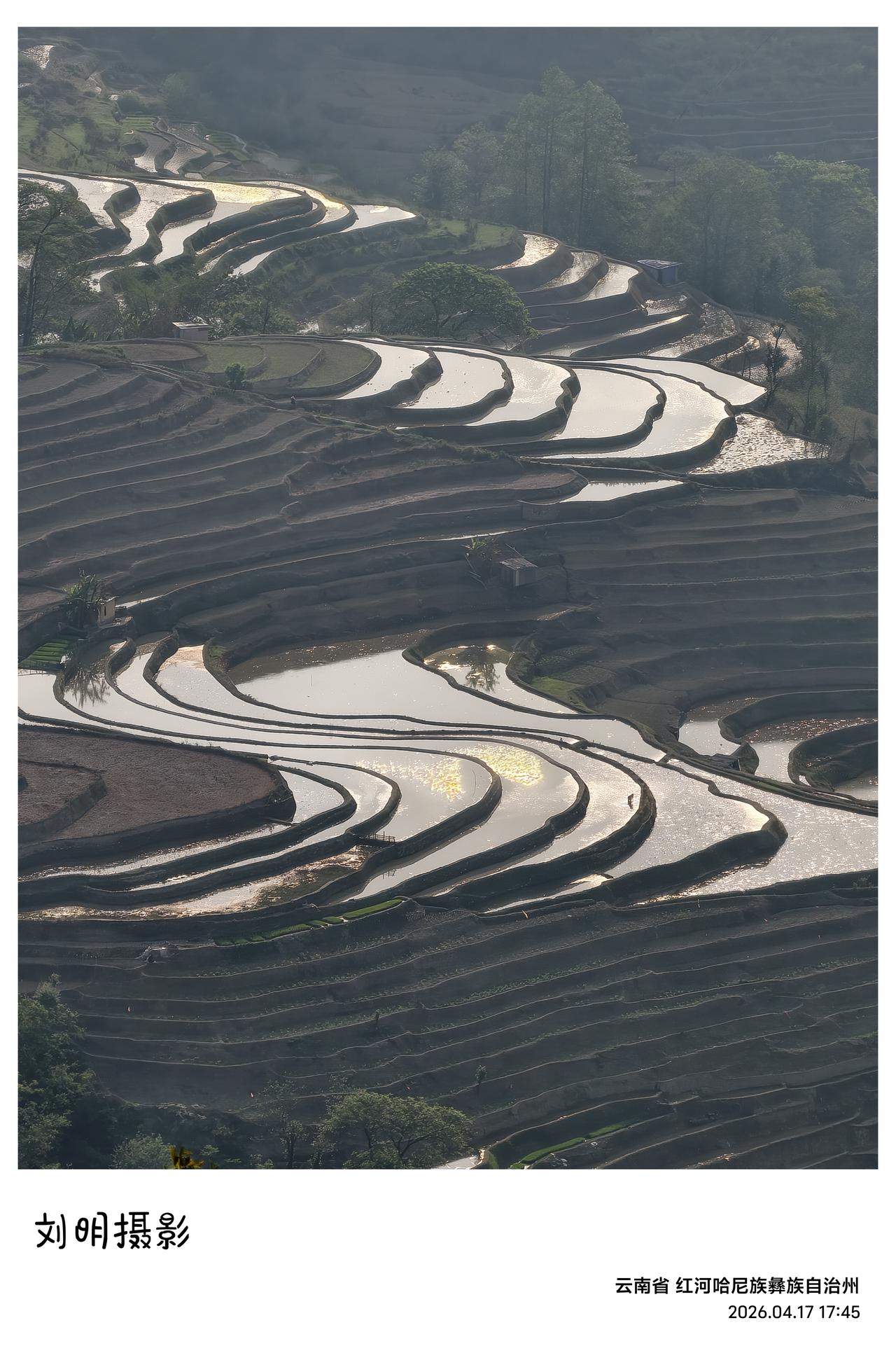 今天到云南建水县逛了大半天,下午五点半,我们开车到了元阳坝达梯田。这时候的光线最是刚刚好,不刺眼,却透着股把万物染亮的劲儿。 据当地的文友说,坝达梯田就是红河哈尼梯田的核心,世界文化遗产的一块重地。春天头一茬的水刚引上来,田埂都修得平整圆滑,泥色清亮。千百块梯田顺着山势蜿蜒,此刻水面满得快要溢出来,一平如镜,把漫天的云影都沉在了底下。 传闻坝达的日落是一绝,今天到了现场,果然名不虚传。起初,夕阳是淡淡的橘红,温柔地铺在田面上。渐渐地,这颜色开始发烫,像是有人提着金壶,沿着那一道道弯弯曲曲的田埂,一层层地往下泼。光线斜切过来,每一道水纹都被描上了金边,原本沉静的水面瞬间活了,密密麻麻地闪着光。 风从山谷里吹上来,带着点泥土的腥气。水面上的金光就跟着晃荡起来,碎金四溅。定睛看时,那哪里是水,分明是千万面小镜子,在那儿争着抢着地发光,亮得人眼睛都要睁不开了。田埂间,农人弯腰的背影被拉得老长,融进了这片金色的汪洋里,安静而又磅礴。 远山的观景台上早挤满了人,南腔北调,却出奇地安静。没人高声议论,都怕扰了这天地间的大美。有人举着手机,有人端着相机,更多的人,只是静静地站着,胸口微微起伏,生怕一眨眼,这泼天的富贵就没了。 陈永新师弟看得心痒,蹲在田埂边买了几根烧苞谷。炭火烤得焦黄,剥开皮,那股焦香直往鼻子里钻。何昔云师弟咬了一口,说这苞谷甜丝丝的,热气顺着喉咙往下走,心里也跟着暖烘烘的。 我也是一边啃着苞谷,一边不时拍照。这光景,一直耗到落日彻底沉进山坳,天地间的颜色一点点暗下来,金色慢慢收进了田埂的阴影里。人群也慢慢散去,大家脚步都放得轻,像是生怕带走这里的一分一毫。我们走在人群中,可心里头,却还沉浸在那片晃悠的金光里,回味悠长。