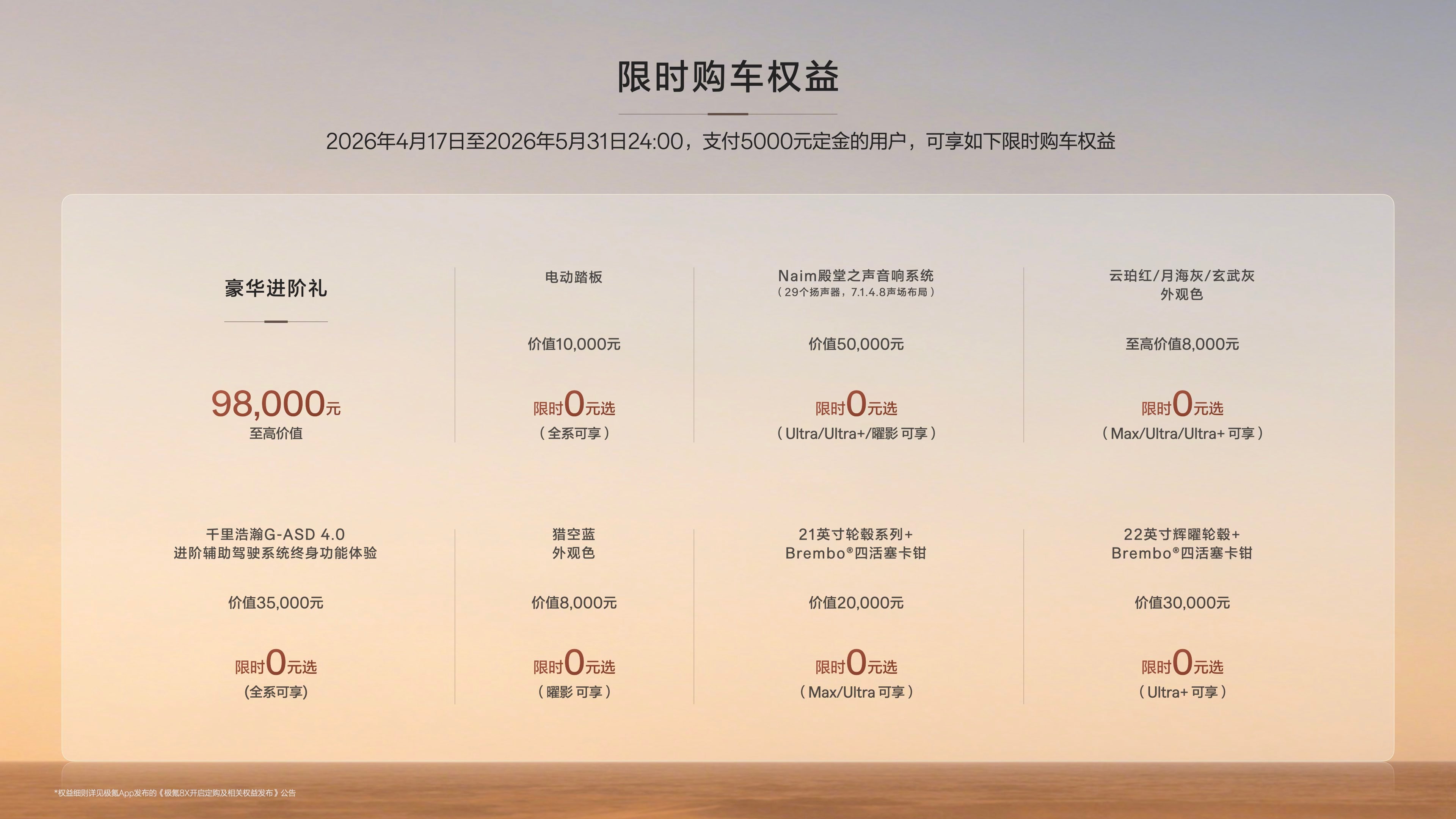 新车划重点4月17日,极氪8X正式上市。极氪8X共推出Max版、Ultra版及Ultra+版三个版型,零售价分别为35.68万元起、37.68万元起、42.68万元起;权益后限时售价32.98万元起、34.98万元起、39.98万元起。极氪8X曜影于当日同步上市,零售价50.08万元起,权益后限时售价47.38万元。新车划重点极氪8X29分钟大定破万