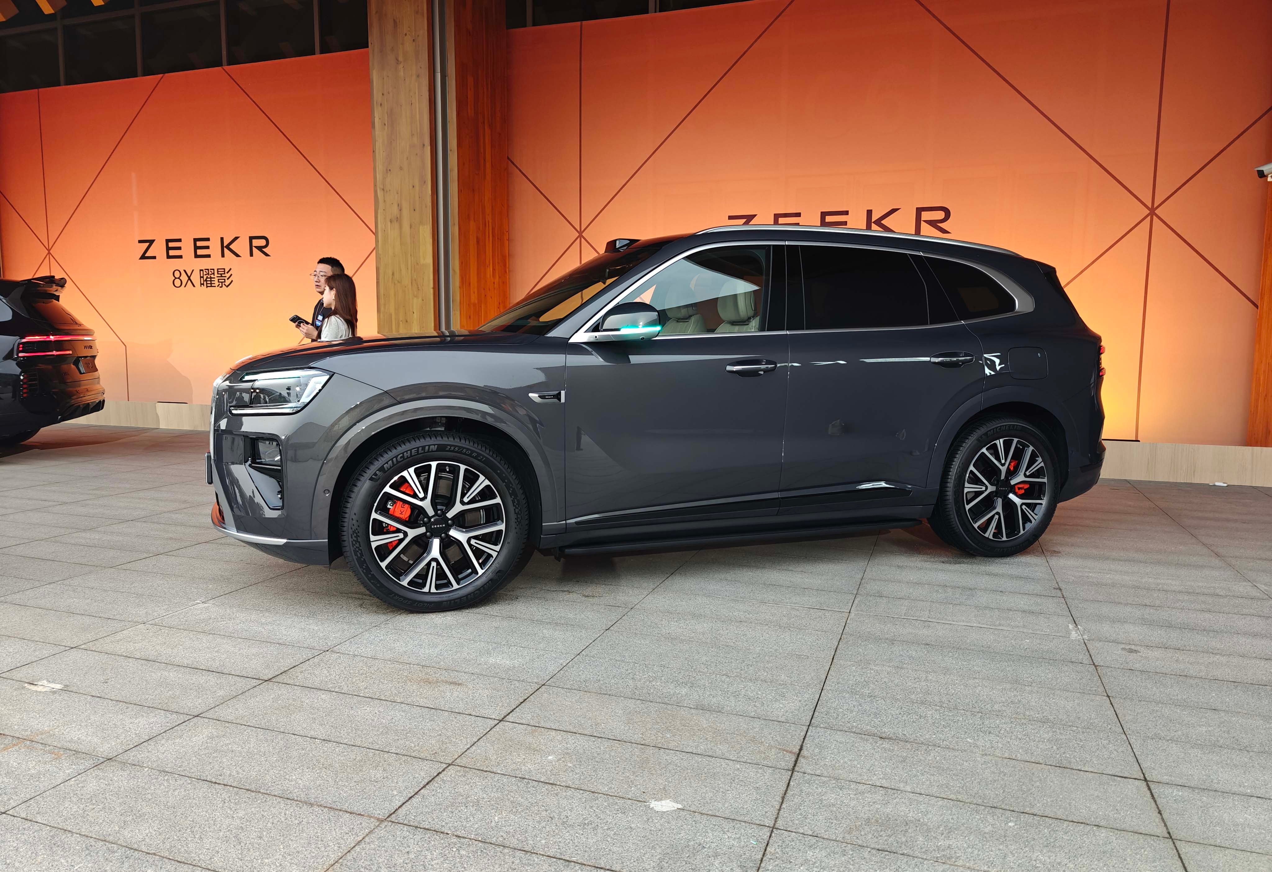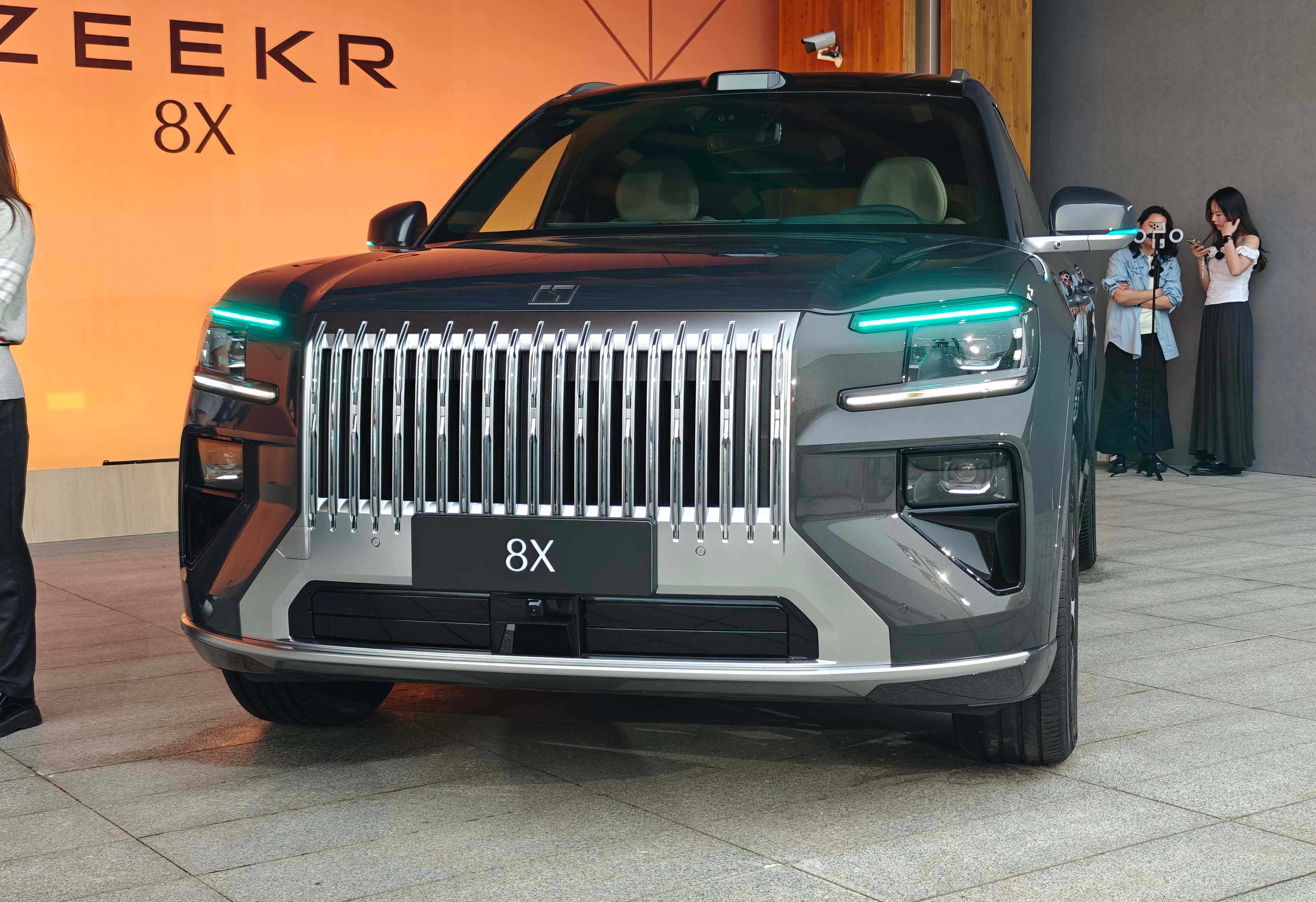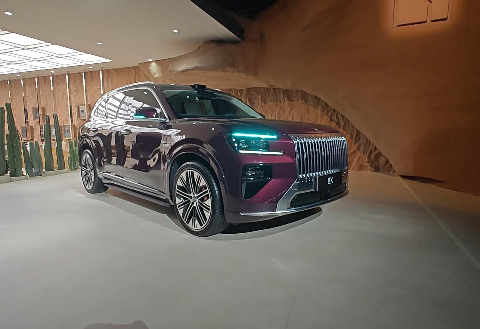 1、【极氪9X同风格设计外观】极氪8和早先推出的极氪9X有着很高的相似度,同样定位于中大型的豪华SUV。外观整体方正大气,看上去很有气势。高耸的车头配合大面积镀铬的直瀑式前格栅,精致中透露了霸气,甚至能感觉到劳斯莱斯的既视感。