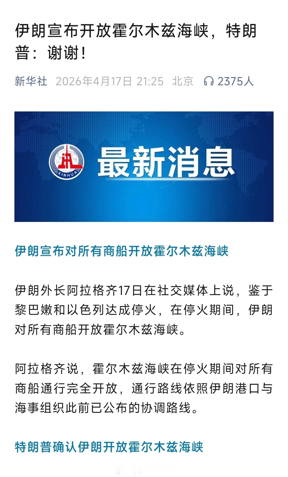 来去之间。伊朗宣布开放霍尔木兹海峡,特朗普:谢谢!
