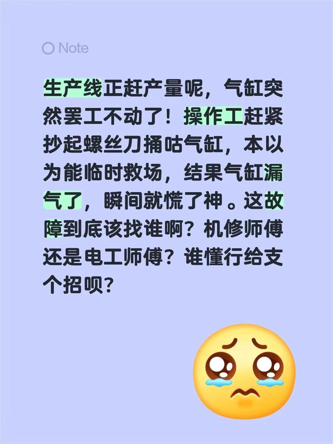 生产线正赶产量呢,气缸突然罢工不动了!操作工赶紧抄起螺丝刀捅咕气缸,本以为能临时救场,结果气缸漏气了,瞬间就慌了神。这故障到底该找谁啊?机修师傅还是电工师傅?谁懂行给支个招呗?