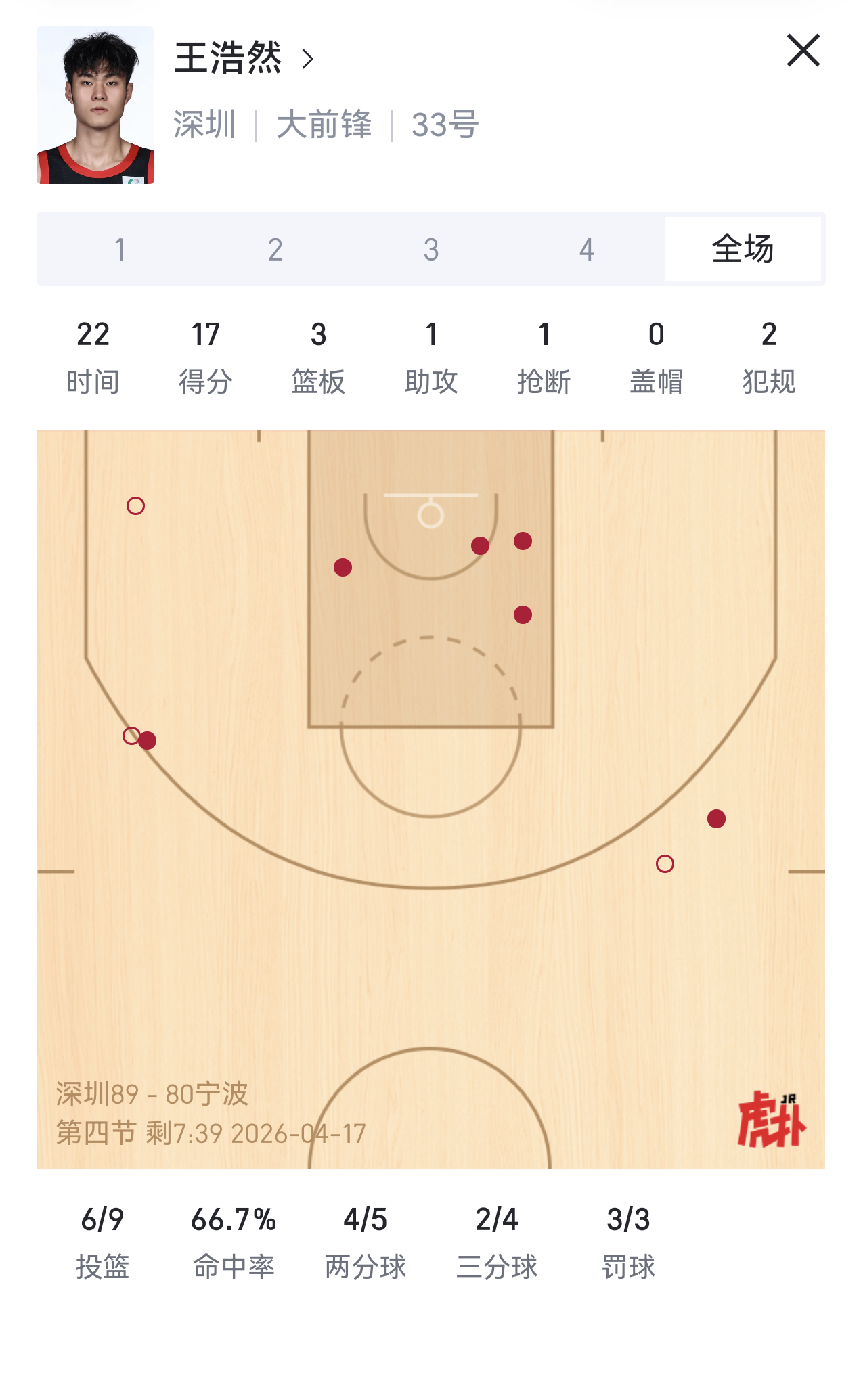 终于看到王浩然打了一个挡拆,等了一赛季了。虽然算无意的,但是临场有感觉了就好深圳男篮vs宁波男篮