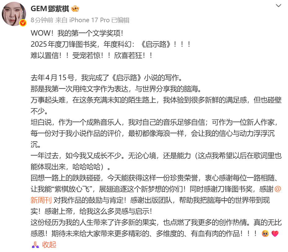 邓紫棋小说获奖了邓紫棋小说获2025年度刀锋图书奖 哇邓紫棋小说获奖了,她写的《启示路》获得2025年度刀锋图书奖年度科幻,恭喜姐姐~