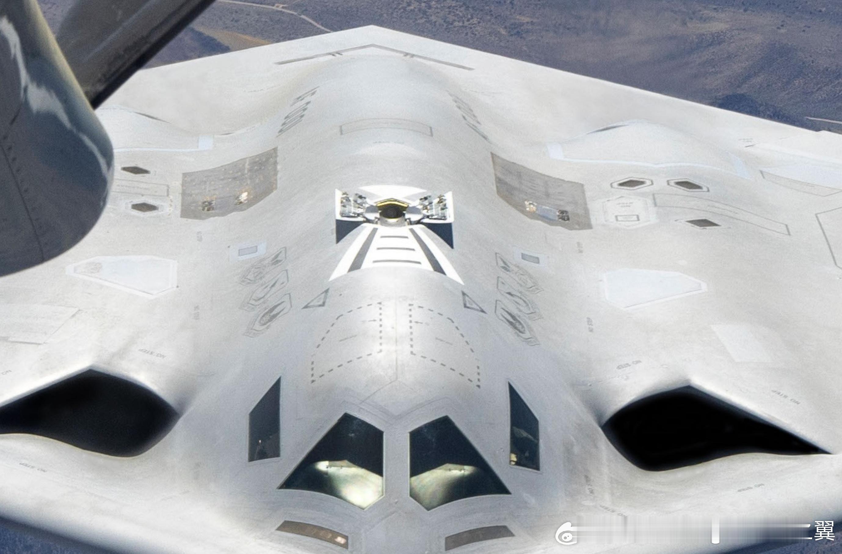B-21的喷管后方及上表面并没有像B-2那样大面积铺设显眼的隔热瓦/耐热衬垫。可能是B-21独特的深度埋入式进气道和高涵道比发动机,能够更有效地将核心高温废气与大量的冷旁通气流在喷出前就完成预冷。由于排气温度已经降到了临界值以下,机体后部的热压力大幅减轻。