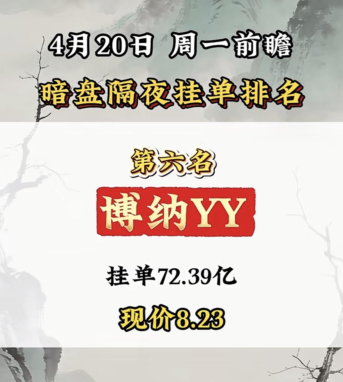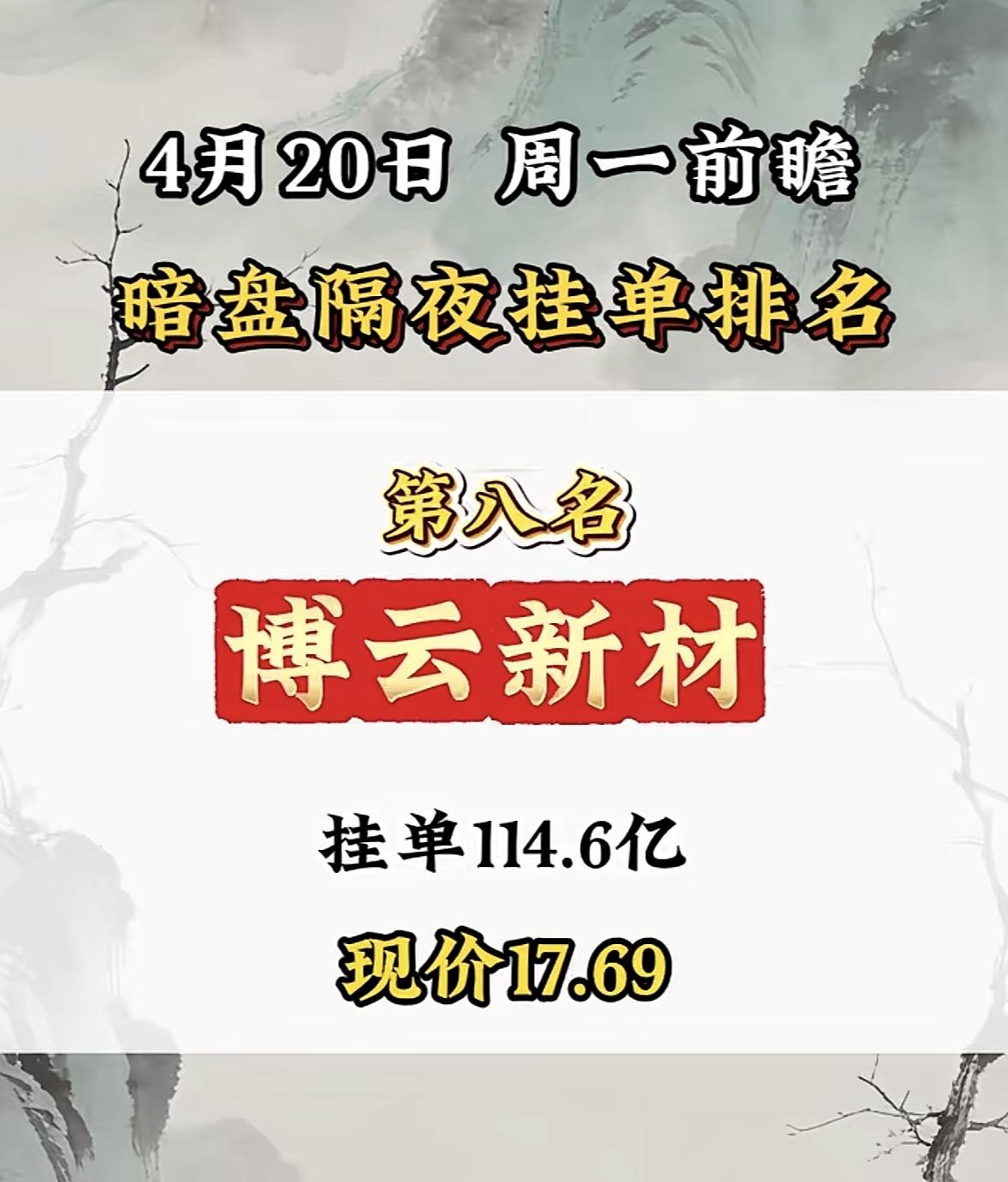 4月20日周一暗盘隔夜挂单排行榜出炉 4月20日博云新材这情况有点猛啊!挂单排第八,现价17.69元,暗盘隔夜挂单达114.6亿。这票已经连收5个涨停板了,截至9:37,成交金额18.41亿元,涨停板封单金额2.11亿元,连续涨停期间累计上涨61.11%。 4月15日它还发布了股价异动公告,此前三个交易日收盘价格涨幅偏离值累计超20%。两融数据上,4月16日融资余额环比增长36.67%。龙虎榜显示机构净卖出,营业部席位净买入。而且股东户数持续下降,筹码在集中。2025年公司营收和净利润都大幅增长,这票未来走向值得关注!