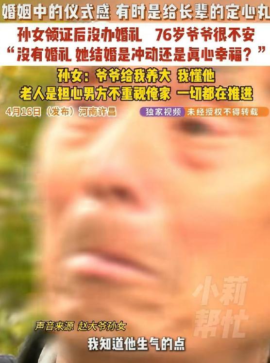 太心酸!河南禹州,20岁孙女偷偷领了结婚证,没办婚礼,没通知家人,76岁的爷爷从别人嘴里知道后,当场落了泪。他不是怪孩子,是怕:“我都没见过男方,没有婚礼没有仪式,她结婚是冲动还是真心幸福?她爸妈不管她,从小我给她养大到18岁,我害怕她以后受委屈。” 邻里随口说道:“你家孙女真能干,年纪轻轻就结婚了,就是没办婚礼,怪可惜的。”赵大爷愣了几秒,以为自己听错了,连忙追问,直到对方重复了一遍,说看到他孙女和一个陌生男孩拿着结婚证路过,他才彻底慌了神。 那一刻,他手里的水果糖掉在地上,滚到了路边的草丛里,就像他此刻慌乱不安的心,再也无法平静。他没有愤怒,没有指责,只是一个人蹲在地上,双手捂住脸,肩膀不住地颤抖,泪水从指缝间渗出,嘴里反复念叨着:“怎么不告诉我,怎么能不告诉我……” 熟悉赵大爷的人都知道,他这辈子最放不下的,就是这个从小跟着他长大的孙女。孙女出生没多久,儿子儿媳就常年在外打工,常年缺席孩子的成长,把嗷嗷待哺的小丫头丢给了当时已经56岁的赵大爷。 从此,赵大爷又当爹又当妈,靠着几亩薄田和打零工的收入,一手把孙女拉扯长大,从蹒跚学步、咿呀学语,到上学读书、长大成人,每一步都浸透着他的心血。 可他怎么也没想到,孙女刚满20岁,就偷偷做了决定——和一个他从未见过的男孩领了结婚证。没有婚纱,没有戒指,没有热闹的婚礼,没有亲友的祝福,甚至连他这个一手把她养大的爷爷,都是最后一个知道的。 后来,孙女主动找爷爷认错,解释说自己和男孩是真心相爱的,不想办繁琐的婚礼,也怕爷爷不同意,所以才偷偷领了证。她以为爷爷会生气、会指责她,可赵大爷只是擦干眼泪,拉着她的手,语气里满是担忧,没有一句责备。 “我不是怪你,孩子,”赵大爷的声音带着哽咽,“我就是怕,我都没见过男方,不知道他是什么脾气,不知道他会不会真心对你好。 没有婚礼,没有仪式,你就这么嫁了,会不会被人家看不起?以后受了委屈,连个撑腰的人都没有。你爸妈不管你,我从小把你养大到18岁,我这心里,时时刻刻都在惦记着你,我害怕你以后受委屈啊。” 这番话,没有华丽的辞藻,却字字戳心,道尽了一位老人对孙女最深沉的牵挂。赵大爷还特意提起彩礼的事,他说,不是图男方家的钱,只是希望男方能把彩礼送到家里,让他看看男方的诚意,哪怕分文不取,只要能保证孙女在婆家不受罪、不作难,他就放心了。他还反复叮嘱孙女,让男方主动来家里一趟,好好说说两个人的打算,让他心里有个数。 孙女看着爷爷满头的白发和满脸的皱纹,听着爷爷语重心长的叮嘱,忍不住红了眼眶,她抱着爷爷,连连道歉,说自己太冲动了,没有考虑到爷爷的感受,还说会尽快让男方来家里见面,和爷爷好好沟通,把婚礼的事情慢慢推进。 她解释说,自己并不是不重视婚礼,只是觉得传统婚礼太过繁琐,想追求简单的幸福,却忽略了爷爷心里的牵挂——对爷爷来说,婚礼不是排场,而是对孙女婚姻的认可,是希望她能被重视、被珍惜的一份心意。 后来,在孙女的协调下,男方主动来到赵大爷家,诚恳地向老人道歉,说明了自己和孙女的感情,也承诺会好好对待孙女,尽快筹备一场简单而有意义的婚礼,不辜负老人的期盼。 赵大爷看着眼前这个懂事的年轻人,脸上的愁云渐渐散去,虽然依旧有担忧,但更多的是对孙女的祝福。他拉着男方的手,反复叮嘱,一定要好好照顾孙女,不能让她受委屈,男方连连点头,承诺会牢记老人的嘱托。 这件事被传到网上后,引发了无数网友的共鸣,有人留言说:“看哭了,爷爷的眼泪里全是爱,没有一点私心,只是单纯地怕孙女受委屈”; 也有人说:“年轻人追求极简婚礼没错,但不能忽略长辈的感受,他们要的不是排场,是一份安心”;还有人说:“隔代亲最是动人,爷爷把所有的爱都给了孙女,这份牵挂,太好哭了”。 官方信源: 河南禹州20岁女孩瞒着家人偷偷领结婚证,76岁爷爷知道后落泪——深圳新闻网