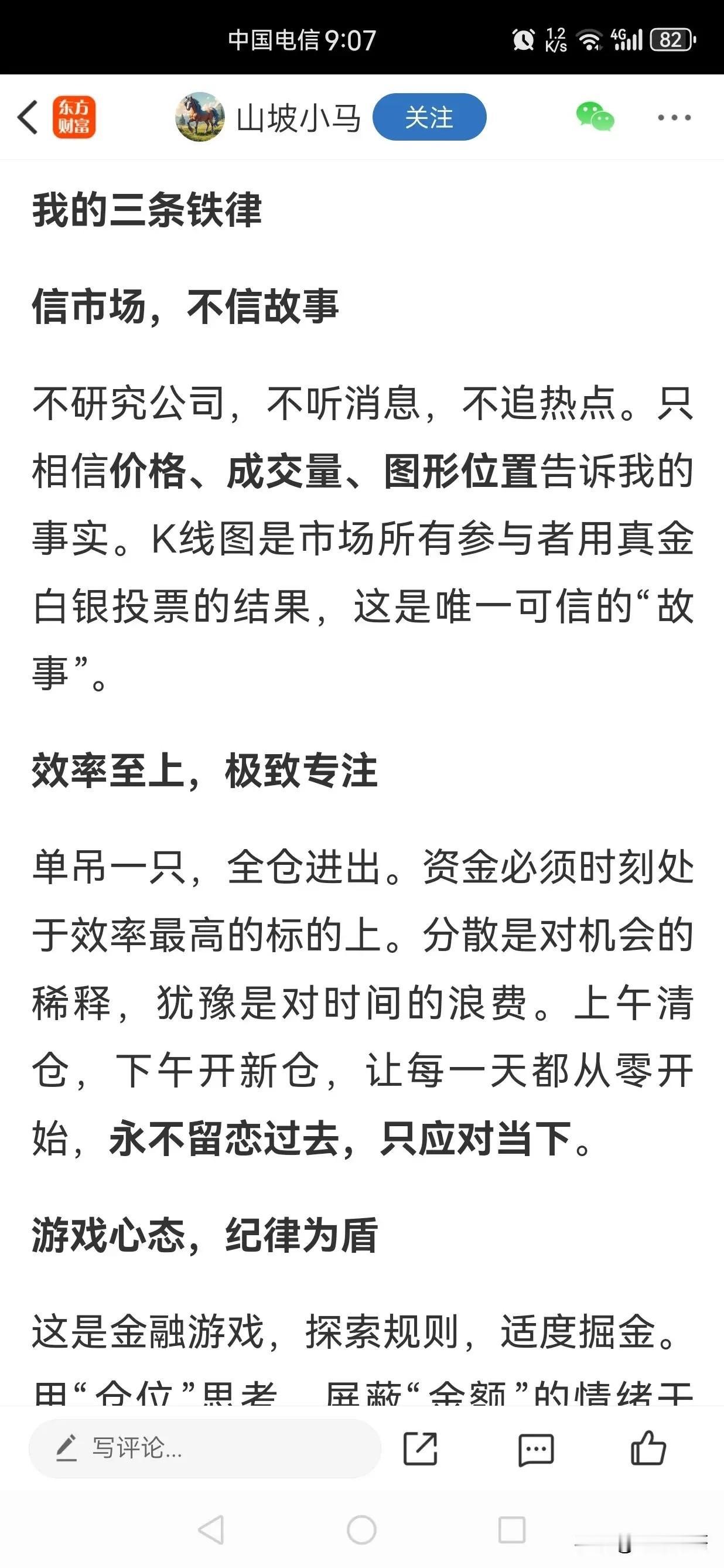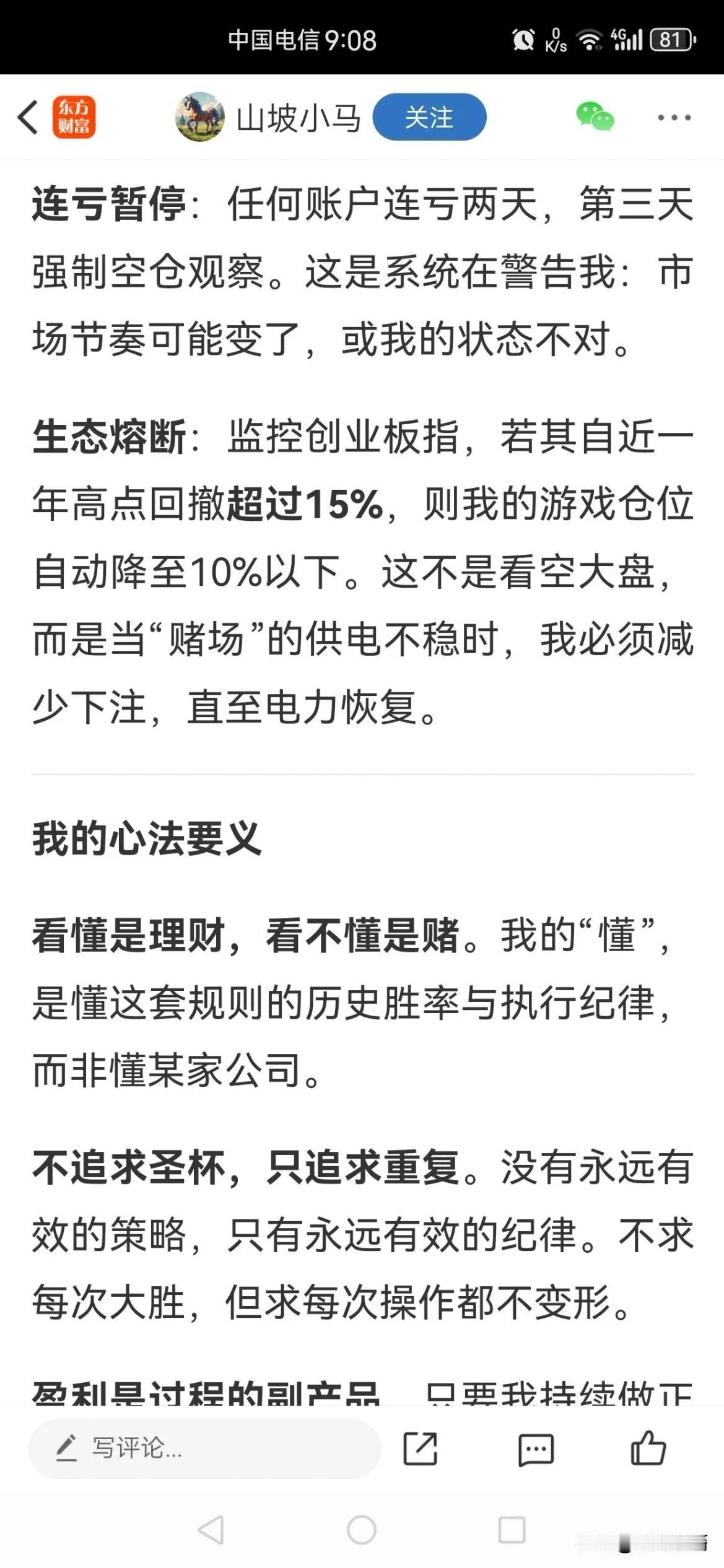 刚看到一个帖子,总体来说,还是短线博弈思维。强调技术分析这一特点,跟我的花期系统一样,其实就是技术分析鼻祖道氏理论的内容。他是赌博类,专注1支,赌赢了大赚,赌输了完蛋,容易陷入情绪化交易,更难通过所谓的规则控制人性的热点,理论上来说,参与投机次数越多,风险积累越大。不盯盘,不操作,也就没有了,按一只花蛤的说法,叫做挣钱,不叫赚钱,手停收入停。很难说,这是一种良性的投资模式。 跟我的花期系统设计底层逻辑很像,比如不预测,只应对,道氏理论的理论基础,但是方法、策略、哲学就完全不一样了。