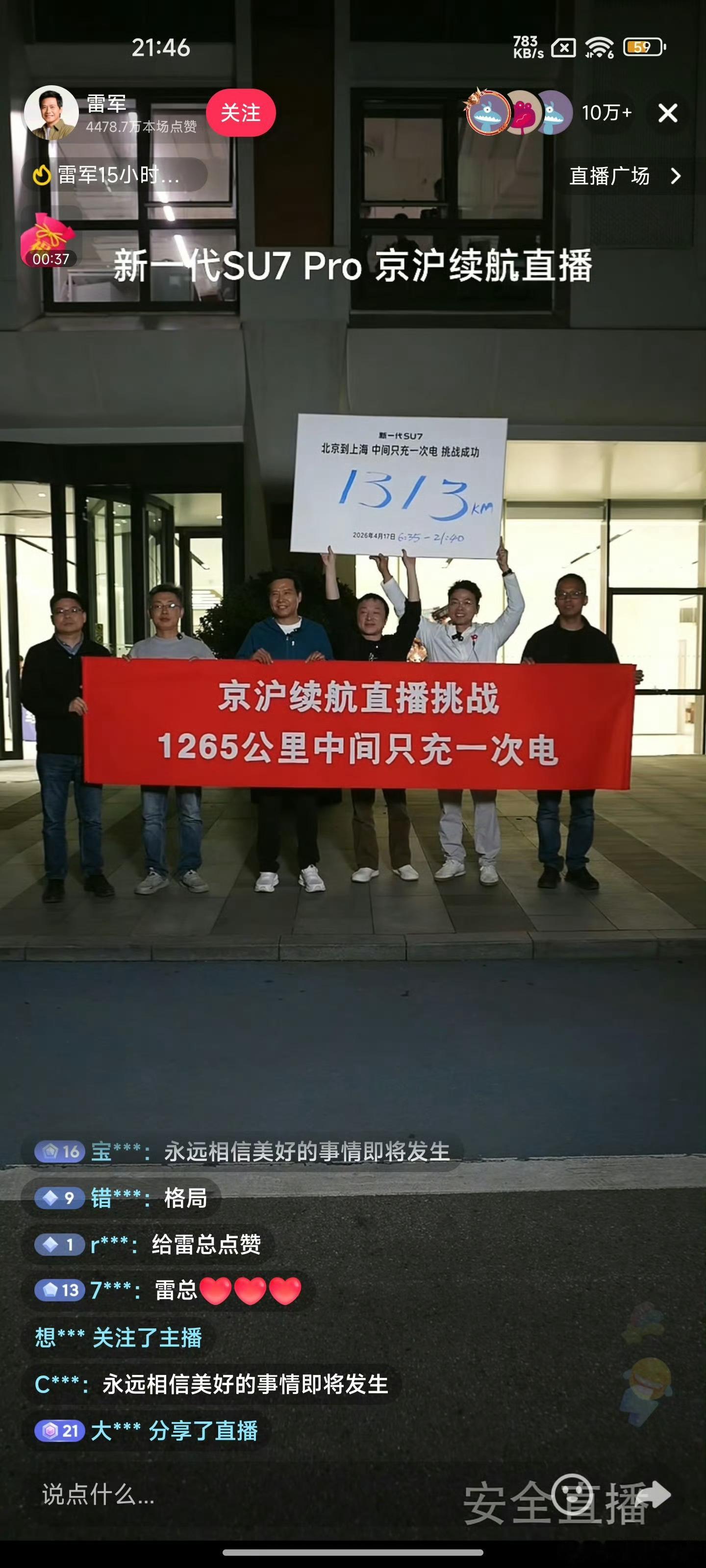 雷军京沪直播从早上6点36分开始到晚上9点40分结束,满电出发,中间只充一次电,达成目标续航1265公里的成绩,最终为1313公里,剩余电量还有3%,这个成绩在纯电车里面确实跟牛啊,为小米汽车点赞!雷军达成京沪高速只充一次电