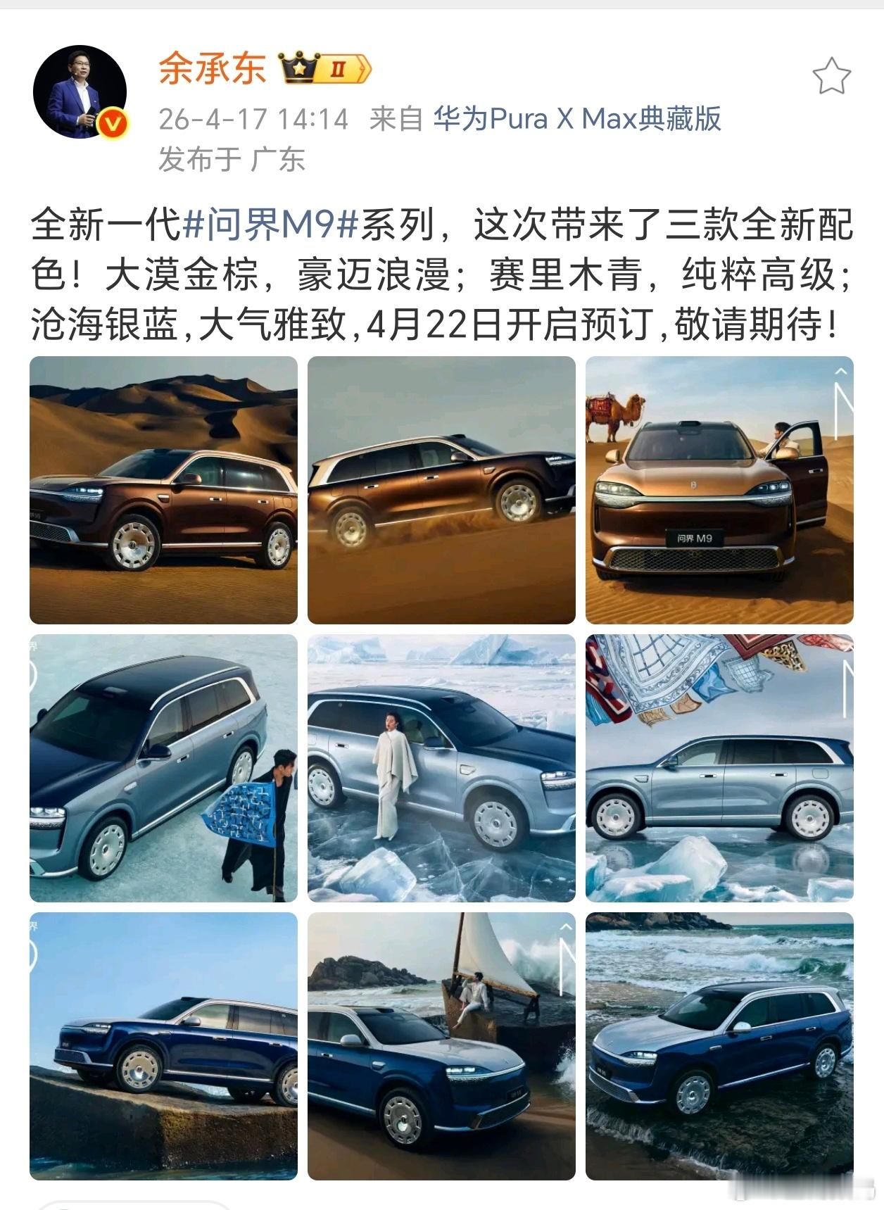 华为余承东公布全新一代问界 M9 系列三款全新配色:大漠金棕、赛里木青、沧海银蓝,4 月 22 日开启预订。