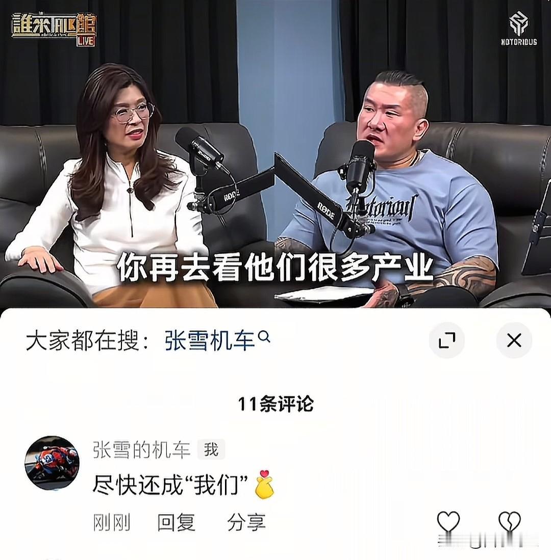 郑丽文坐客馆长直播间,馆长跟郑丽文聊天的时候,提到“包括他们那个张雪的机车”、“他们很多产业”、“他们的国产车”等等话题。 没想到张雪本人在评论区也留言:尽快换成“我们”。 其实馆长跟郑丽文聊的内容,就是在对比两岸的差异,如果都讲“我们”的话,也不合适,不符合当时的情景。 但大家都懂,张雪讲的“尽快换成我们”,意思就是希望早日统一。 我们是一家人,不应该说两家话,统一之后,就不用拿台湾跟大陆比来比去了。 因为这在大陆人眼中,本身就是无意义的,而且听着很别扭,谁会整天拿一个省份去跟祖国比来比去呢?