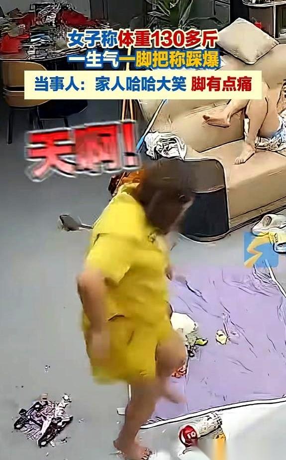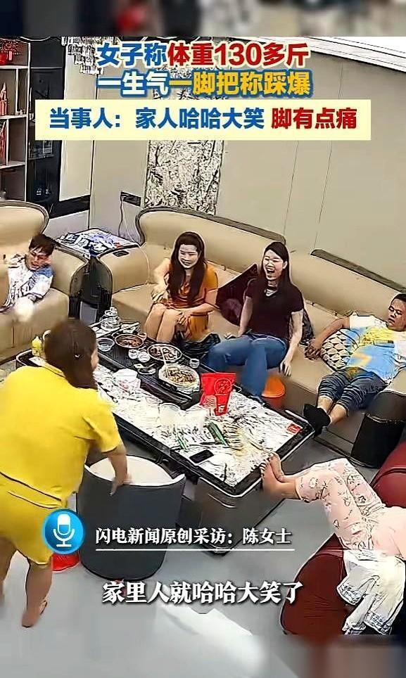 “砰!”一声脆响,广东普宁,她脚下的体重秤炸了!玻璃碎片四溅,右脚瞬间被划开一道口子,鲜血直流。 起因?秤上那个数字——130多斤。 陈女士站在秤上,盯着屏幕跳动的数字,脸色一点点沉下来。130多斤!她心里一团火,憋着一口气,猛地朝秤面跺了一脚。脚刚抬起,那秤就直接爆了! 家人笑疯了!沙发上的人东倒西歪,笑得眼泪都出来了。没人顾得上她流血的脚,反而掏出手机,对着一地狼藉和她狼狈的样子,咔嚓咔嚓一顿拍。 视频很快传开,评论区瞬间炸锅。 “这下减肥的决心是彻底拉满了!”有人笑。 “秤碎了,肉还在啊!”更多人补刀。 一个简单的数字,把人逼到踩爆秤,还成了全家笑料,这事儿到底多荒唐?