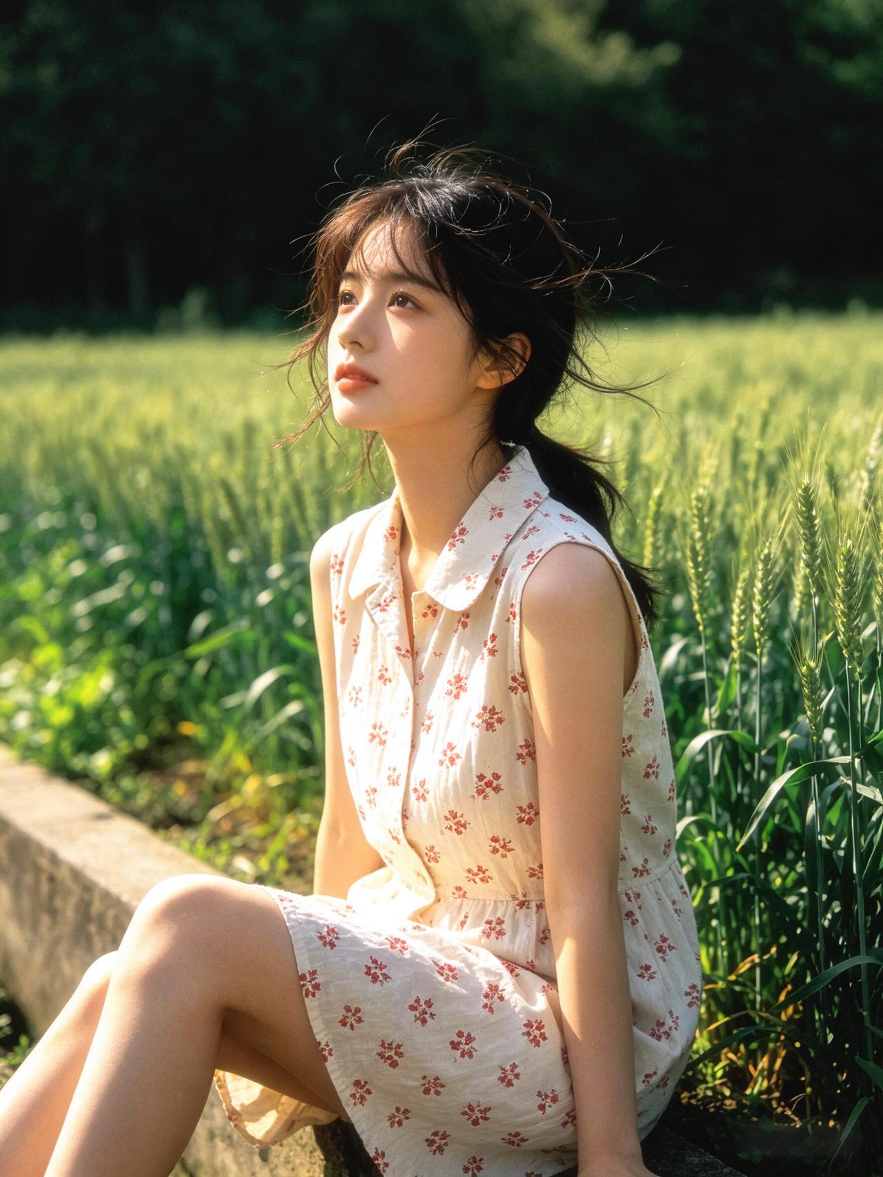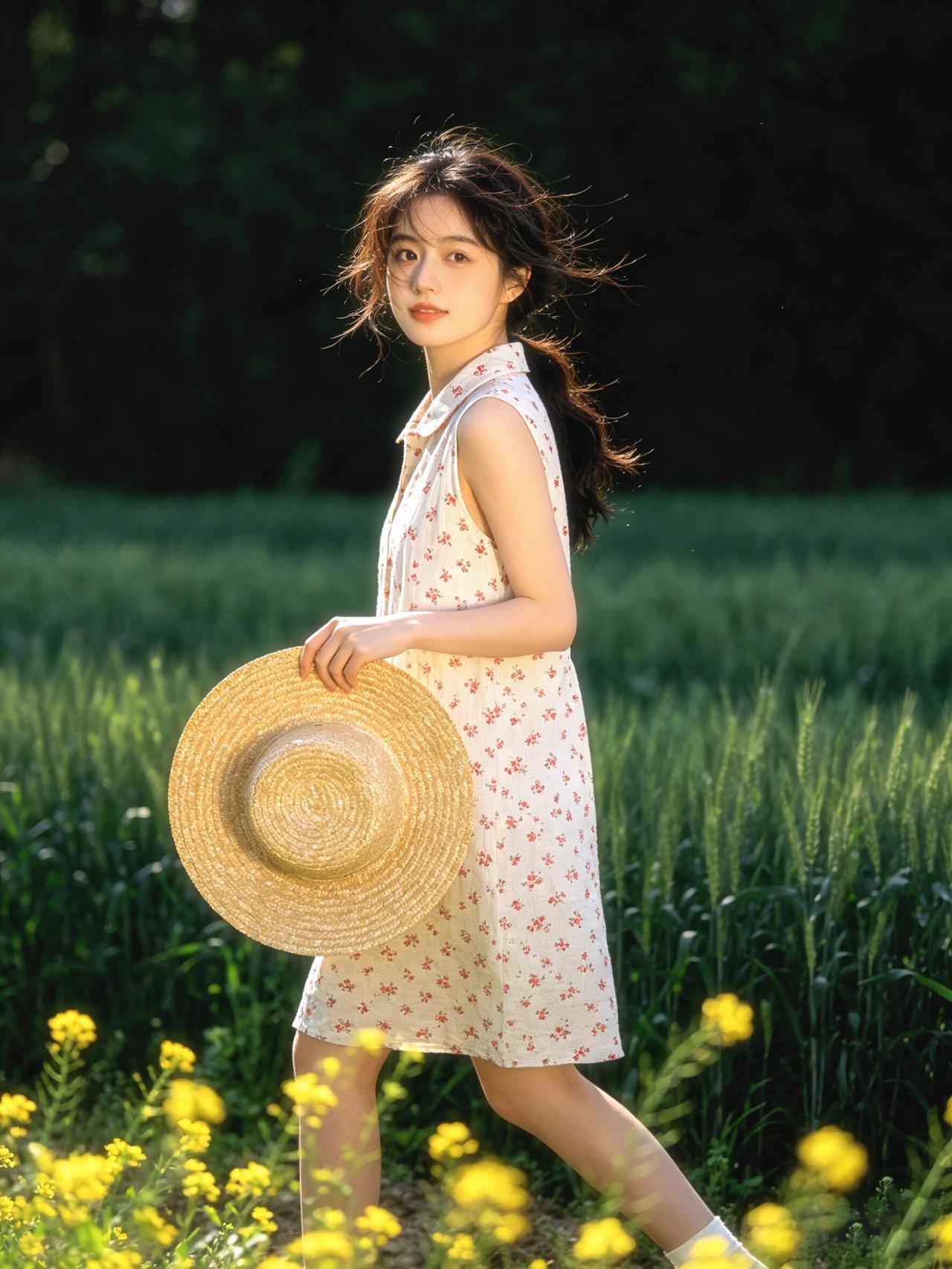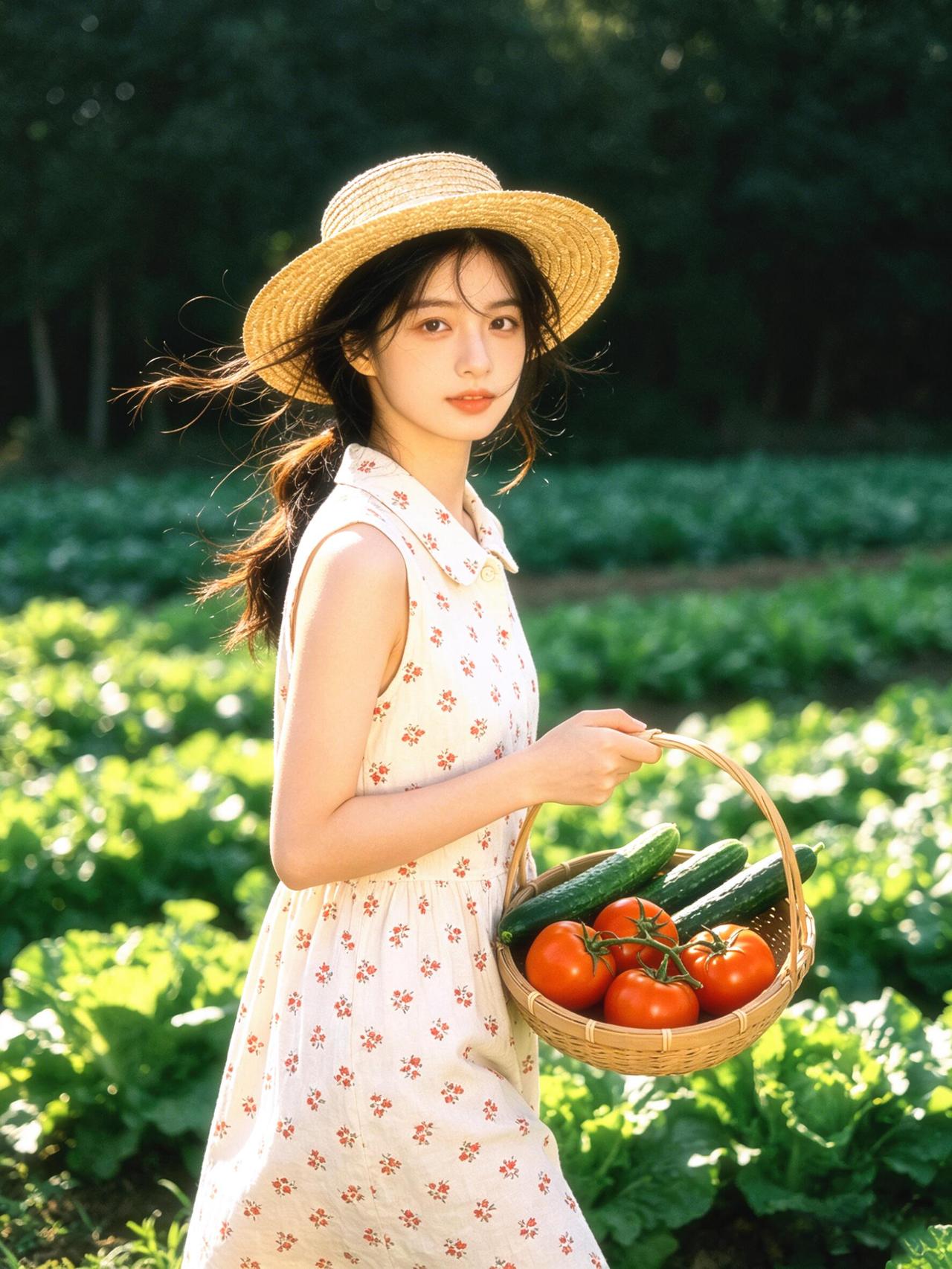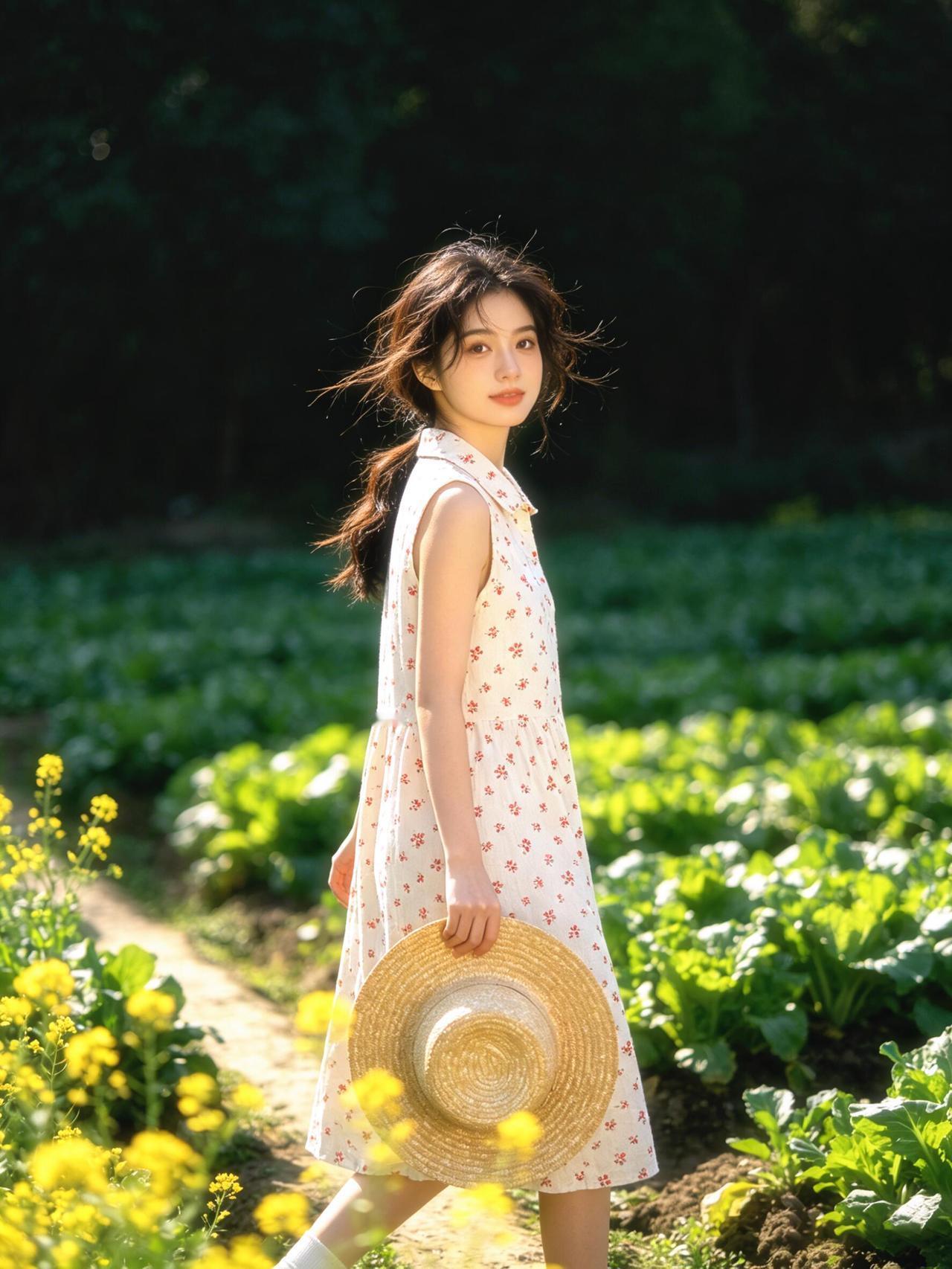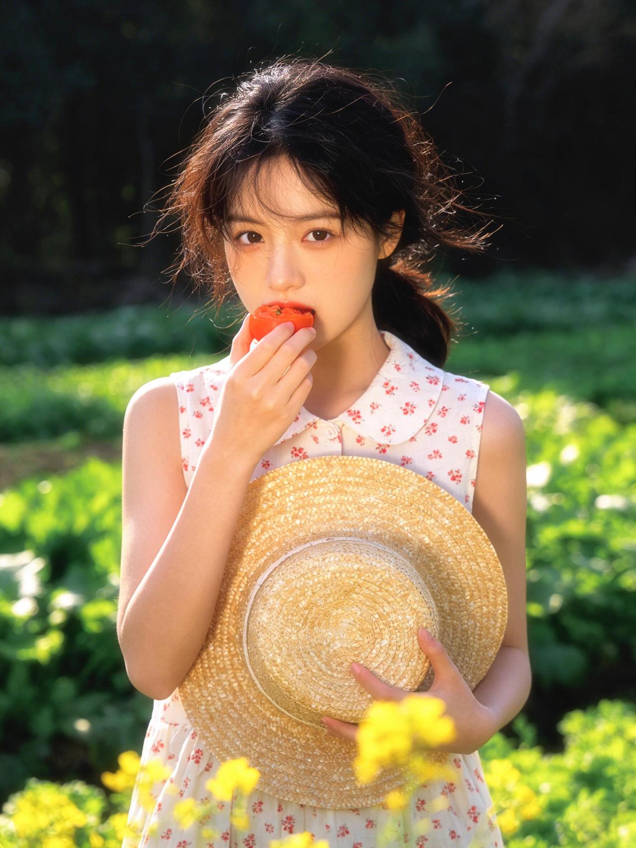 作品以田园场景为载体,通过不同的环境元素构建了完整的叙事链条。 从金黄的油菜花田到翠绿的麦田,再到生机盎然的菜园,场景的转换不仅丰富了画面内容,更赋予了照片不同的情绪基调。麦田中的清新宁静、菜地里的鲜活烟火气,让系列作品既有整体的风格统一性,又各具特色。 画面的色彩控制十分出色。大面积的绿色背景作为基调,搭配米白碎花裙的柔和色调,再以黄色花朵、红色蔬果作为视觉焦点,色彩层次分明且协调统一,既突出了清新感,又避免了单调。光线的运用在不同场景中保持了一致性,侧逆光带来的通透感贯穿始终,让人物的皮肤质感在自然光下呈现出细腻柔和的效果。 细节的把控让画面更具感染力。草帽、竹篮、新鲜蔬果等道具的运用,不仅强化了田园主题,更成为人物与场景互动的桥梁,让画面充满生活气息。被风吹起的发丝、人物自然的神态与动作,都让画面摆脱了刻意的修饰,传递出松弛而治愈的氛围。整体而言,这组作品通过场景叙事与细节塑造,成功打造了一组充满春日气息的田园风人像。