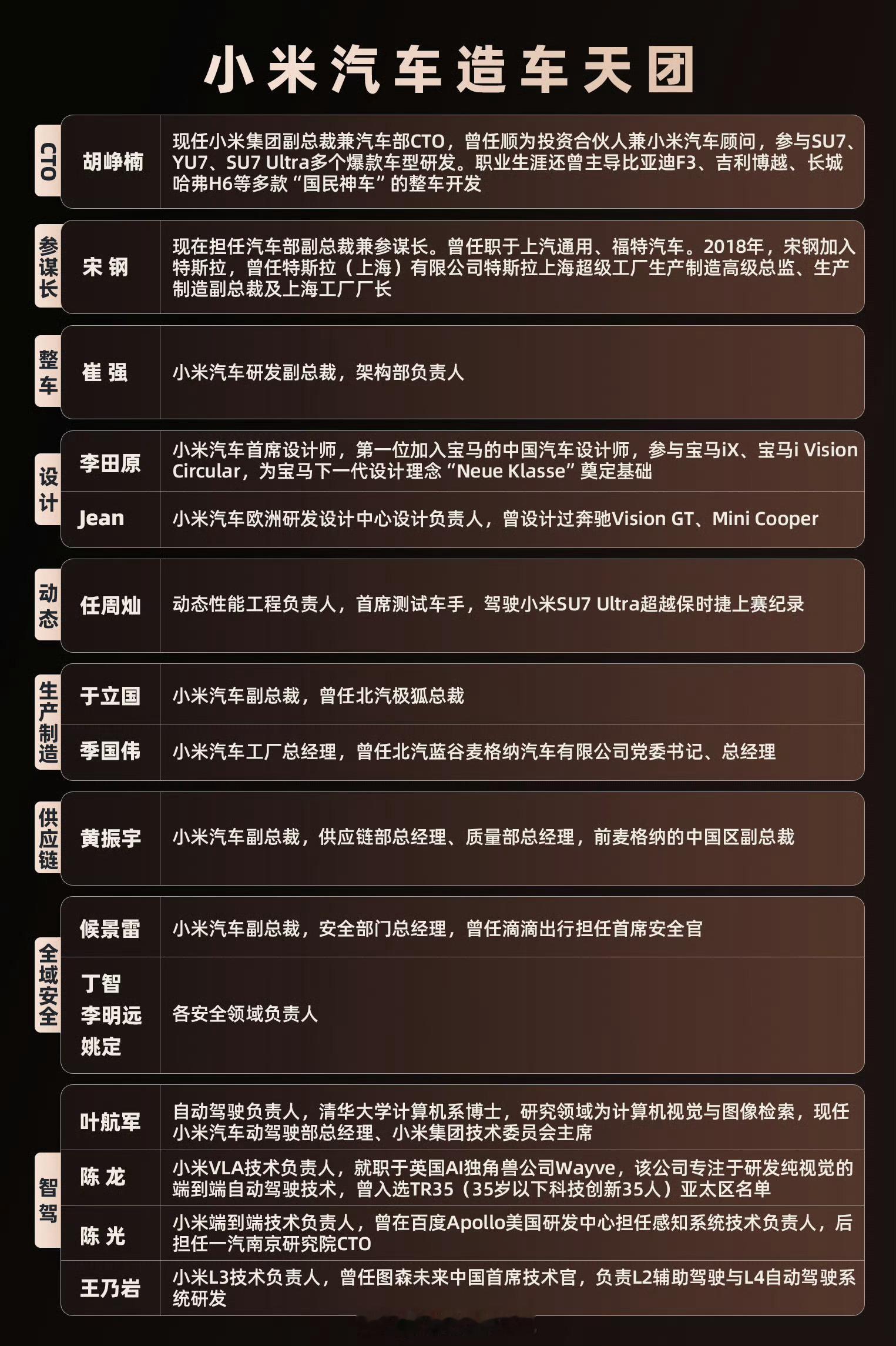 小米造车天团,就可以看出小米是认真造好车,舍得投入,广纳贤才。小米造车经验不算多,但是有了这些人,就有经验了。加上小米本身的软件能力积累,在汽车智能化方面是有优势的。