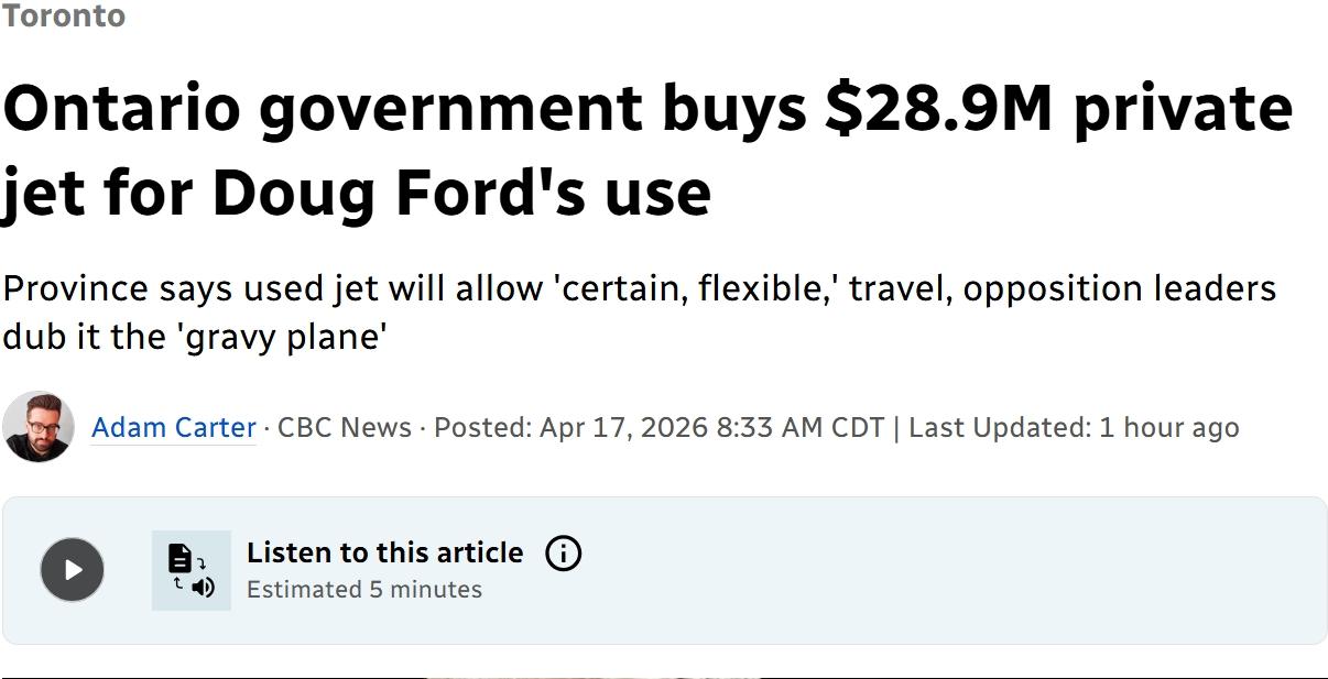 加拿大省长花2890万美元为自己购买私人飞机,引发批评 当地时间周五,加拿大安大略省省长办公室确认,省政府以2890万美元购买了一架二手私人飞机,供省长道格·福特使用。 声明中写道:“作为安大略省省长的工作之一,安大略省内有广泛的出差,安大略省面积是德克萨斯州的两倍。这还包括在加拿大各地参加联邦理事会和首席部长会议,这些会议频率有所增加,同时还要前往美国,帮助反对特朗普总统的关税。” 据消息人士称,这架2016年在加拿大制造的庞巴迪挑战者650将实现“更安全、灵活、安全和保密的旅行”,安大略省警察局和庞巴迪对飞机进行了安全和机械检查,省政府称无需升级。 政府消息人士无法给出飞机运营成本的确切估算,并表示成本将有所波动。 反对党新民主党领袖玛丽特·斯泰尔斯在新闻发布会上说:“我觉得省长在这种时候考虑花3000万美元买豪华私人飞机,实在令人愤慨——安大略省人正为房租和食物价格挣扎。” 临时自由党领袖约翰·弗雷泽说:“人们买不起杂货和汽油,道格·福特正在买私人飞机。那是陈词滥调,脱离现实,令人难以置信的是,省长竟然如此脱离安大略人民的日常生活现实,竟然做出如此不合时宜的决定。他应该专注于简单的事情。” 新民主党周五上午还发表声明,引用了2019年《多伦多星报》的一篇报道,福特当时希望根据他的规格定制的房车细节曝光之后,福特称自己是“历史上唯一一位宁愿在省内开车绕行也不愿花纳税人钱飞来飞去的省长”。 CTF安大略主任诺亚·贾维斯说:“福特不像许多美国省长那样乘坐商业航班,而是宁愿用纳税人的钱扮演富人和名人的生活。普通纳税人都在为维持生计挣扎,福特让他们付私人飞机费用,这样他就不用像其他人一样在机场排队了。”