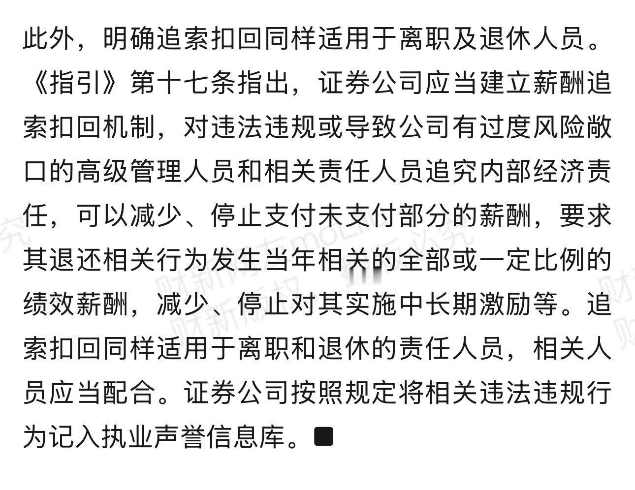第十七条:证券公司应当建立薪酬追索扣回机制,对违法违规或导致公司有过度风险敞口的高级管理人员和相关责任人员追究内部经济责任,可以减少、停止支付未支付部分的薪酬,要求其退还相关行为发生当年相关的全部或一定比例的绩效薪酬,减少、停止对其实施中长期激励等。