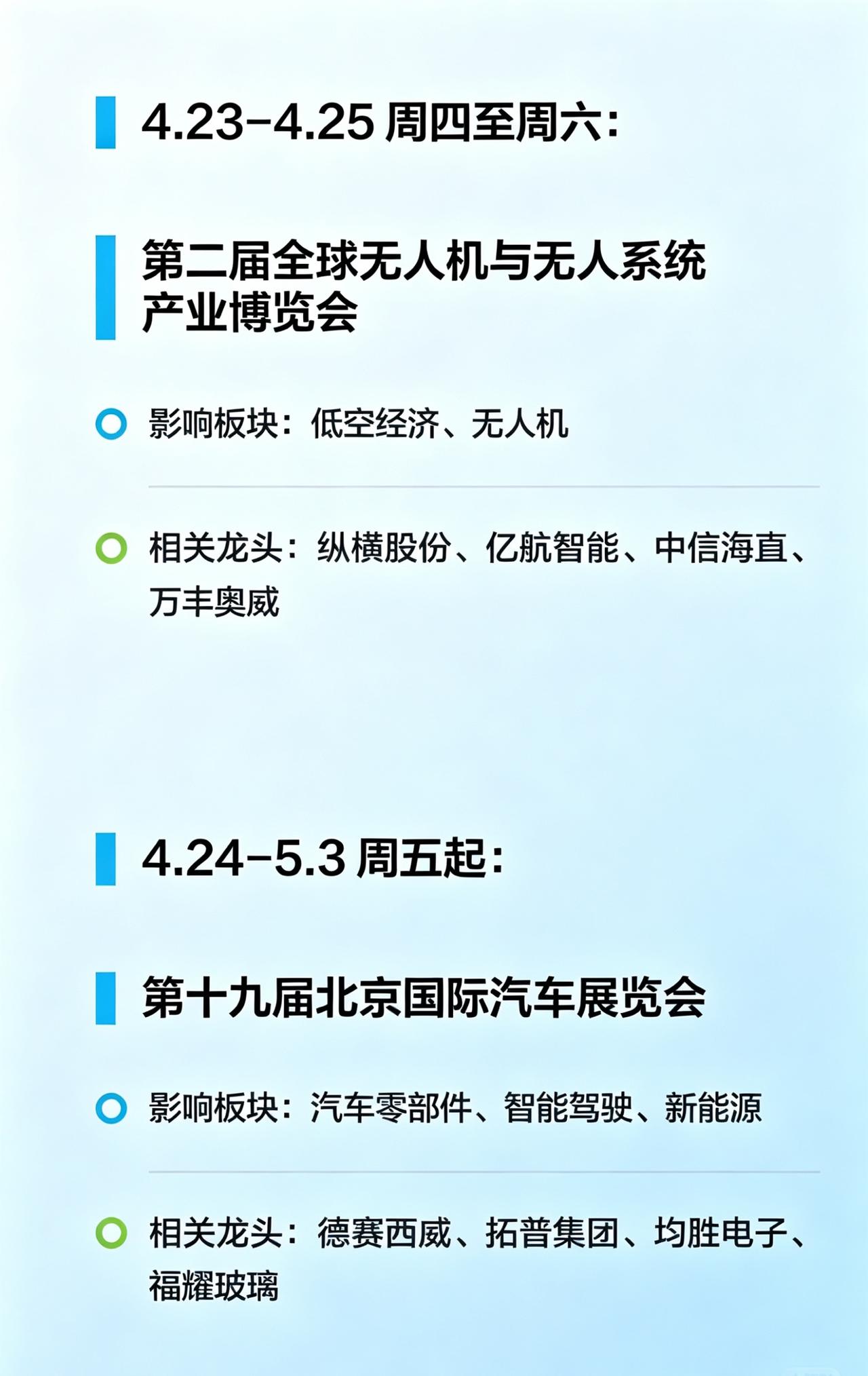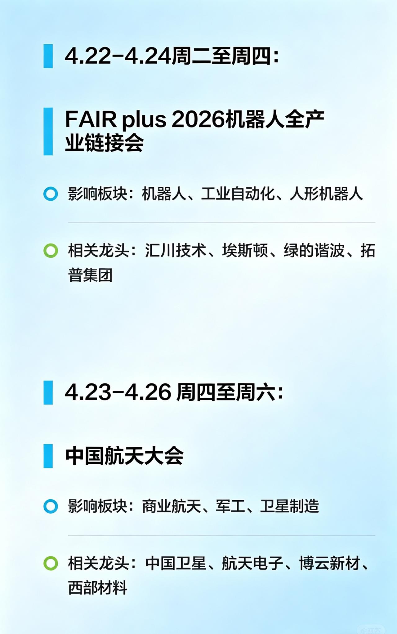 下周A股重点事件清单,干货收好 各位股友,下周(4.20-4.26)市场上有几个关键行业会议扎堆开,对板块的催化效应大概率会显现,给大家捋捋时间线和对应的方向,方便你们提前做功课。 1️⃣ 4.21-4.23 全球6G技术与产业生态大会 通信板块的重磅活动,6G、通信设备、卫星互联网是核心方向。 相关公司:中兴通讯、烽火通信、信科移动、光迅科技 个人看法:卫星互联网是近期的热门赛道,这次大会如果有技术突破或者合作进展,很容易带动板块情绪,重点关注有订单和技术储备的龙头。 2️⃣ 4.22-4.24 FAIR plus 2026机器人全产业链接会 机器人、工业自动化、人形机器人的产业链盛会。 相关公司:汇川技术、埃斯顿、绿的谐波、拓普集团 个人看法:机器人板块调整了一段时间,这次会议如果有量产落地、订单合作的消息,很可能会成为板块反弹的催化剂,尤其是核心零部件厂商。 3️⃣ 4.23-4.26 中国航天大会 商业航天、军工、卫星制造的行业风向标。 相关公司:中国卫星、航天电子、博云新材、西部材料 个人看法:航天大会向来容易出政策利好,商业航天的商业化落地进度是关键,材料和卫星制造环节值得留意。 4️⃣ 4.23-4.25 第二届全球无人机与无人系统产业博览会 低空经济、无人机赛道的重要展会。 相关公司:纵横股份、亿航智能、中信海直、万丰奥威 个人看法:低空经济是今年的重点方向,这次展会如果有政策或者订单消息,对板块的带动会很直接,尤其是具备核心技术的企业。 5️⃣ 4.24-5.3 第十九届北京国际汽车展览会 汽车零部件、智能驾驶、新能源的年度盛会。 相关公司:德赛西威、拓普集团、均胜电子、福耀玻璃 个人看法:车展上新车、新智能技术的发布,往往会带动产业链相关个股,尤其是智能驾驶和轻量化零部件方向。 💡 最后说句实在的: 这些事件只是给大家梳理了市场的潜在催化方向,市场最终怎么走,还要看资金情绪、大盘环境和消息的实际力度,大家理性看待,别盲目追高,控制好仓位最重要。