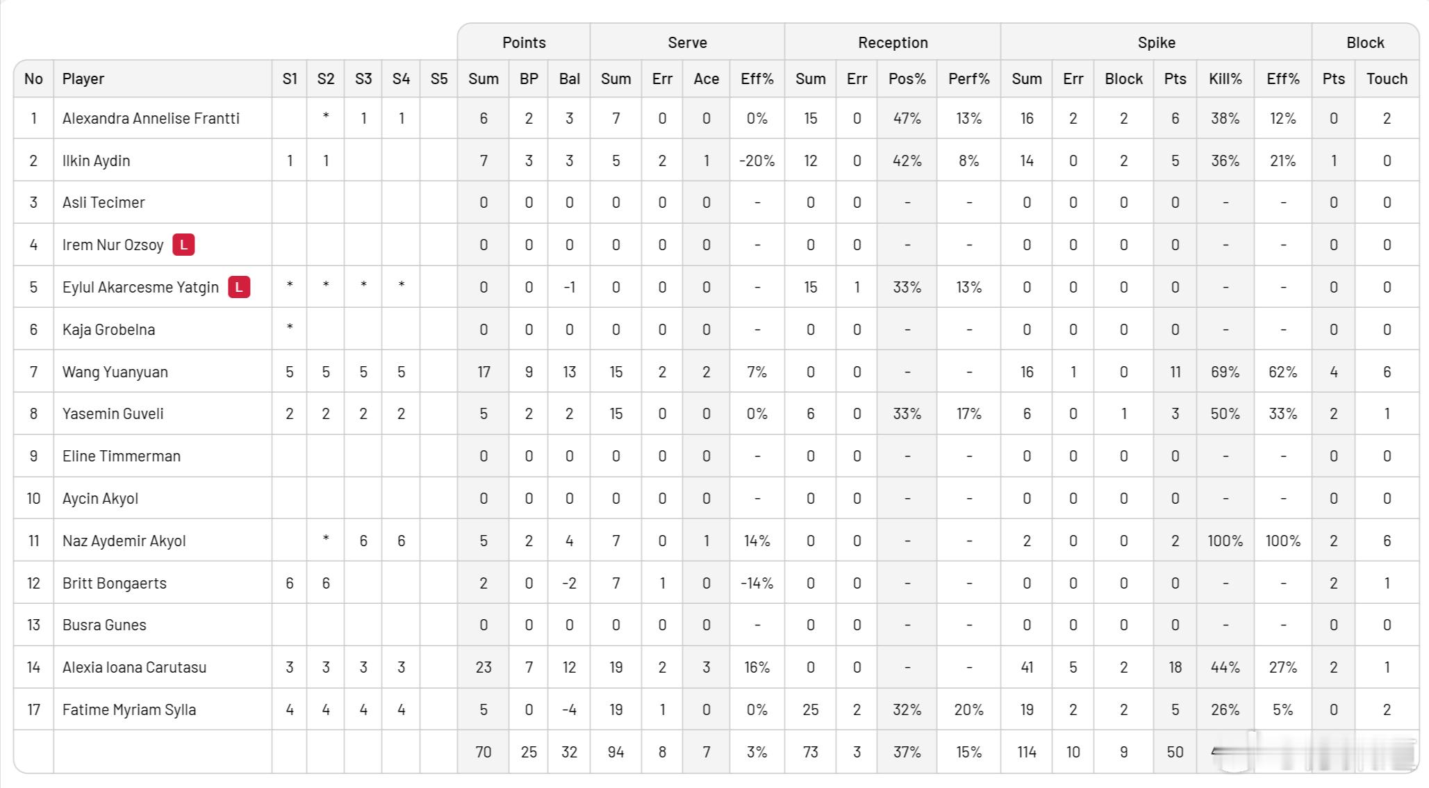 加拉塔萨雷-阿拉斯卡戈进攻:50-54;拦网:13-9;发球:7-4;自失:38-41卡鲁塔苏23分 41扣18中 5失误2被拦 2拦3发;王媛媛17分 16扣11中 1失误 4拦2发;伊尔金7分 14扣5中 2被拦 1拦1发;弗兰蒂6分 16扣6中 2失误2被拦;居维利5分 6扣3中 1被拦 2拦;塞拉5分 19扣5中 2失误2被拦;纳兹5分 2扣2中 2拦1发;邦加尔茨2分 2拦安图利26分 44扣22中 4失误3被拦 3拦1发;奥拉亚18分 33扣17中 3失误4被拦 1拦;佩雷兹7分 12扣6中 1失误2被拦 1发;巴斯约尔库5分 11扣5中 1失误1被拦;卡兰达泽4分 19扣3中 2被拦 1拦;奥兹格3分 5扣1中 1被拦 1拦1发;梅尔维2分 1扣0中 2拦;阿斯里汉1分 1拦;埃罗古兹1分 1发