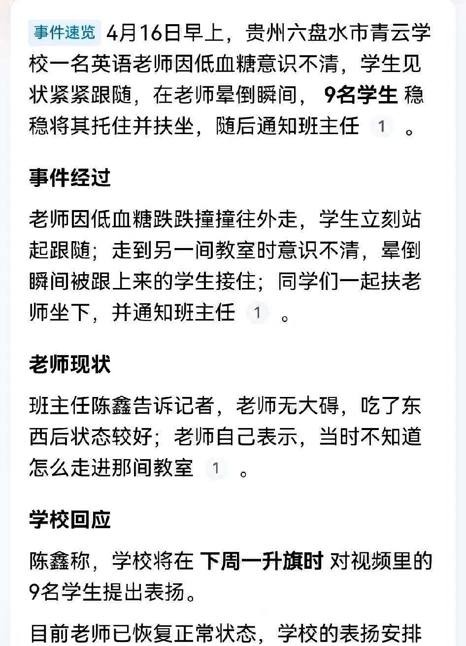近日,贵州,一老师上课时突发低血糖,身体不舒服。即便如此,她没有立刻中断课堂,而是强撑着身体,平稳安排学生自主自习,交代好班级事宜后,才独自踉跄着走出教室,打算找地方稍作休息,缓解身体的不适。 老师默默隐忍不适的样子,被班里的学生看在眼里、记在心上。她刚走出教室门口,几名留意到老师异样的学生,便悄悄跟了上去,时刻关注着老师的状态。 没走几步,老师便体力不支,眼看就要摔倒,紧跟在身后的学生反应迅速,在老师摔倒前稳稳将其扶住。之后,孩子们各司其职,有人轻轻搀扶着老师,有人快速找来凳子让她坐下休息,有人跑去告知班主任,还有人拿出自己的零食,递给老师补充糖分,帮助老师缓解症状。 在学生们的细心照料下,老师的身体不适很快得到缓解,目前已完全恢复,无任何大碍。学校了解到这一暖心事件后,决定在下周一升国旗仪式上,对这9名暖心学生进行公开表扬,赞扬孩子们的善良与懂事。 教育从来都是相互的,老师尽心尽责,坚守教书育人的职责,把学生放在心上,用心对待每一位学生;学生也能感知到老师的付出与辛苦,在老师遇到困难时,毫不犹豫伸出援手。 没有轰轰烈烈的情节,只是日常里最真实的双向关怀,却足以让人感受到温暖。老师用责任守护学生成长,学生用感恩回馈老师,这便是最质朴、最美好的师生关系。 简单的举动,藏着纯粹的善意,这样的校园温情,值得被点赞。 你是否也被这份平淡的师生情打动?