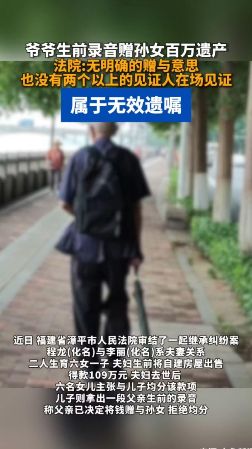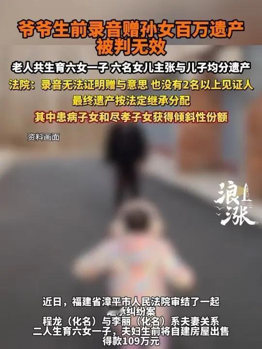 仅凭一段私下录音就能敲定百万遗产归属?福建漳平法院给出硬核答案 (个人观点仅供参考,无任何不良引导) 大额遗产分配最能考验一家人的真实情分。一纸非正式音频能否改变一百零九万元财产的最终走向。福建漳平当地法院近日审结的一起家事案件。撕开了很多家庭在财富面前的真实模样。 世间冷暖皆在人情,钱财面前最见人心。当地一对老年夫妻走完一生旅程。身后留存合计一百零九万元合法积蓄。二老一生养育七个孩子。六个女儿常年贴心照料家中琐事。日常赡养从未推诿懈怠。家中独子平日里享受更多偏爱。却在父母后事办妥之后生出别样心思。一众手足往日和睦氛围瞬间荡然无存。 家中六位女儿秉持公道本心。多年尽孝不分昼夜不分寒暑。老人晚年衣食起居全程用心陪护。同等付出之下自然期盼同等分配权益。全部遗产由七位子女共同平均享有。这般想法合乎天理人情贴合公序良俗。家中独子却执意单独占有全部款项。不肯接纳姐妹提出的均分提议。一场家庭内部矛盾就此彻底激化。男子随后拿出一段老人生前留存语音片段。声称长辈亲口承诺所有钱款全数留给自家孙女。其余亲属没有任何参与分割的资格。这段音频成为男子独占遗产的唯一依仗。 手足之间多次当面沟通全无成效。亲情裂痕越来越大难以弥合。六位女儿万般无奈之下选择拿起法律武器。走进司法机关寻求公正裁决维护自身合法权益。不少围观群众都以为手握长辈原声就可稳操胜券。庭审环节层层核验各项细节之后结果出人意料。司法工作人员逐条对照民法典相关新规。现场明确指出私人录制音频不具备合法遗嘱效力。合法录音遗嘱需要第三方无关联人员现场全程见证。录制时间录制场景全部留存完整备案材料。涉案音频缺少全部法定必备流程要件。法律效力直接归零不具备任何凭证价值。 一百零九万元遗产回归法定正常分配流程。七个子女按照法律规定平等享受继承权益。随意录制口头音频妄图独占家产的想法彻底落空。谁还能说法律不会守护普通家庭的公平正义。一纸不合规录音换不来分毫家产倾斜。人心向善和睦相处才是家庭长久安稳的根基。家家户户都该提前正视遗嘱订立的法定规范。别等亲情撕裂对簿公堂才懂守法守规的重要意义。珍惜血脉相连的今生缘分看淡身外浮动钱财。家和万事兴才是一生安稳幸福的真正底气。
