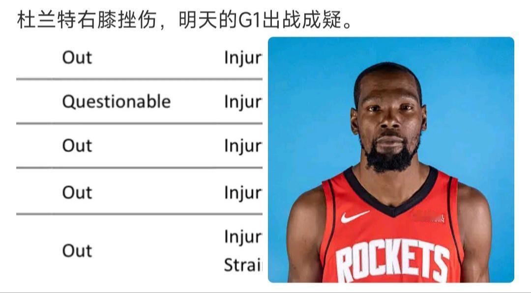 如果杜兰特受伤,火箭是不是完蛋了? 本来湖人晋级率很低,这下詹姆斯看到希望了,老胳膊老腿拼一把进第二轮? 湖人去掉东契奇,里夫斯。 火箭去掉杜兰特。 双方五五开啦....[思考][捂脸]
