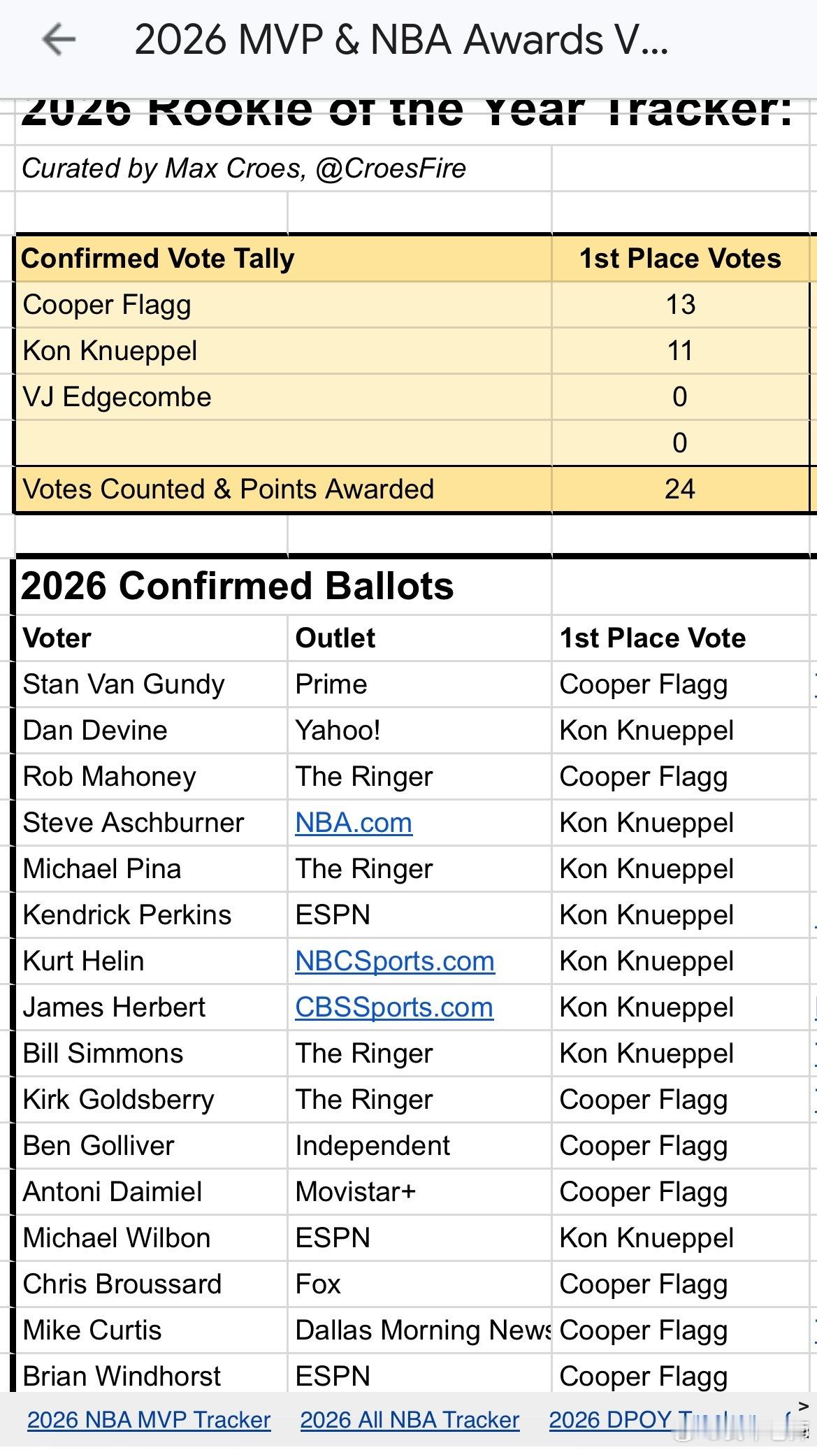 MFFL 目前已经有24名拥有投票权的媒体人公布了最佳新秀的投票。
