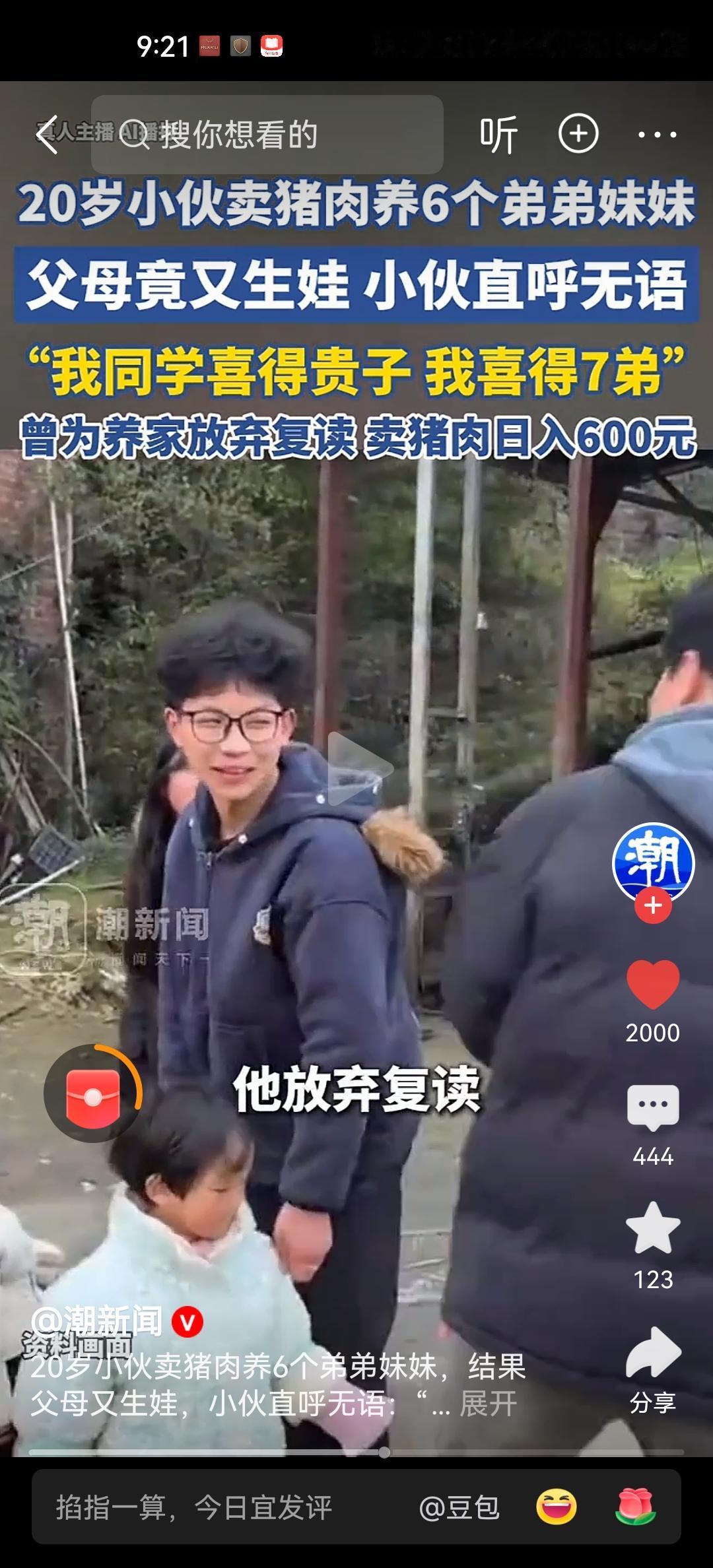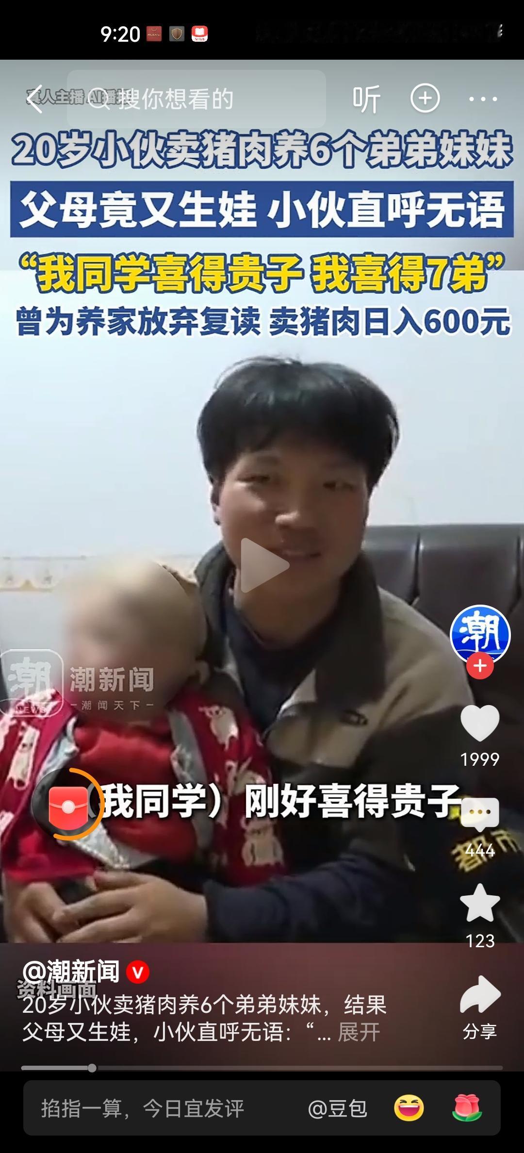 父母又生娃作为长子,要和父母一起分担养育家庭的重任。但是谁知道这个重任是他卖猪肉养家,而他的父母则潇洒的造人。20岁的小伙子,忙的连恋爱都没得谈,但是他的父母却连生七娃。那么这到底属于孙攀家德的沦丧?又还是他父母不负责任的扭曲呢? 湖南邵阳20岁的小伙孙攀,两年前高考落榜。看到家中弟妹都很小,作为长子毅然的放下课本,抄起砍刀,开始卖猪肉。每天忙着挣钱,连恋爱都没时间谈,女朋友也没有。更别说重新回到学校读书提升自己了。但是令他绝望的是,他的父母告诉他,很快他有第7个弟妹了。 他的父母也确实属于比较奇葩的,只顾着自己快活,只顾着自己多子多福。很有可能长子,未来就变成别人口中的“寡佬”了,就是未来没有媳妇,没有家庭,年轻时赚钱照顾父母和弟妹。等到父母老了走了后,弟妹长大成家后,发现自己了然一生,什么都没留下。 可以想象,他就一高中文凭,在农村生活,现在最小的弟妹刚刚落地。哪个女孩子愿意嫁给这样的嫡长子呢?而他父母这么不负责任,甚至未来有可能还会给他带来第8个第9个。现在卖肉能赚钱,但是赚来的钱都被弟弟妹妹和父母给消耗掉了。未来等他们长大后,又有谁会管这个哥哥呢? 特别建议这个小伙为自己考虑考虑,既然父母只为他们自己考虑,那么小伙为什么也不能为自己考虑呢?