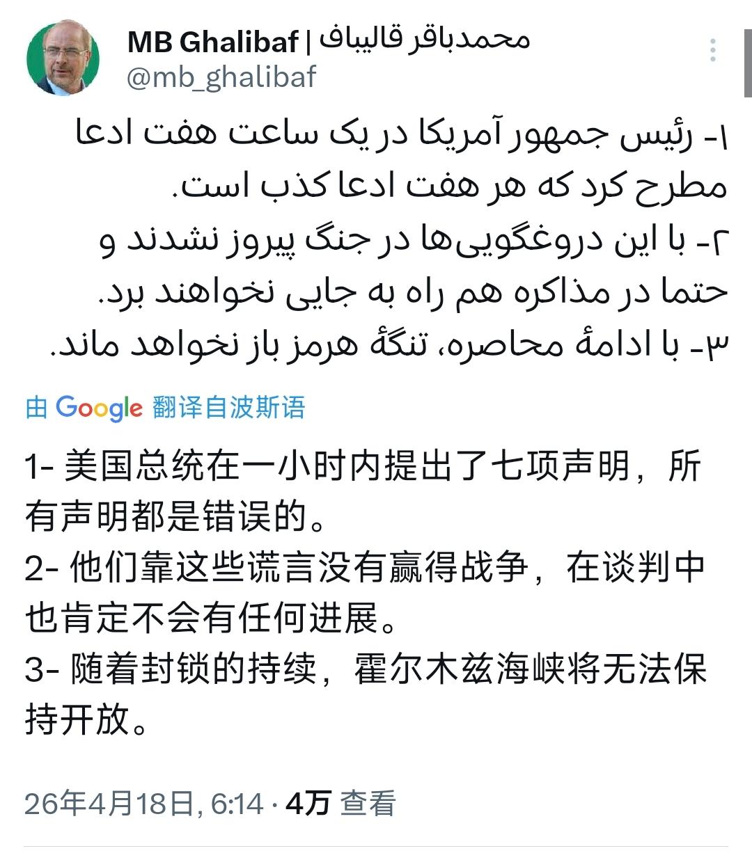 当地时间 2026 年 4 月 17 日,特朗普在社交平台连发七条声明,大肆渲染美伊谈判即将达成协议,声明中说伊朗已同意永久开放霍尔木兹海峡、清除海上水雷、放弃全部浓缩铀库存、停止支持地区武装力量等,同时宣布关键条款已基本谈妥,一两天内就能签署最终协议。 老特在一小时之内发布的这七条声明,让很多人都觉得美伊谈判已经取得重大突破,离最后成功仅有一步之遥,大家认为这场战争事实上已经结束了。 然而帅不过三秒。老特的这番表态还热乎着呢,伊朗方面马上就兜头泼了一盆冷水。伊朗议长卡利巴夫接着发文,明确表示特朗普所谓的七项声明均不属实,纯属不实言论。 事实上,双方在铀浓缩处置、海峡管控、地区事务等核心问题上分歧依然巨大,远未到即将达成协议的地步。 特朗普这种先入为主,想通过舆论的压力逼对方就范的招数,在伊朗面前完全没有卵用,纯属于打嘴炮!他完全沉浸在自己的幻想里,以为自己想什么就是什么,自己说什么就是什么,只要自己把这些信息公开,对方就只有乖乖接受,这也太天真了!如果真是这样,那伊朗不是白挨40多天的轰炸了? 如果老特再不改变态度,那么这个谈判不论谈多长时间,最终都不会达成任何结果。只想让对方妥协,自己要把便宜占尽,这是哪门子谈判?能达成协议的谈判,就是双方博弈并且最终都相互做出妥协的过程。想把所有好处都拿走,那还谈什么,双方直接在战场上见高低,直到最终分出胜负,胜利者可以向失败者提出任何要求。