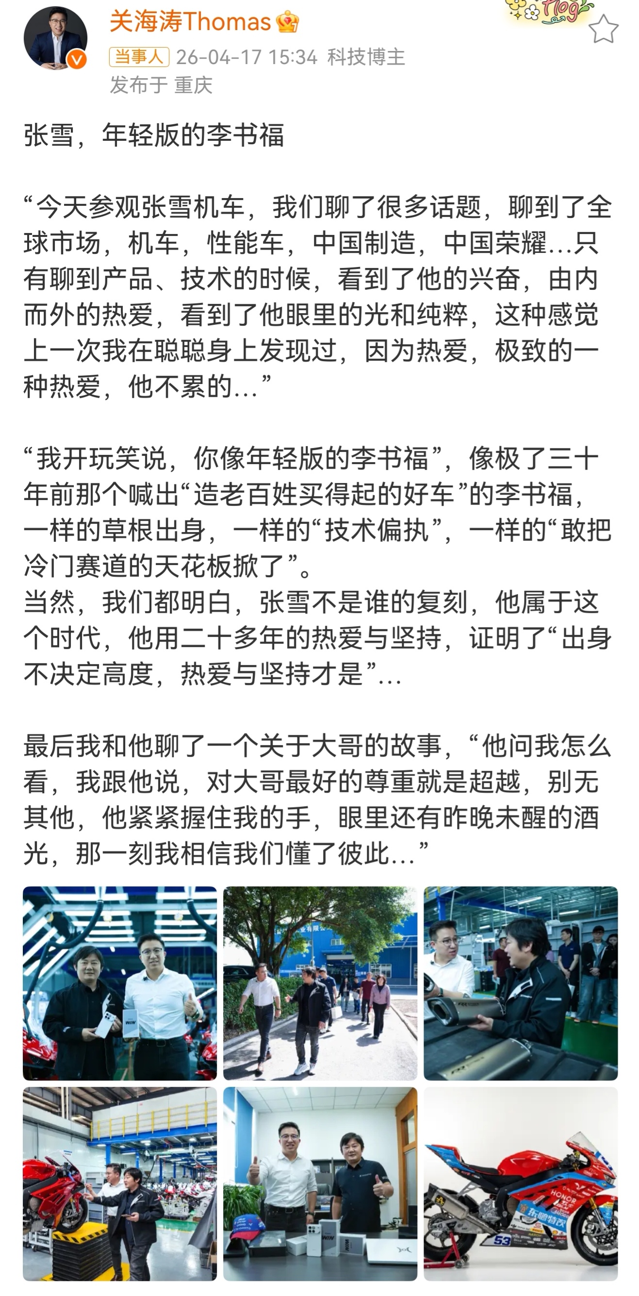 关总对于张雪“年轻版李书福”的评价,看得出来是发自内心的真挚表达。当然这份评价既是对机车领域深耕者的精准注解,也藏着荣耀与中国实业人同频的精神内核。两个品牌同样扎根中国制造、锚定全球市场,同样以极致的技术热爱打破行业壁垒,张雪谈及产品时眼里的纯粹执念,恰是荣耀坚守的“以技术立身,铸中国荣耀”的生动缩影。而“超越才是对前辈最好的尊重”的共识,也是中国实业新生力量与荣耀一同奔赴前路的底气,未来希望这俩中国制造,都能带给我们不一样的惊喜。荣耀高管称张雪是年轻版的李书福