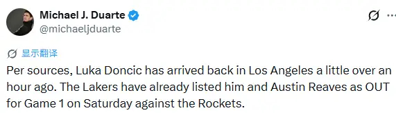 东契奇已于一小时前赶回洛杉矶,但明日对阵火箭G1缺席!