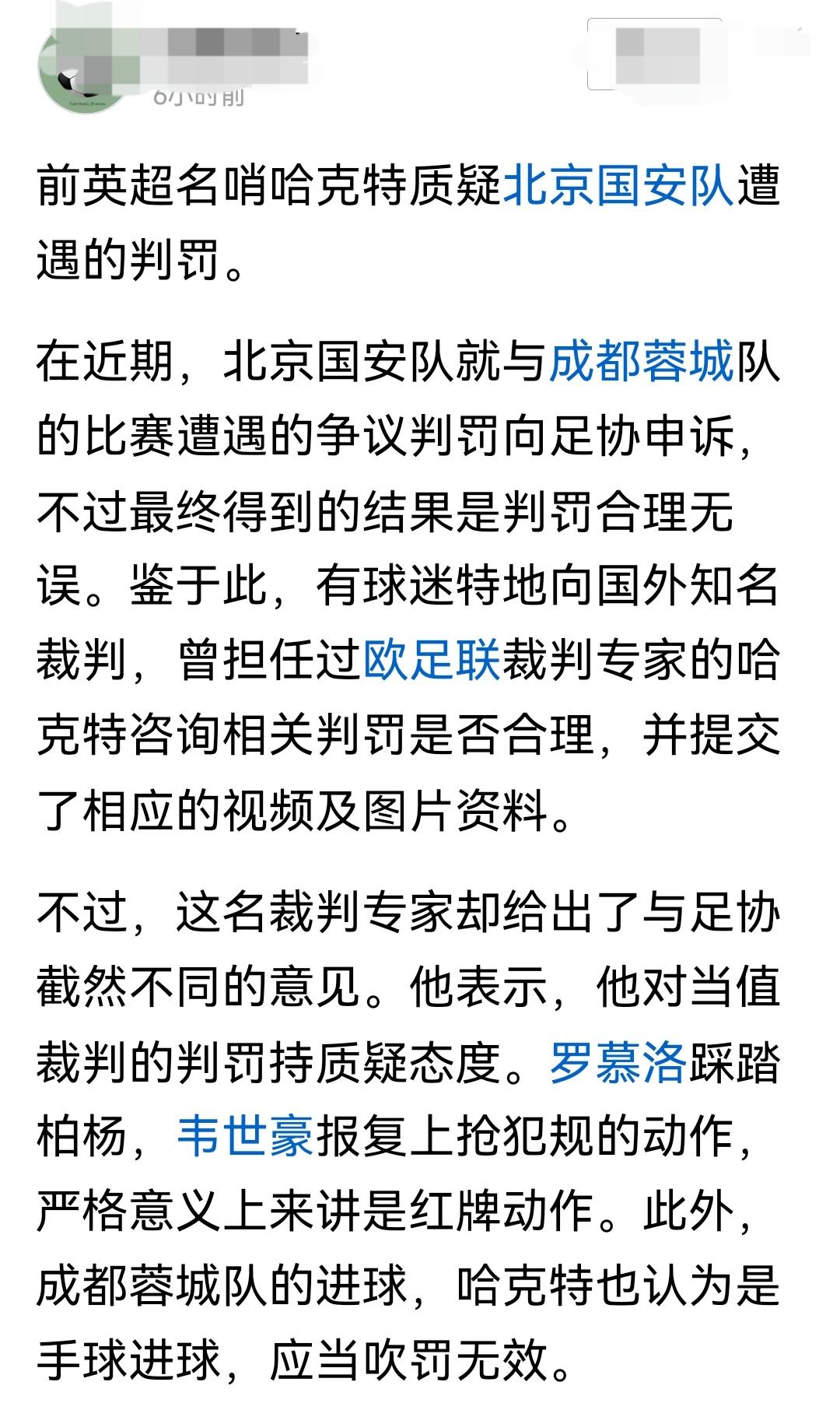 蓉城这事还没完了呢!既然足协评议组都给出来结论,还有什么可争议的,国安球迷把蓉城扳平比分的进球让英超裁判来评!我们先不说英超和中超裁判的判罚尺度问题,我就想问这位国安球迷你发给英超裁判的视频或者截图来源可信度有多少?是不是官方的完整视频?