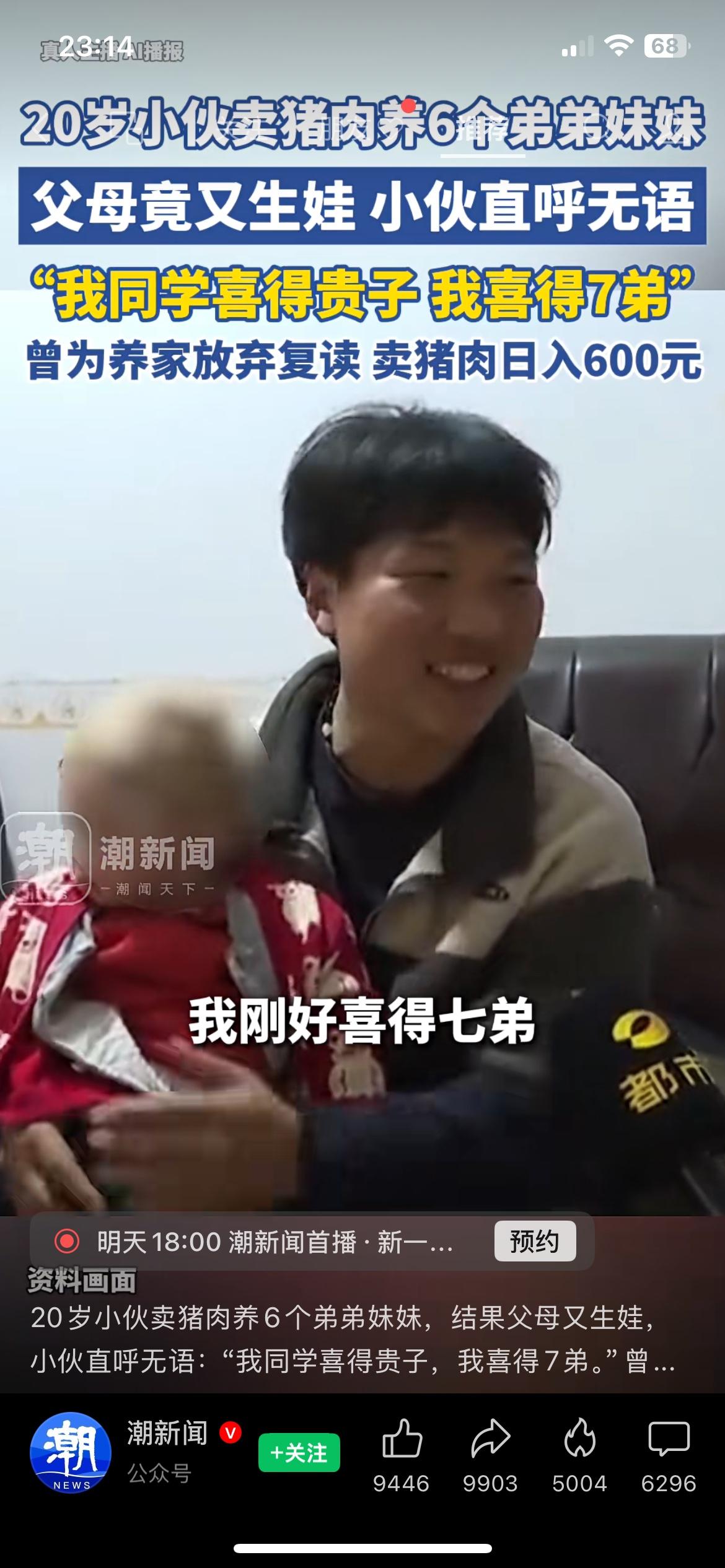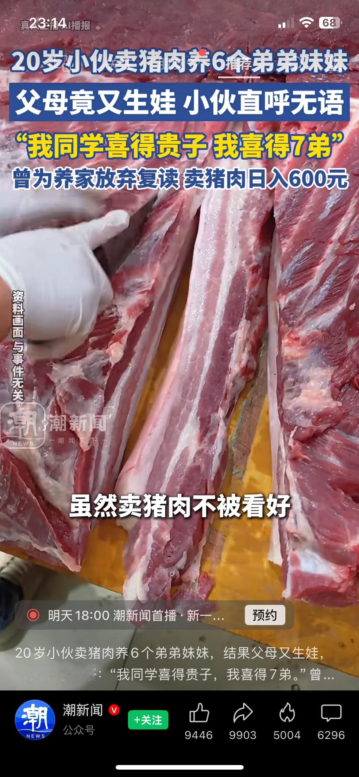 20岁小伙卖猪肉养6弟妹,父母又生娃太无奈 最近刷到个视频,心里挺不是滋味。一个20岁的小伙子,本来能复读考大学,为了养活6个弟弟妹妹,只能辍学卖猪肉,一天挣的钱全贴补家里。 没想到爸妈又生了一个,他笑着说同学喜得贵子,他喜得7弟,听着就让人心酸。年纪轻轻扛这么大压力,真的太不容易了。