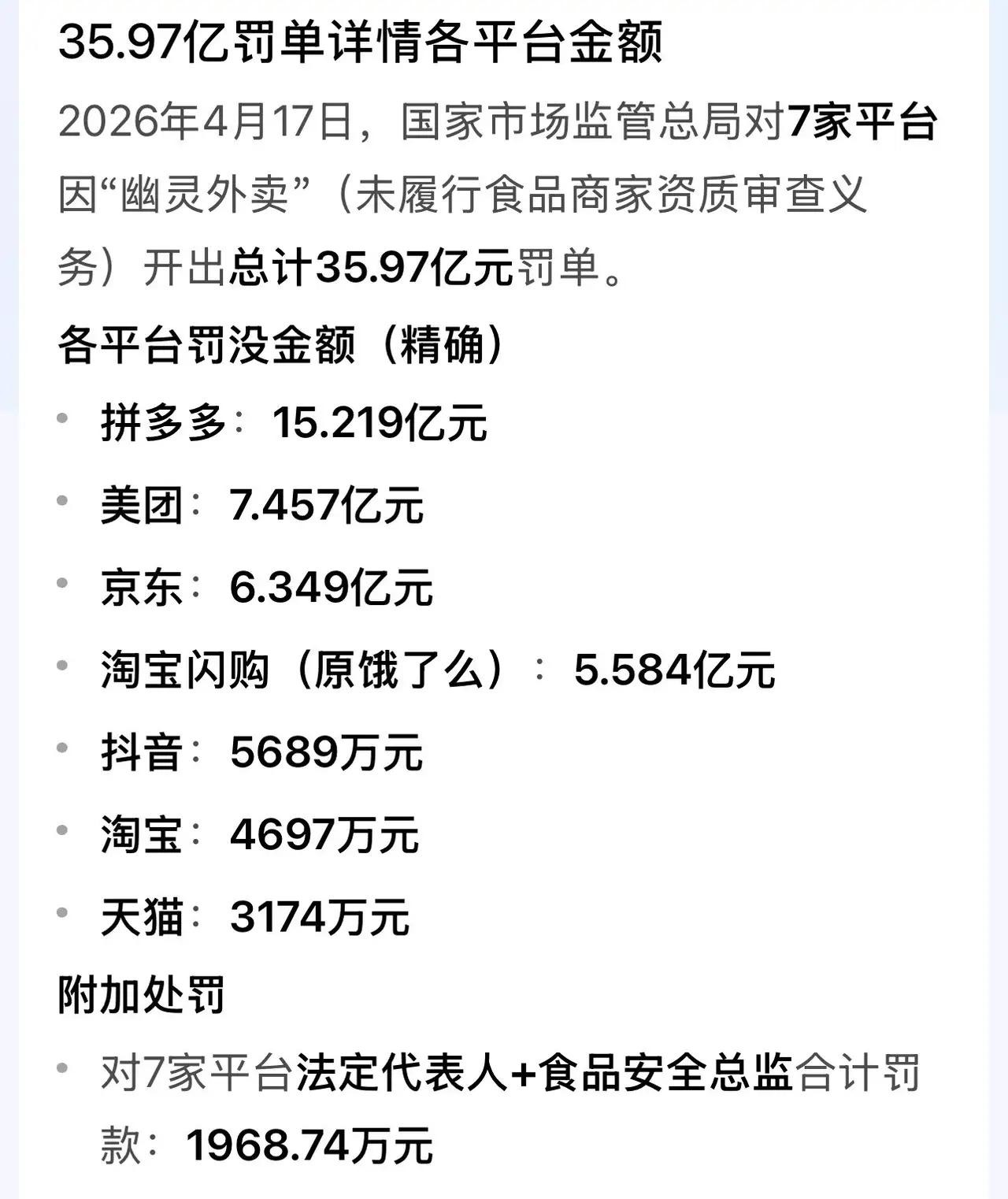 这次因为“幽灵外卖“被罚的七家外卖平台,拼多多罚款额度排名第一,充分说明拼多多无资质的商家是最多的。 很多人只注意到“幽灵外卖”中的外卖两个字,感觉拼多多甚至都没有外卖业务,怎么会被罚款最多呢。 其实,“幽灵外卖”主要指的是无资质的出售食品类的食品商家,有人会问,为什么不处理“幽灵外卖”的商家,却出来这些平台? 这就牵涉到这些平台最大的一个责任范围,要从正规渠道“进货”,所谓的“正规”,就是做什么都要有国家相关部门颁发的资质证书,如果没有,说明这些商家可能就是在国家监督的范围之外。 所以,惩罚这些平台是非常正确的!