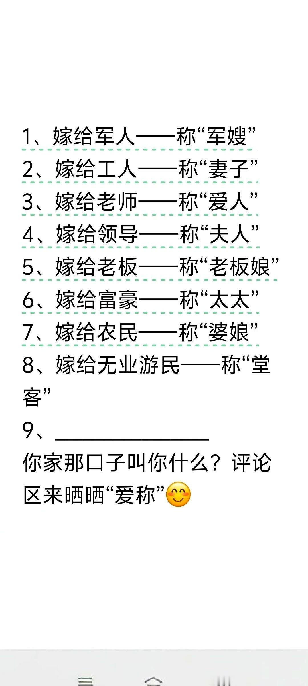 你知道吗,老婆这个词可不是随便叫的,原来“媳妇”这个称呼也分三六九等! 嫁个普通人就叫老婆,嫁个有钱有势的可能就叫太太或者夫人了,说白了就是不同身份对应不同称呼。 就像咱们现在网上调侃的,你喊她“宝贝”和喊她“甲方”那感觉能一样吗? 前两天看个短视频,老公下班回家瘫沙发上喊“老婆倒杯水”,那种随意感真是烟火气十足。 其实这些称呼背后,多少反映了点家庭里的微妙地位。 你家里平时是怎么称呼另一半的,是亲昵的爱称还是随口的代号?