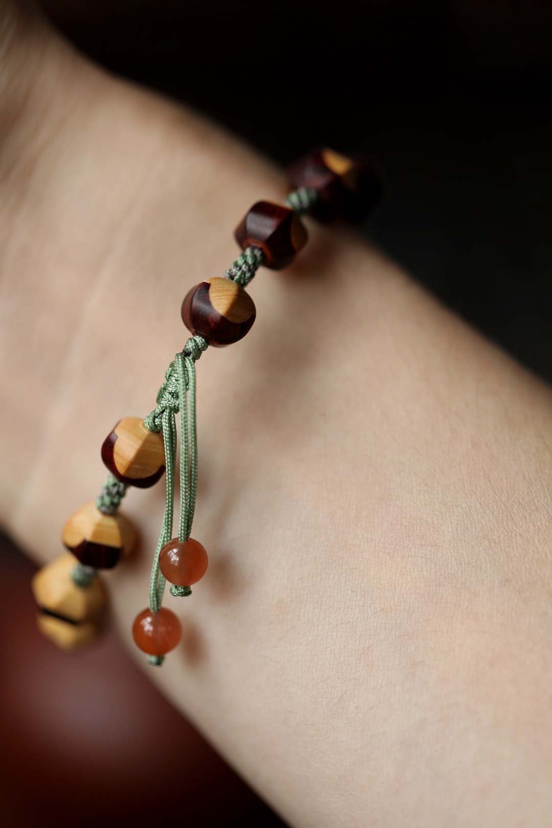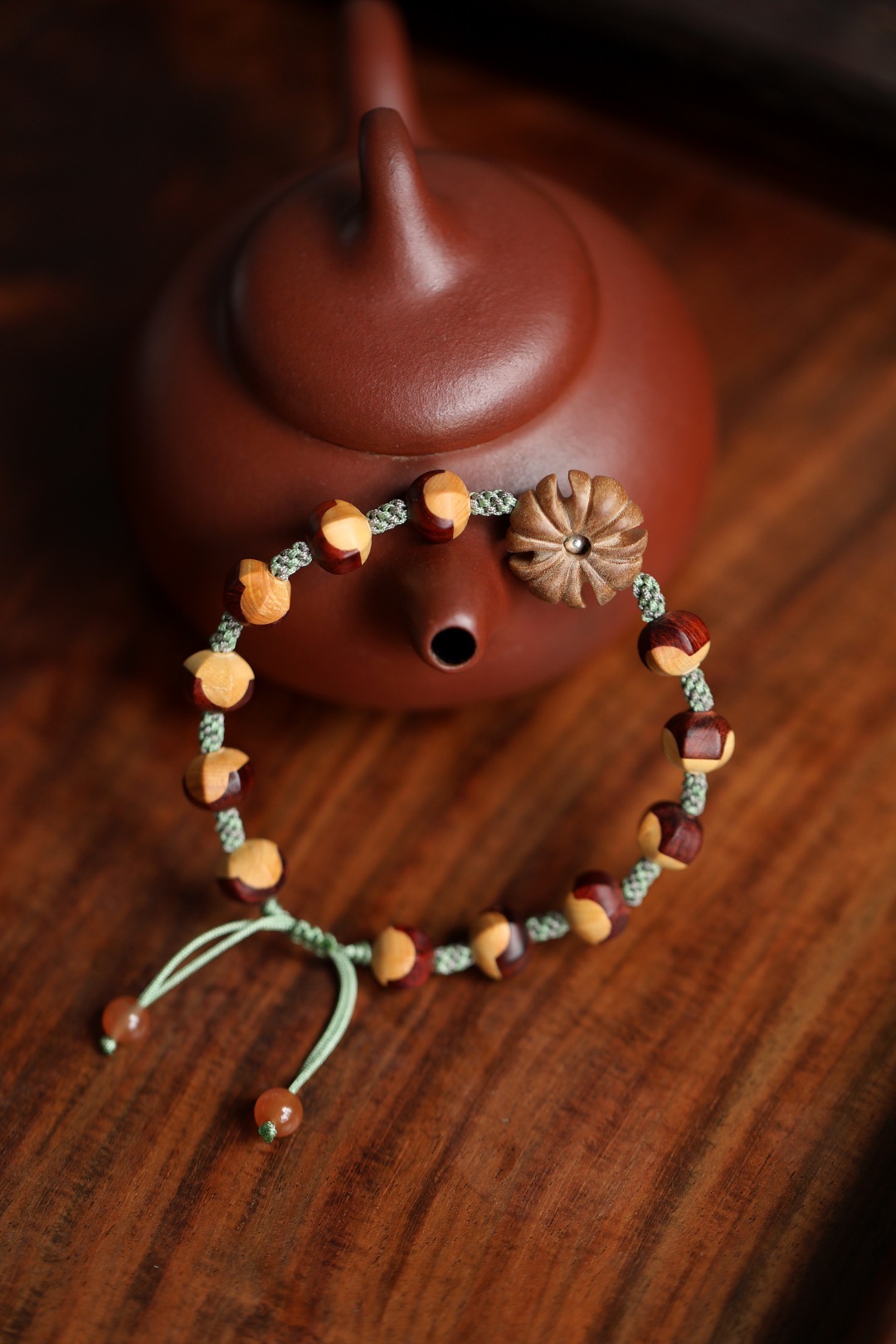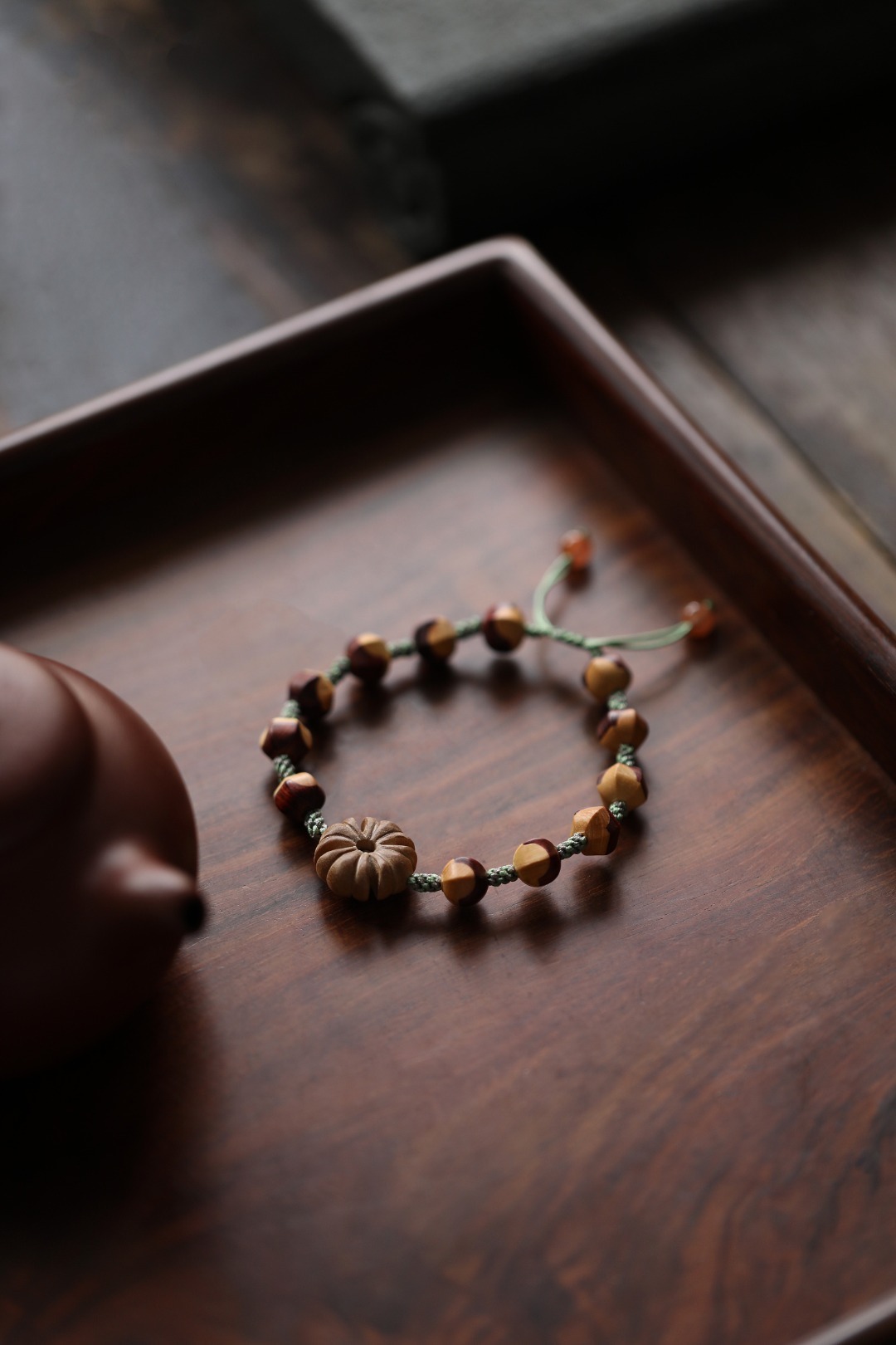 紫檀镶嵌黄杨木设计,柔和温婉,灵俏动人,佩戴于手,别致风雅。
