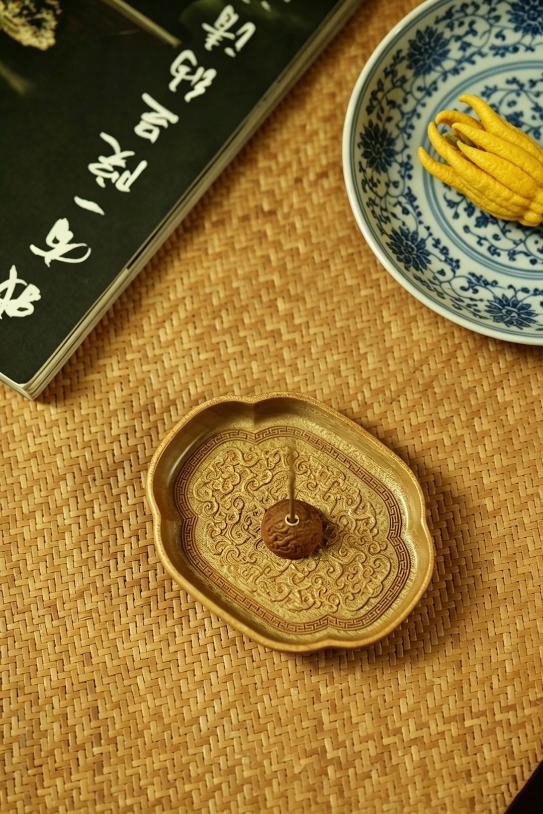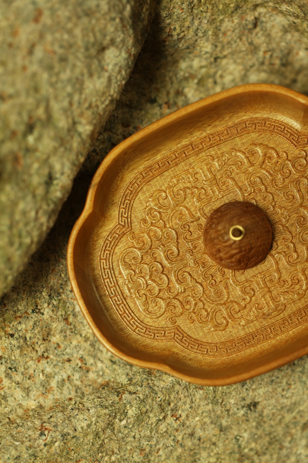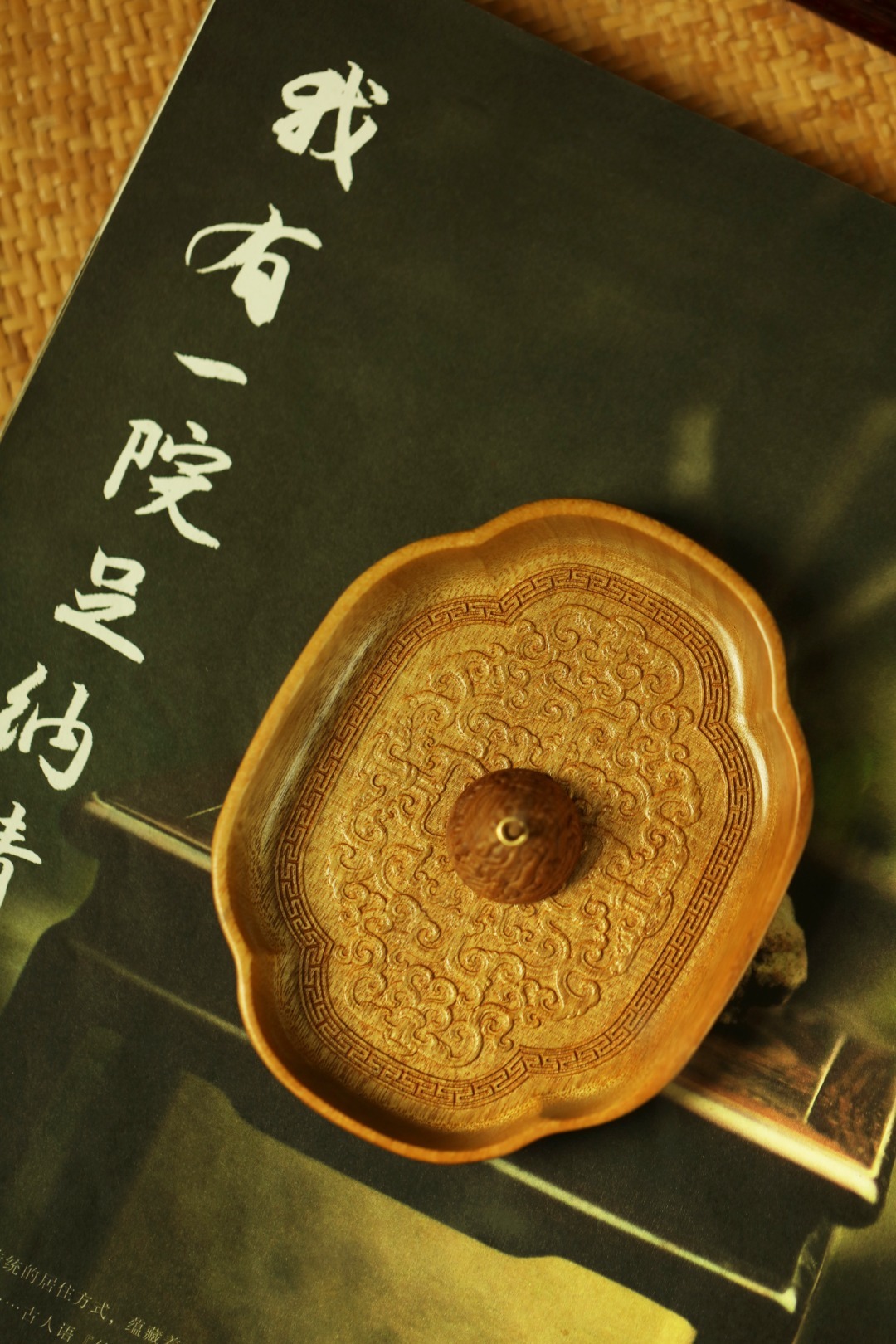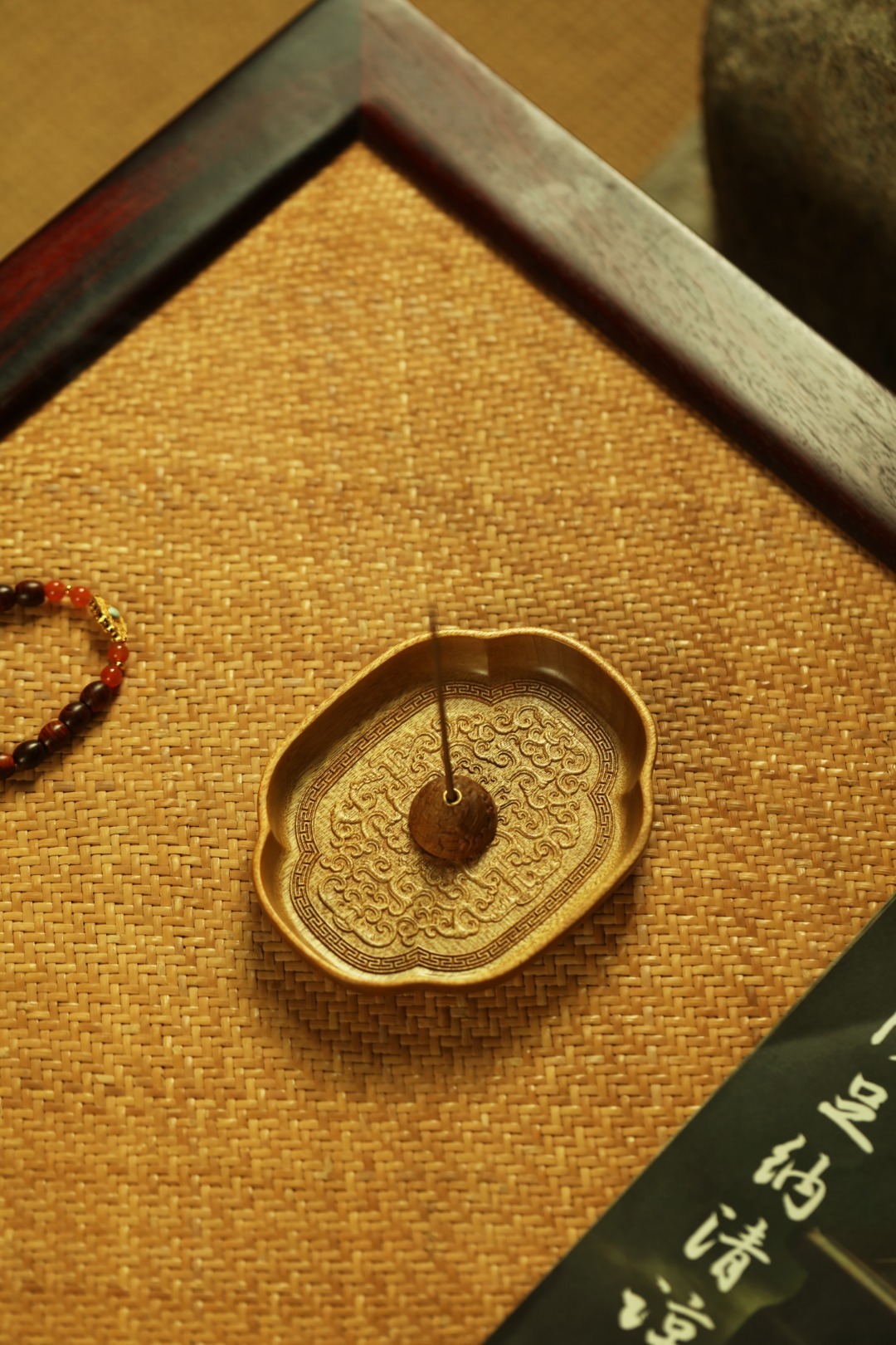 金丝楠整木掏制,雕刻宝相花纹,盘心磁石吸附,香插设计精妙,方便清灰。案几燃香造景,精致典雅。