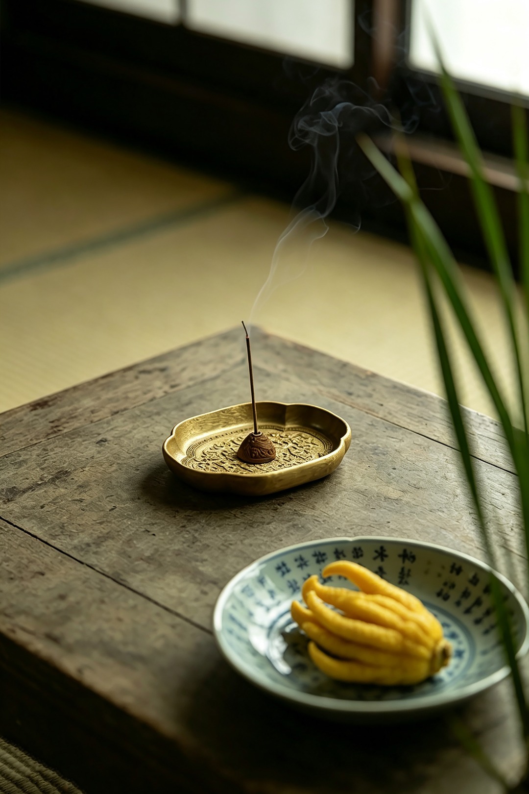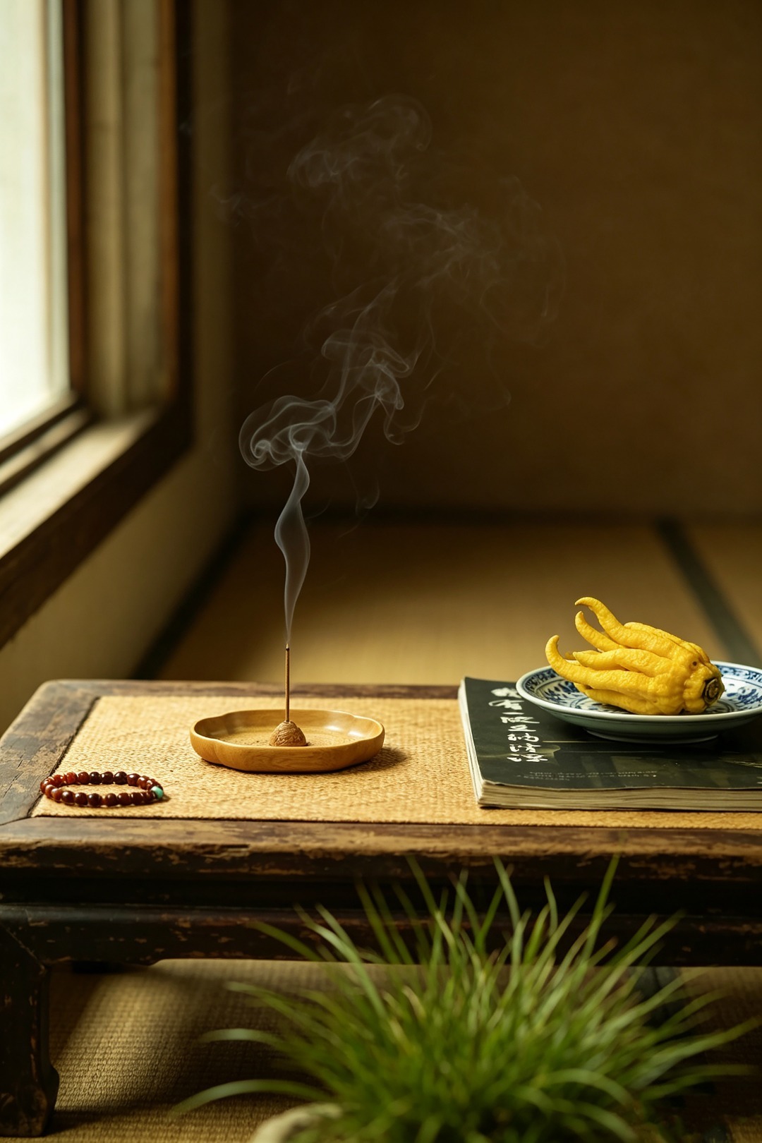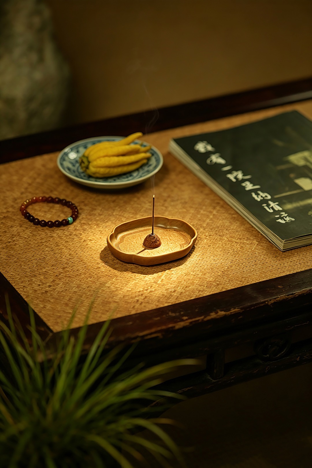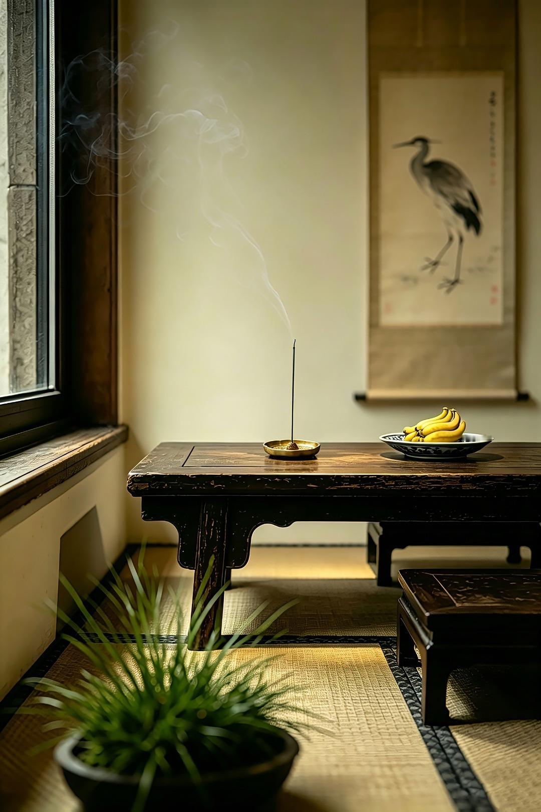 金丝楠整木掏制,雕刻宝相花纹,盘心磁石吸附,香插设计精妙,方便清灰。案几燃香造景,精致典雅。