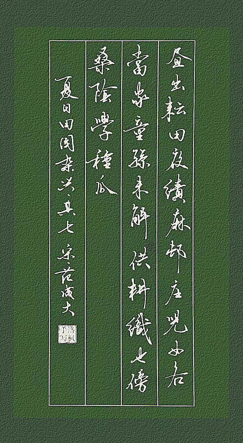 夏日田园杂兴·其七 宋代.范成大 昼出耘田夜绩麻,村庄儿女各当家。 童孙未解供耕织,也傍桑阴学种瓜。 古诗词诗词分享 传统文化手写文字