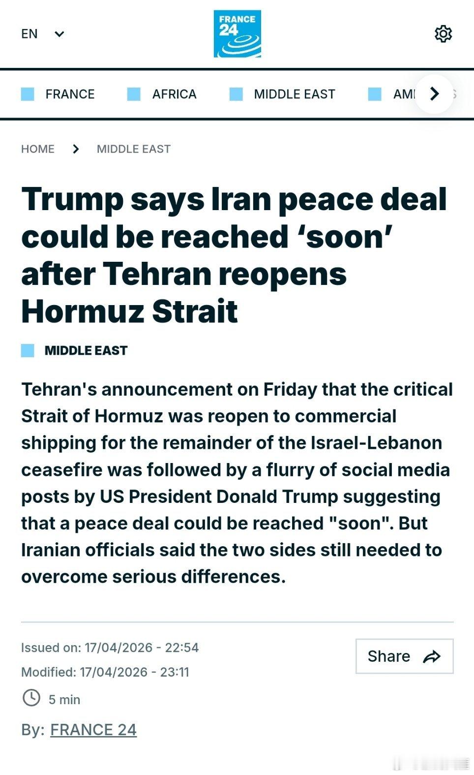 德黑兰周五宣布,在以色列和黎巴嫩停火期间,至关重要的霍尔木兹海峡将重新对商船开放。随后,美国总统唐纳德·特朗普在社交媒体上连发多条帖子,暗示和平协议可能很快达成。但伊朗官员表示,双方仍需克服严重分歧。(法国24新闻台)