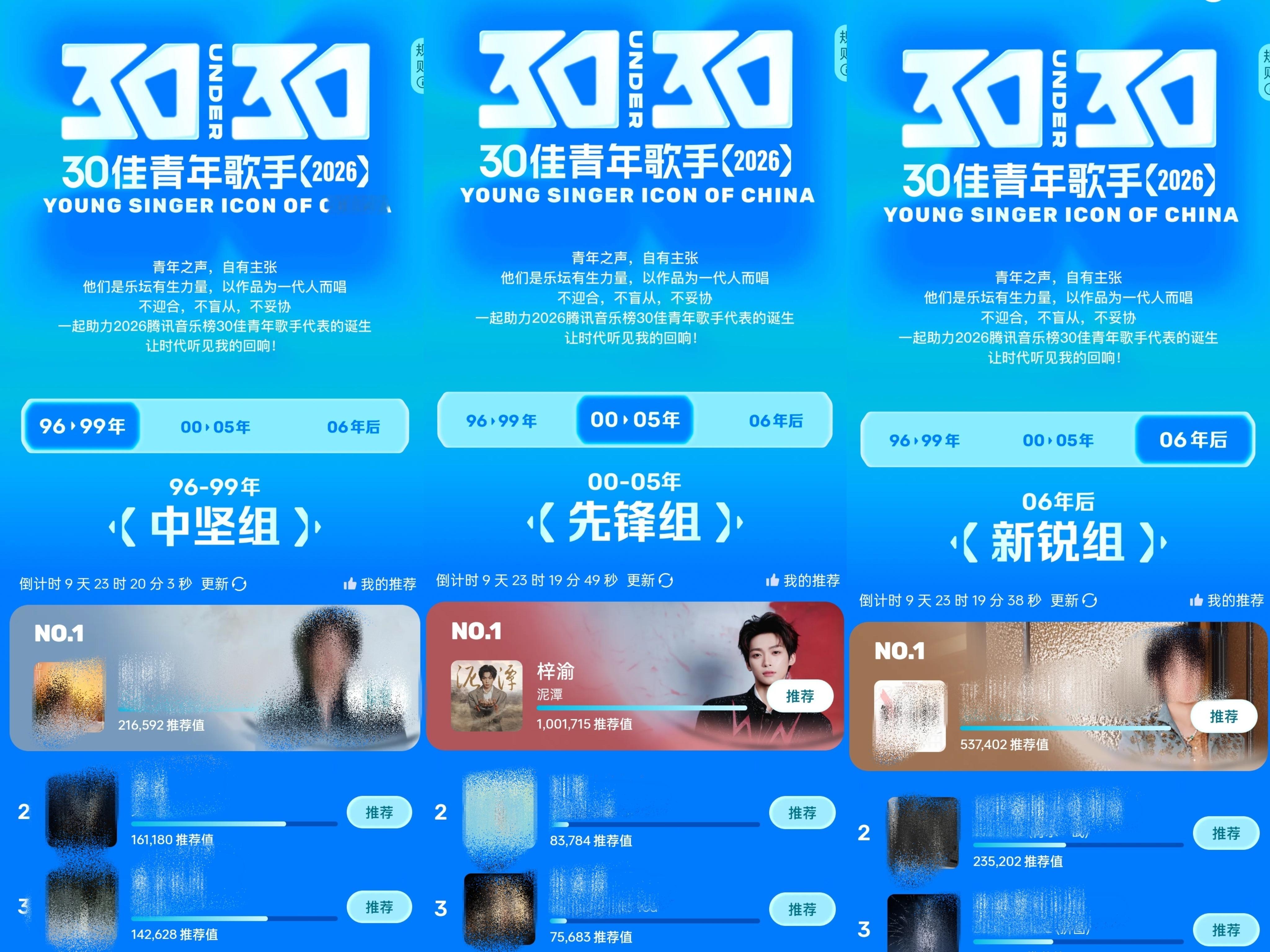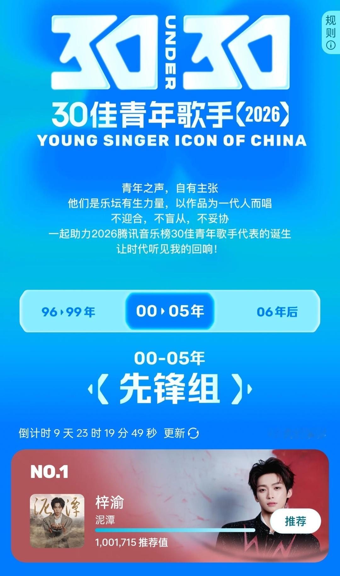 梓渝30佳青年歌手总榜TOP1梓渝「2026年30佳青年歌手」不到25小时推荐值已经突破一百万了💥中坚组+先锋组+新锐组三组总榜断层TOP1!梓渝30佳青年歌手推荐值破百万