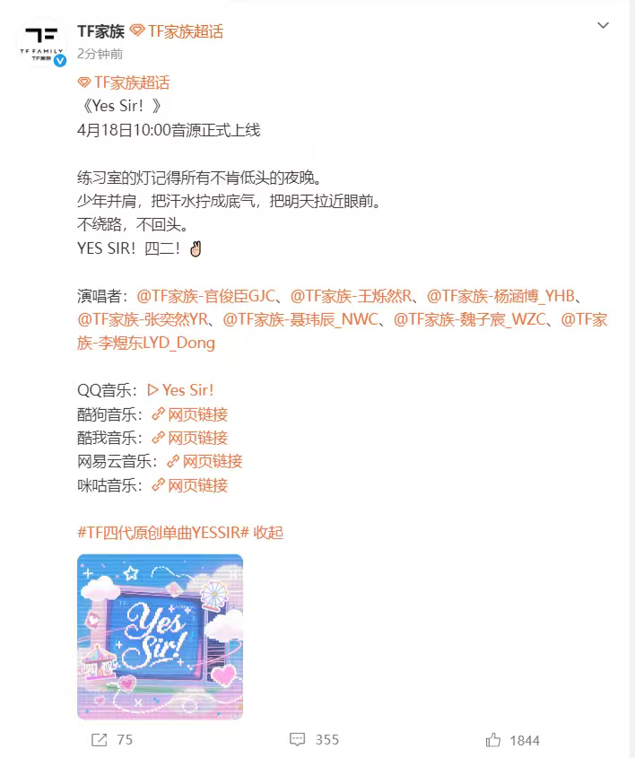 TF四代新歌YesSir上线 TF四代新歌《Yes Sir!》上线 新歌好听好听,期待少年们的新歌首秀舞台呀,我们下午见啦