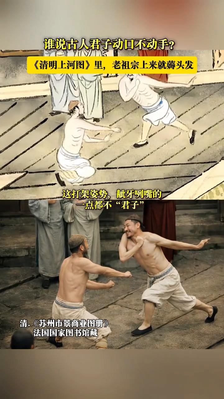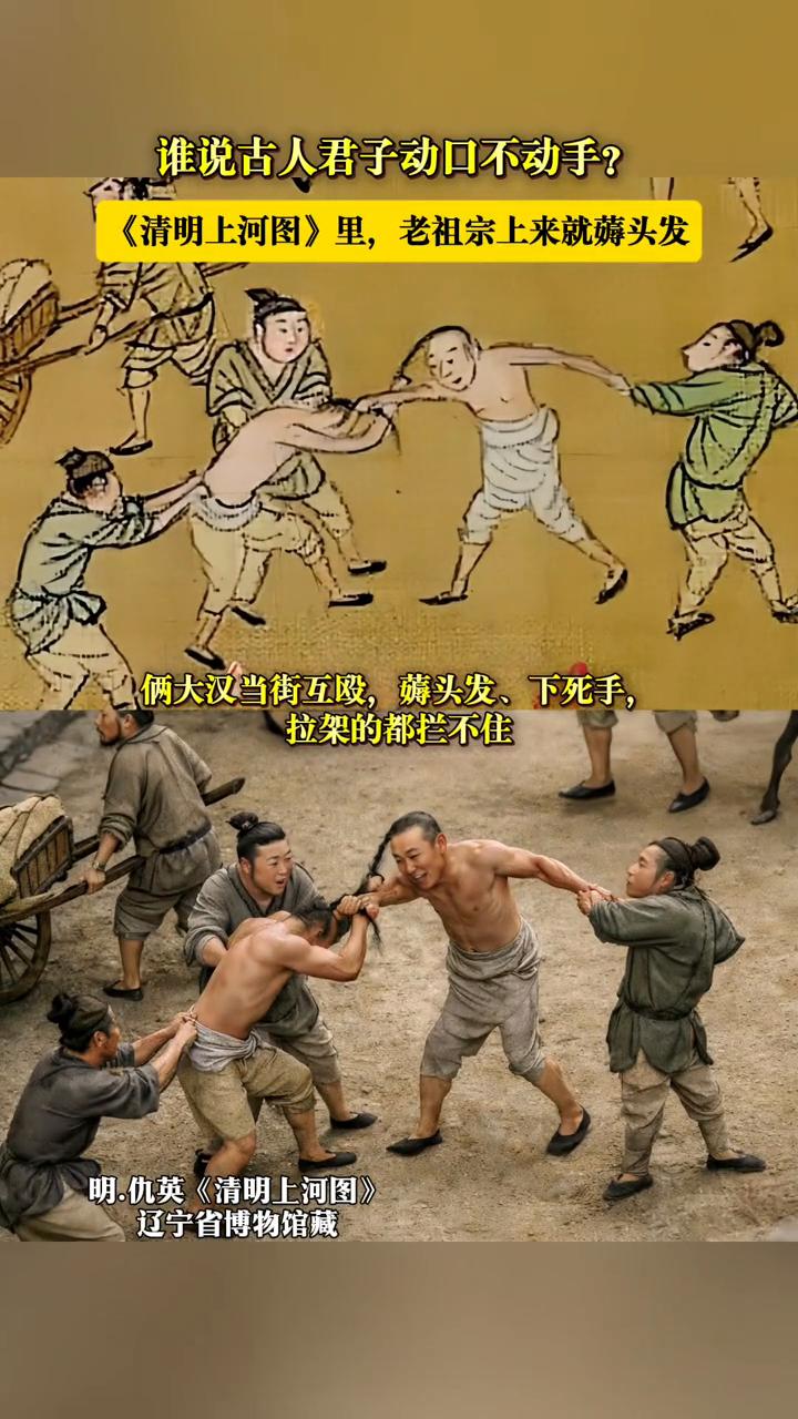 谁说古人君子动口不动手? ·明.仇英《清明上河图》,辽宁省博物馆藏。盲艺人也大打出手,批发、摔琴砸算盘,穷到这份儿还顾什么形象?先干赢再说。 ·明.吴伟《流民图》,大英博物馆藏。这打架姿势,献牙引嘴的,一点都不"君子"。 ·清.《苏州市景商业图册》,法国国家图书馆藏。两妇人起争执,对骂、捋袖动手。 ·明.张宏《杂技游戏图卷》,故宫博物院藏。