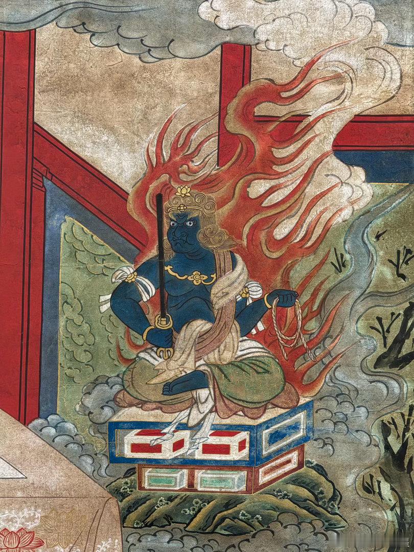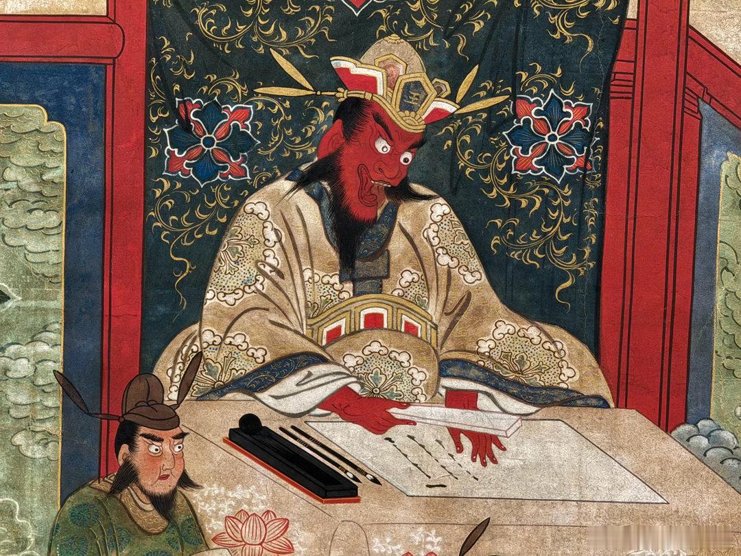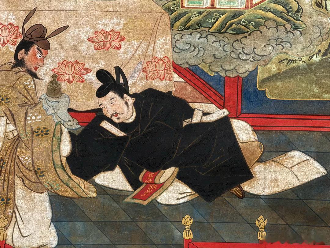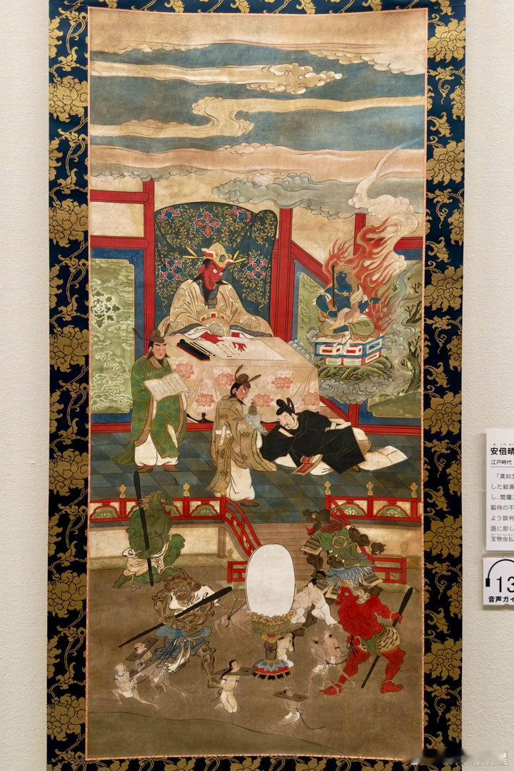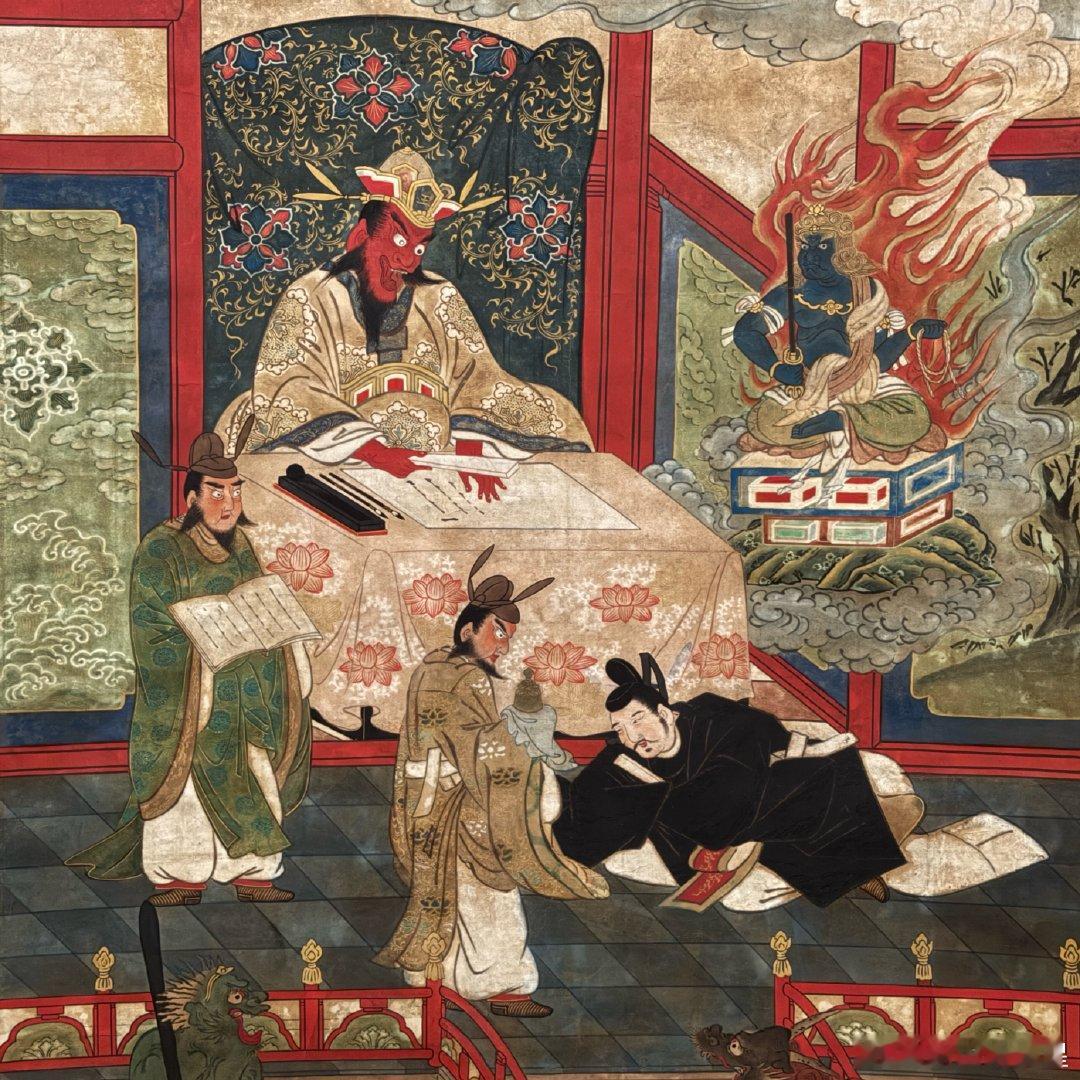京都龙谷博物馆春季特别展“京都真如堂的名宝”,昨天开幕,看到一件很有意思的作品,安倍晴明苏生图。说安倍晴明急病突然去世,来到阎王面前受审,不动明王听说之后,亲自降临地狱找阎王捞人回阳间,并请了五行印,说可保人八十五年寿命。图2是阎王,图3是不动明王,图5是安倍晴明在跪迎五行印。