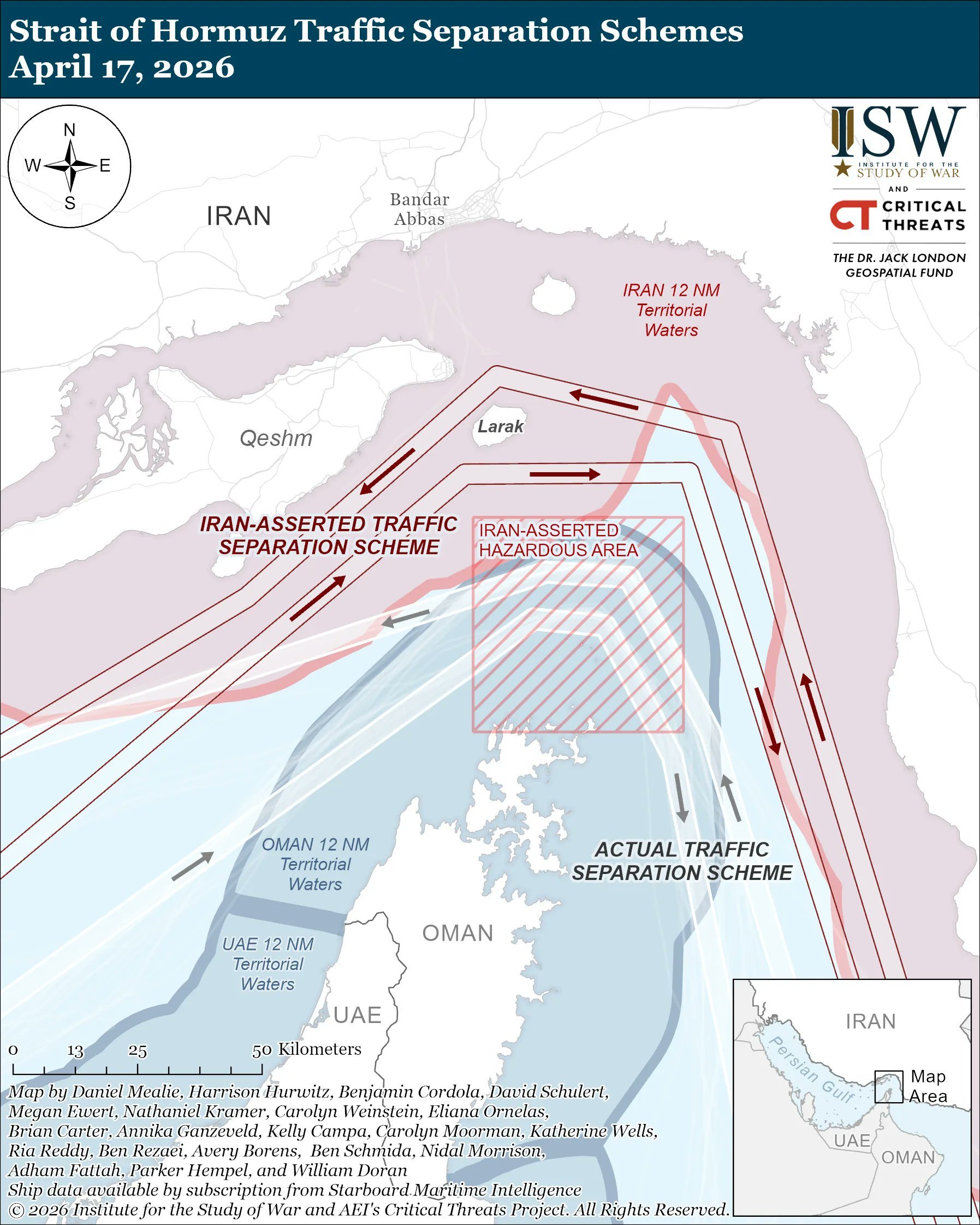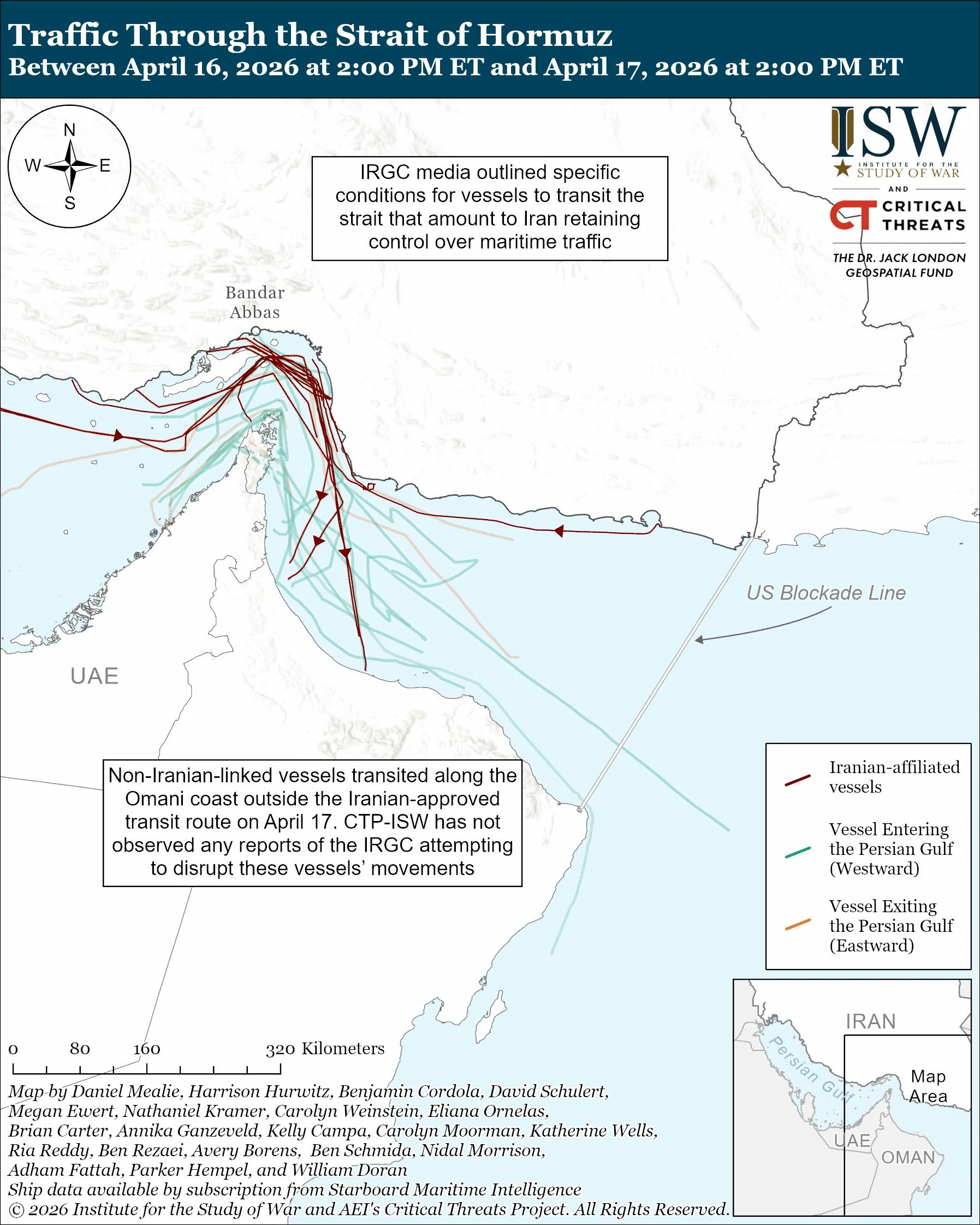战争研究所:最新消息:伊朗伊斯兰革命卫队(IRGC,伊朗军方实体,本轮冲突期间多次干扰霍尔木兹海峡航运)于4月17日出台了船舶通行该海峡的多项具体限制条件,此举实质意味着伊朗将掌控海峡海上航运的主导权。具体条款如下:1. 仅限与交战方无关联的民用商船通行;2. 所有船舶必须沿伊朗划定的专属航线、经由伊朗领海穿越海峡;3. 船舶通行需提前与伊朗军方协调报备。上述要求表明,伊朗革命卫队意在牢牢掌握海峡通航的实际管控权,大概率会持续将霍尔木兹海峡作为博弈筹码,逼迫美国作出让步。伊朗外交部长阿巴斯·阿拉克奇在社交平台X上宣称霍尔木兹海峡“完全开放”后,遭到革命卫队的严厉抨击。双方分歧凸显出伊朗政权内部日趋明显的派系对立,近几周,美国战争研究所(ISW)旗下关键威胁项目(CTP)已持续追踪报道该问题。商用海事监测数据显示,4月17日无伊朗关联船舶靠近美方封锁线。美方明确表态,一旦伊朗关联船舶越过封锁线,美军将采取军事行动。美国中央司令部于同日通报,已有19艘船舶遵照美方指令折返,暂无船只突破封锁。另有数据显示,部分无伊朗背景的船舶已靠近封锁线、驶离海峡水域。此类船只不在美方封锁管控范围内,可自由进出霍尔木兹海峡。