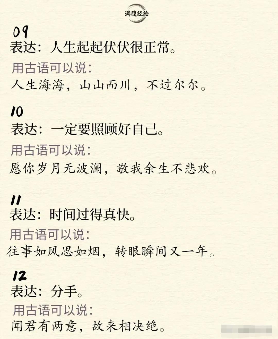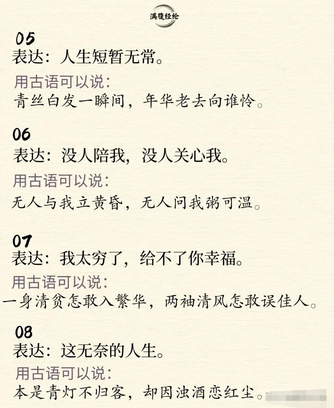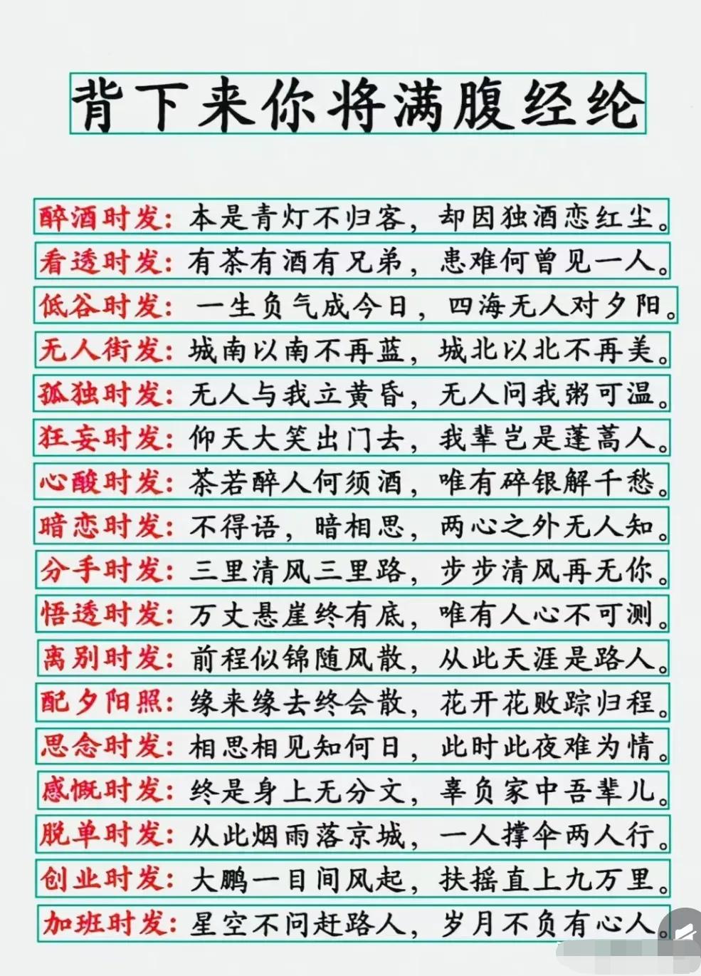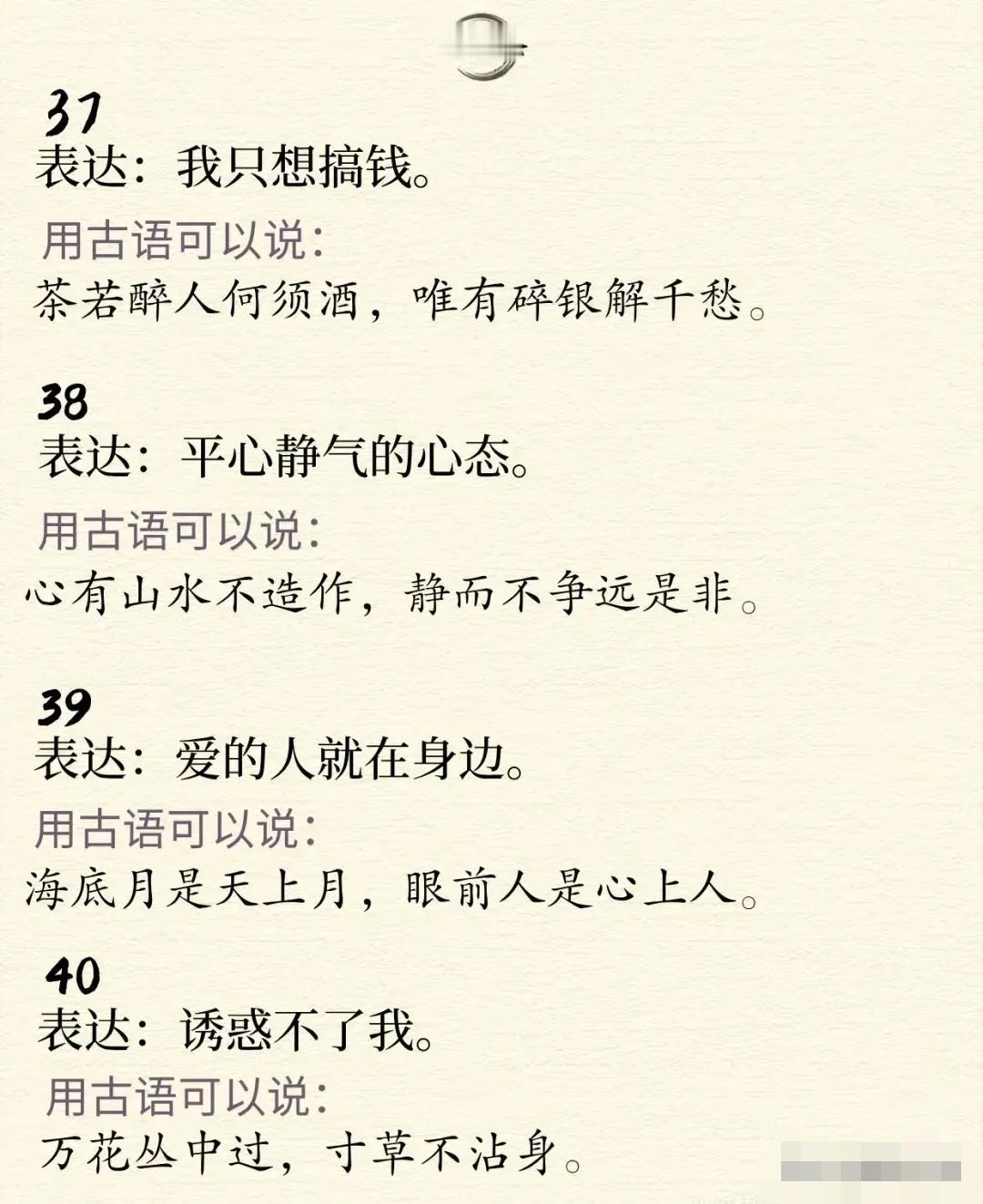 记住这些高级古风句,一开口就满腹经纶,气质直接拉满✨ 为什么别人说话高级有韵味,你一表达就词穷?老祖宗的文字里藏着顶级浪漫,背会这几句,你也能出口成章、惊艳众人。 青瓦长忆旧时雨,朱伞深巷无故人——道尽物是人非;飞鸟与鱼不同路,从此山水不相逢——写透一别两宽;从此烟雨落金城,一人撑伞两人行——藏着满心欢喜。 每一句都意境绝美,既有文化底蕴,又能精准表达情绪,发朋友圈、写作文、日常谈吐都能用。中华文化的魅力,就藏在这一字一句里。 你的谈吐里藏着星辰大海,腹有诗书气自华,记住这些句子,让自己温柔又有力量。赶紧收藏,慢慢品读,做个有风骨、有底蕴的人。