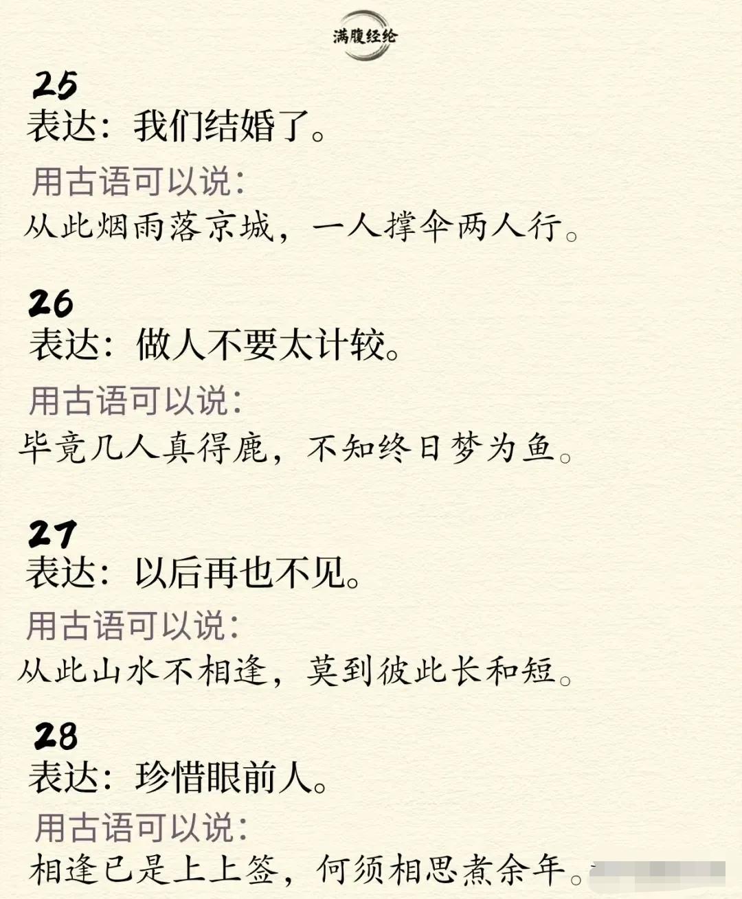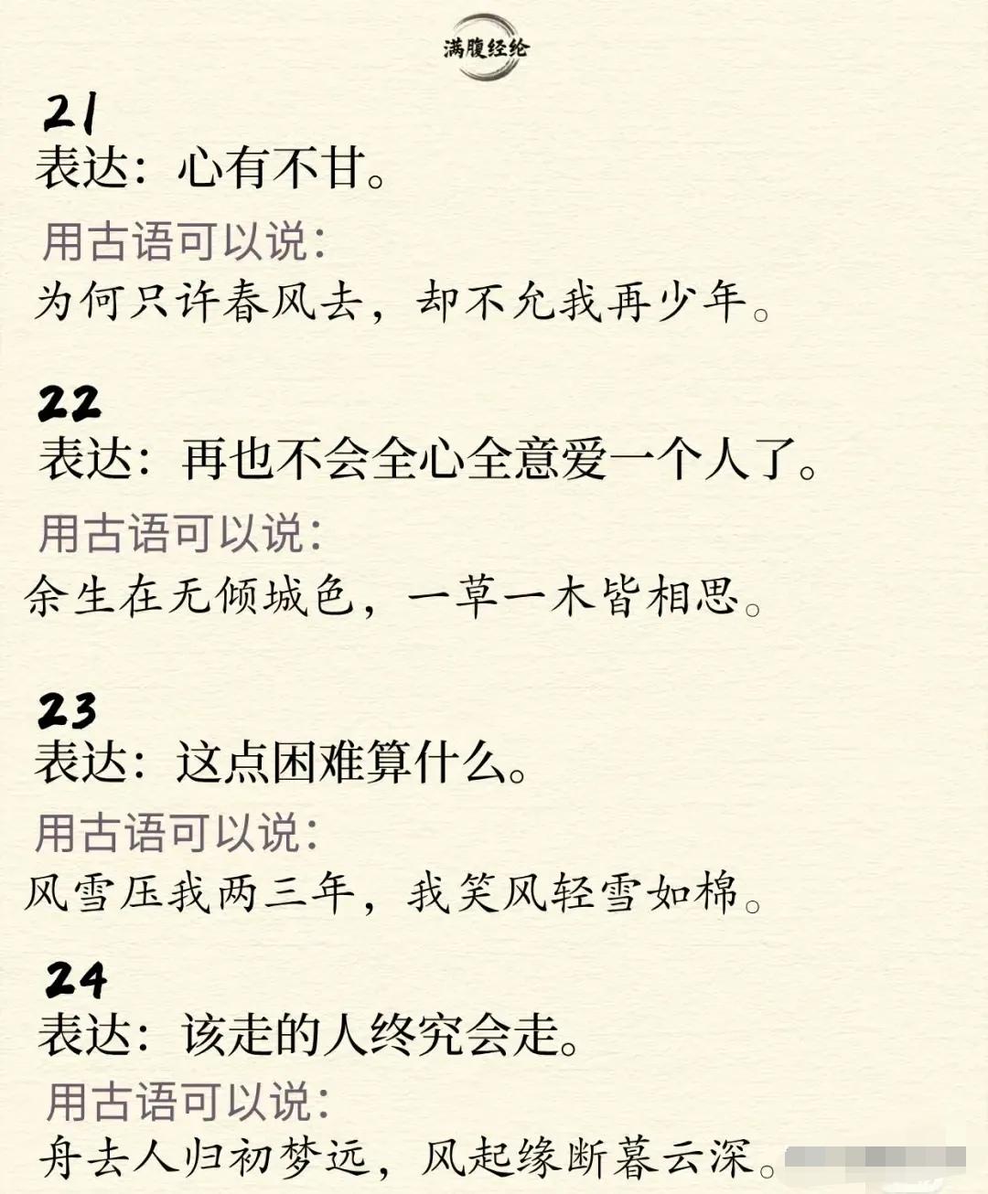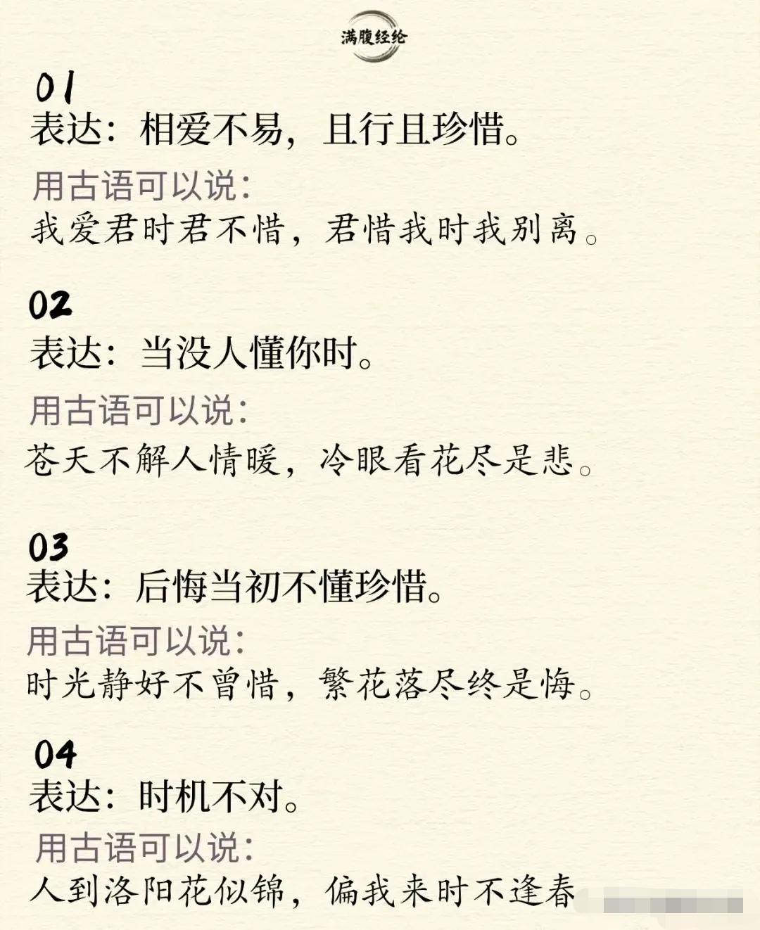 记住这些高级古风句,一开口就满腹经纶,气质直接拉满✨ 为什么别人说话高级有韵味,你一表达就词穷?老祖宗的文字里藏着顶级浪漫,背会这几句,你也能出口成章、惊艳众人。 青瓦长忆旧时雨,朱伞深巷无故人——道尽物是人非;飞鸟与鱼不同路,从此山水不相逢——写透一别两宽;从此烟雨落金城,一人撑伞两人行——藏着满心欢喜。 每一句都意境绝美,既有文化底蕴,又能精准表达情绪,发朋友圈、写作文、日常谈吐都能用。中华文化的魅力,就藏在这一字一句里。 你的谈吐里藏着星辰大海,腹有诗书气自华,记住这些句子,让自己温柔又有力量。赶紧收藏,慢慢品读,做个有风骨、有底蕴的人。
