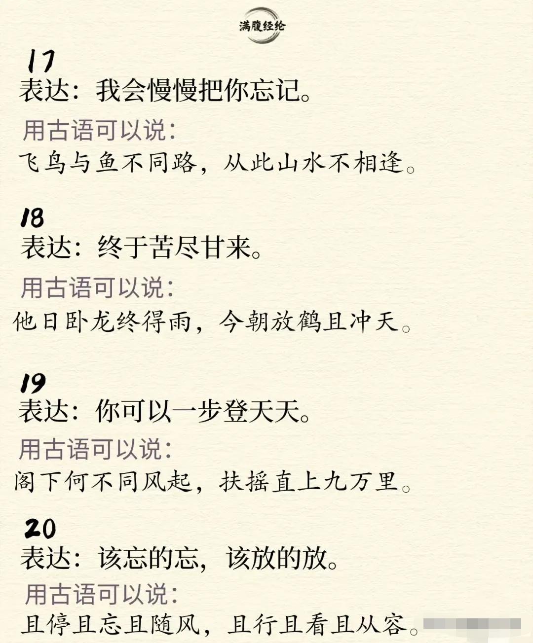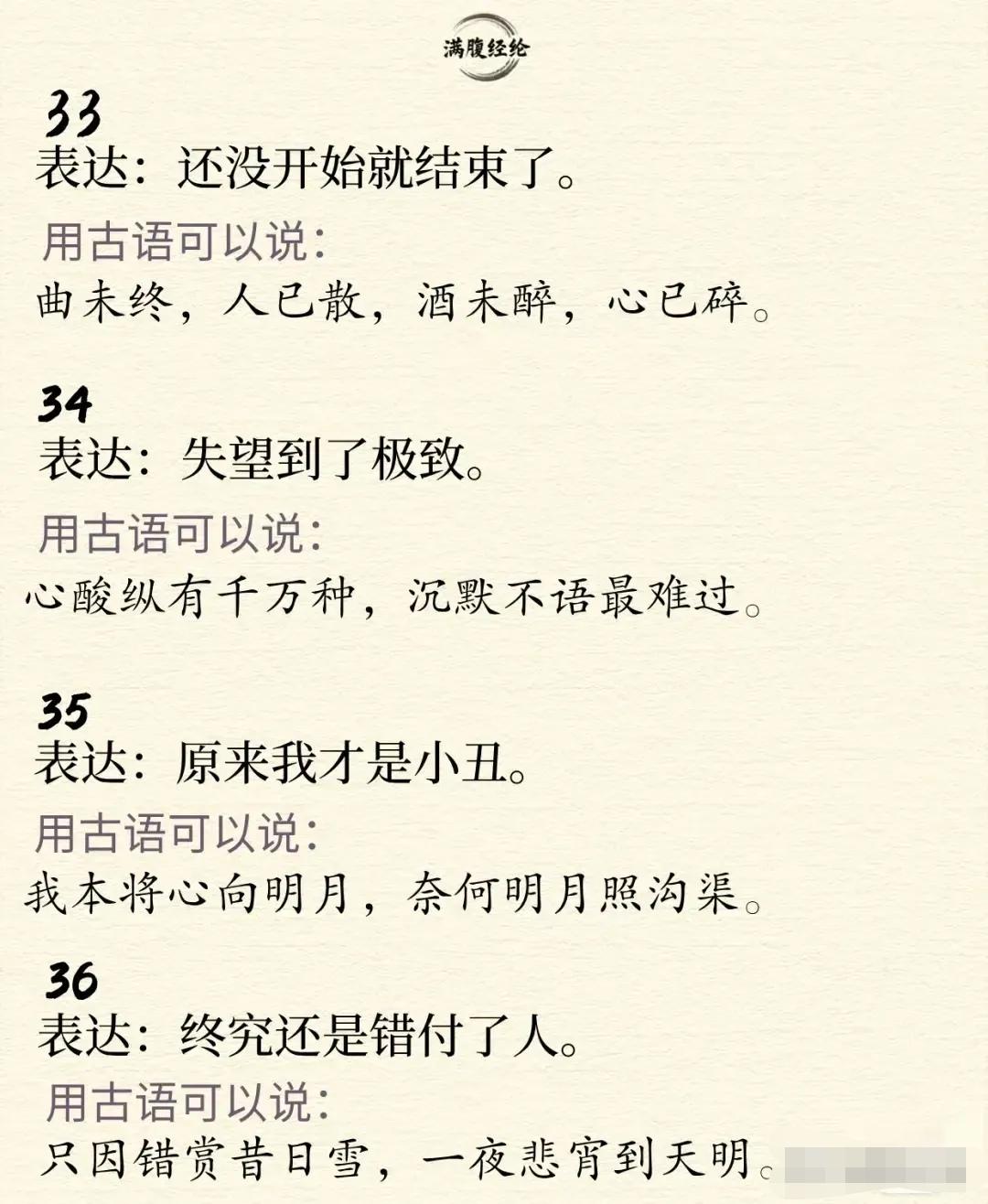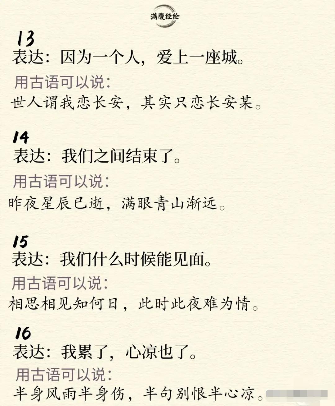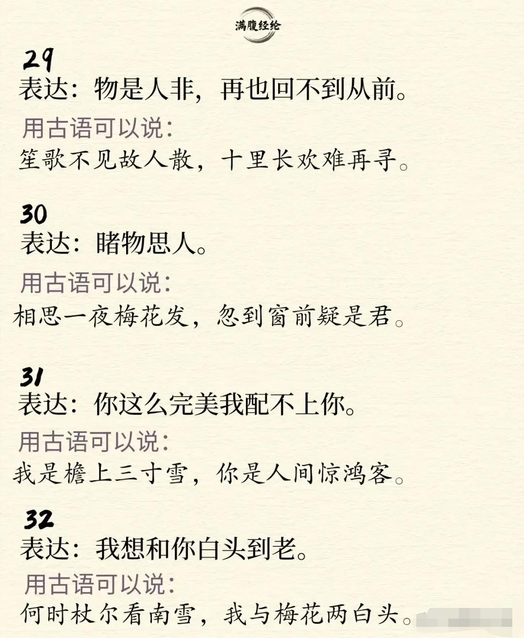 记住这些高级古风句,一开口就满腹经纶,气质直接拉满✨ 为什么别人说话高级有韵味,你一表达就词穷?老祖宗的文字里藏着顶级浪漫,背会这几句,你也能出口成章、惊艳众人。 青瓦长忆旧时雨,朱伞深巷无故人——道尽物是人非;飞鸟与鱼不同路,从此山水不相逢——写透一别两宽;从此烟雨落金城,一人撑伞两人行——藏着满心欢喜。 每一句都意境绝美,既有文化底蕴,又能精准表达情绪,发朋友圈、写作文、日常谈吐都能用。中华文化的魅力,就藏在这一字一句里。 你的谈吐里藏着星辰大海,腹有诗书气自华,记住这些句子,让自己温柔又有力量。赶紧收藏,慢慢品读,做个有风骨、有底蕴的人。