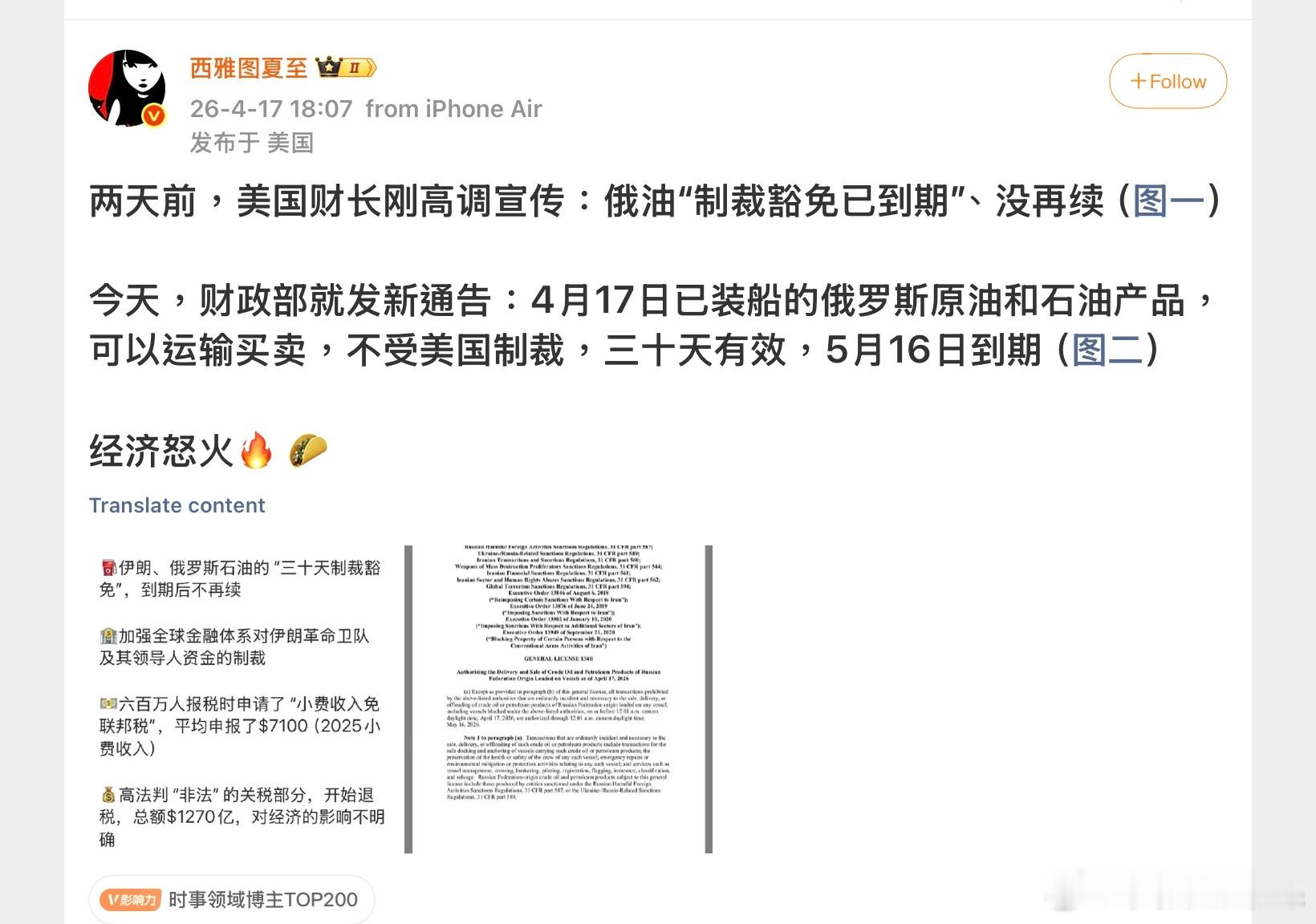4月17日,美國財政部頒布對俄油的豁免非常雞賊,只針對「已在海上運輸」或「4月17日前已裝船」的產品。這給了已經交易的買家一個「安全合規」的30天卸貨窗口,避免因為突然制裁導致大量油輪滯留海上,引發航運與能源市場的連鎖崩潰。與其說是打臉,不如說是美國在玩「開開關關」的博弈。